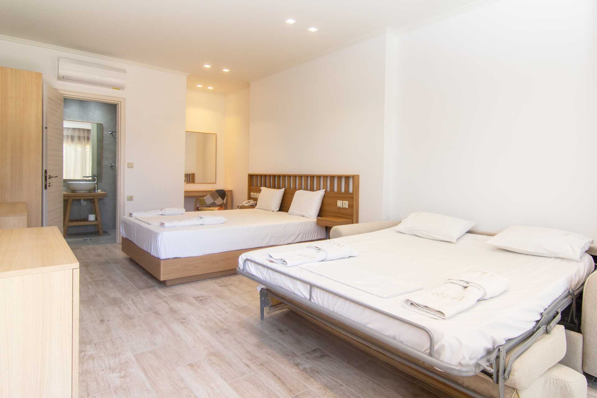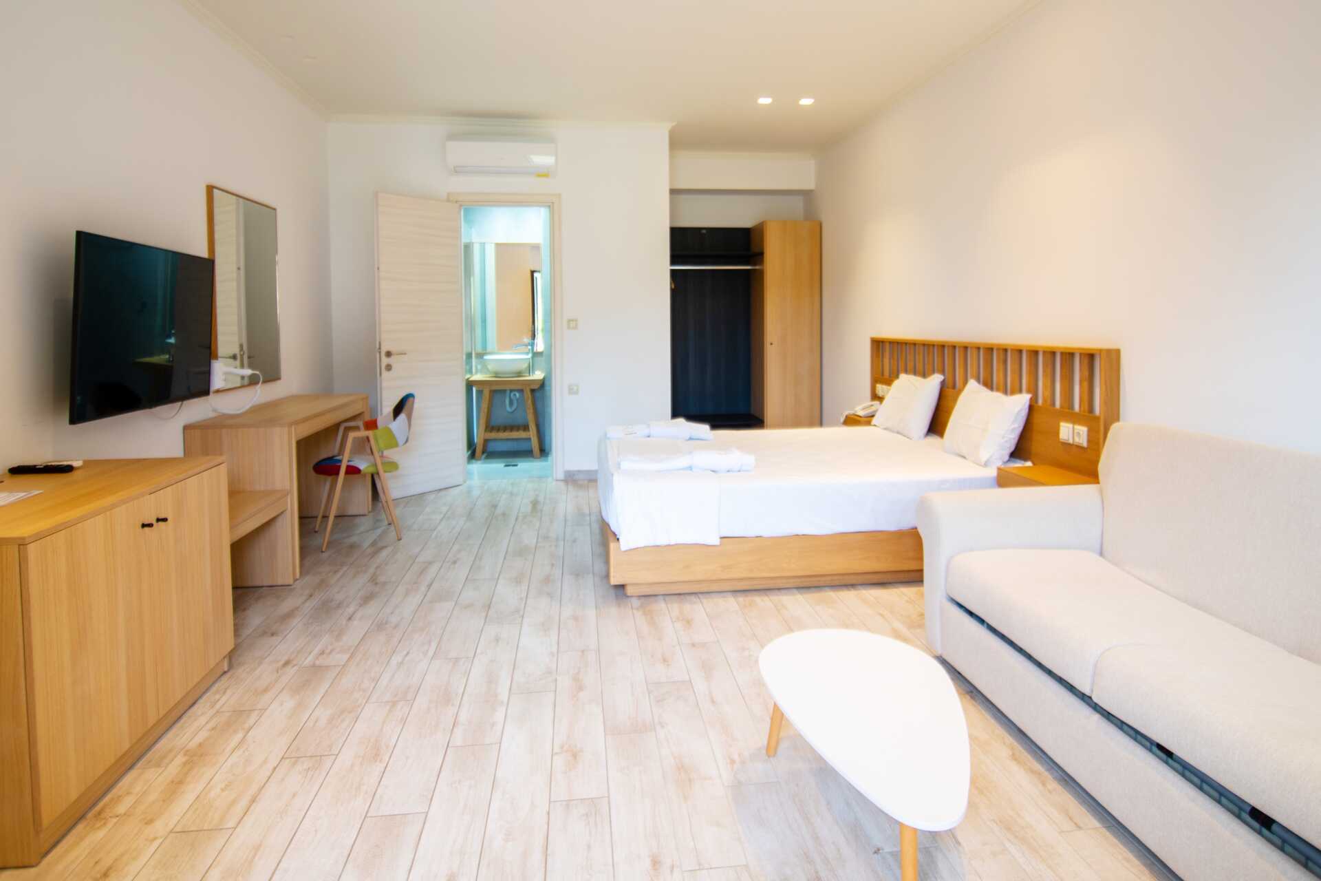 Svit med balkong. Ett sovrum med en dubbelsäng och ett vardagsrum med möjlighet till extrabäddar i bäddsoffa. Wifi, luftkonditionering och deponering ingår. Minibar. Tv med internationella kanaler. Hårtork. Badrum med dusch och wc. Städning 6 ggr/vecka.