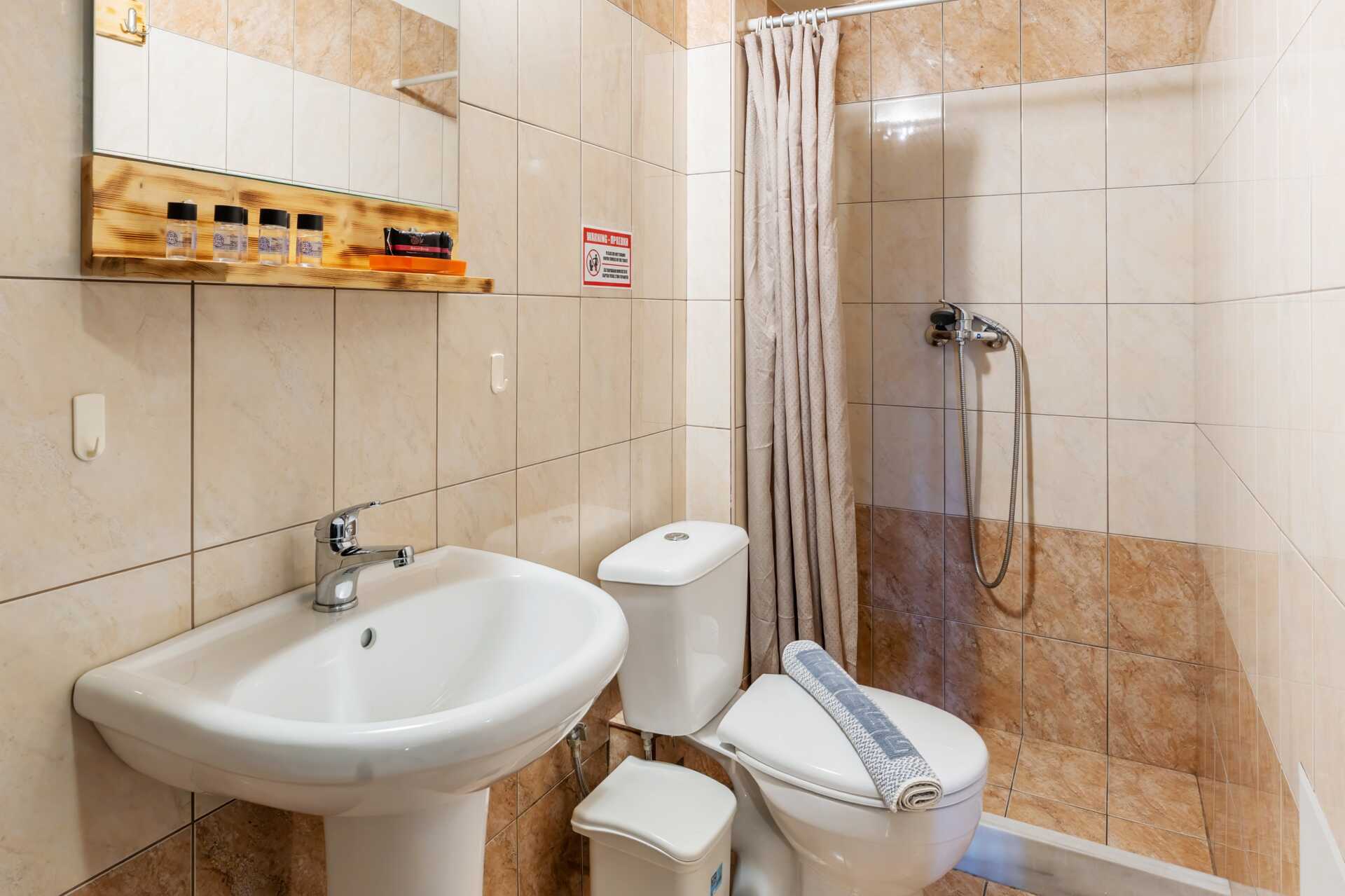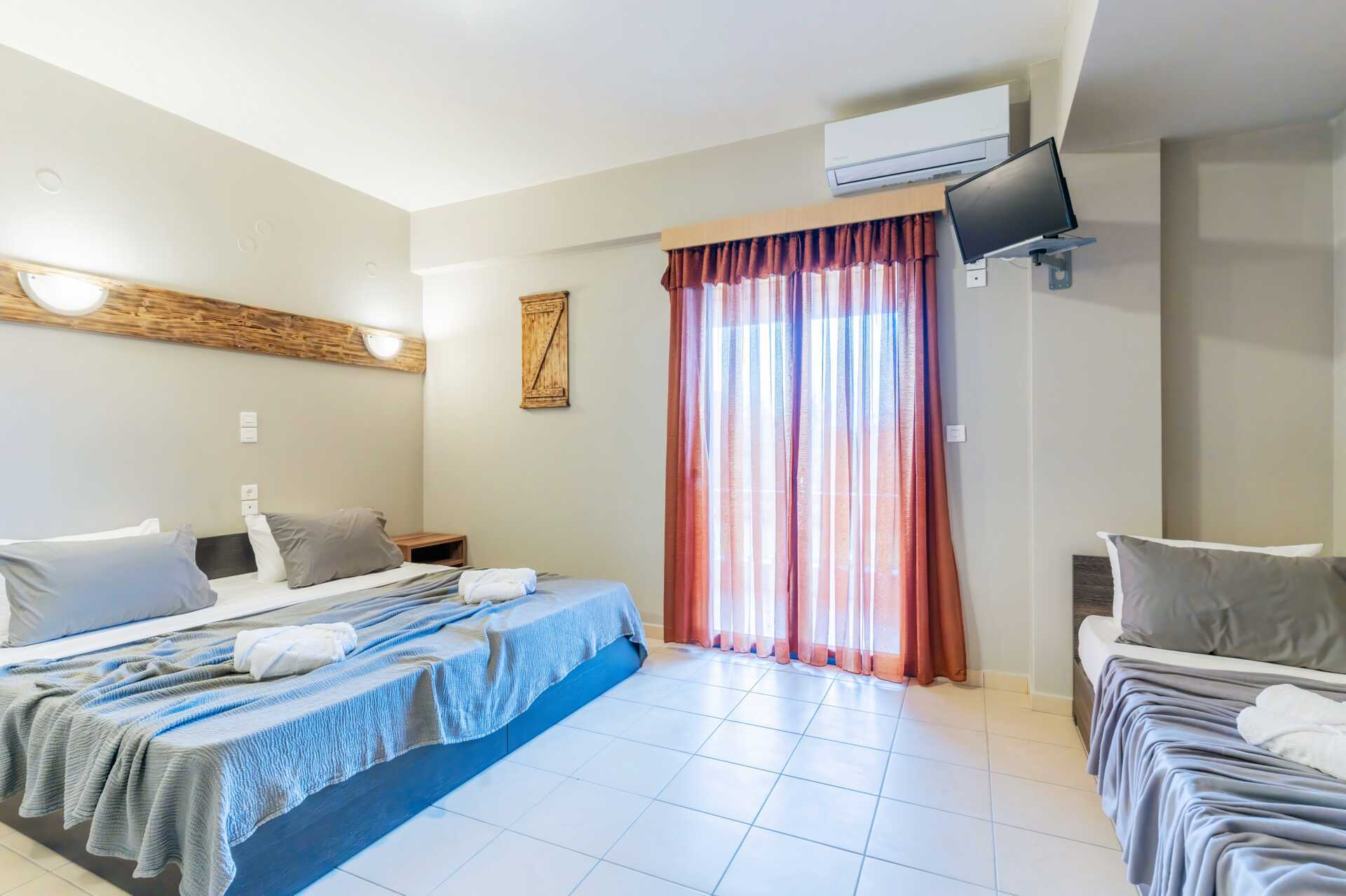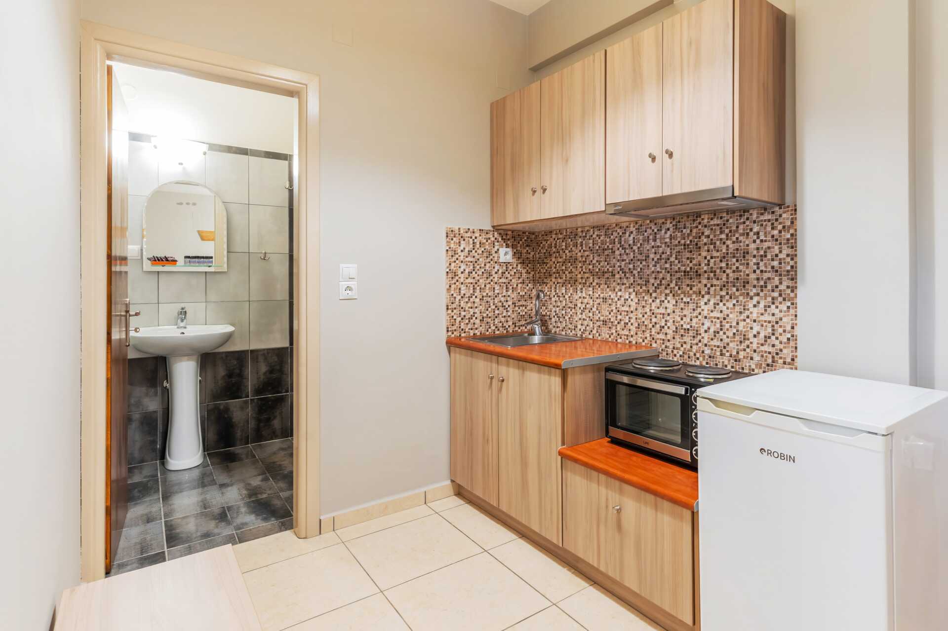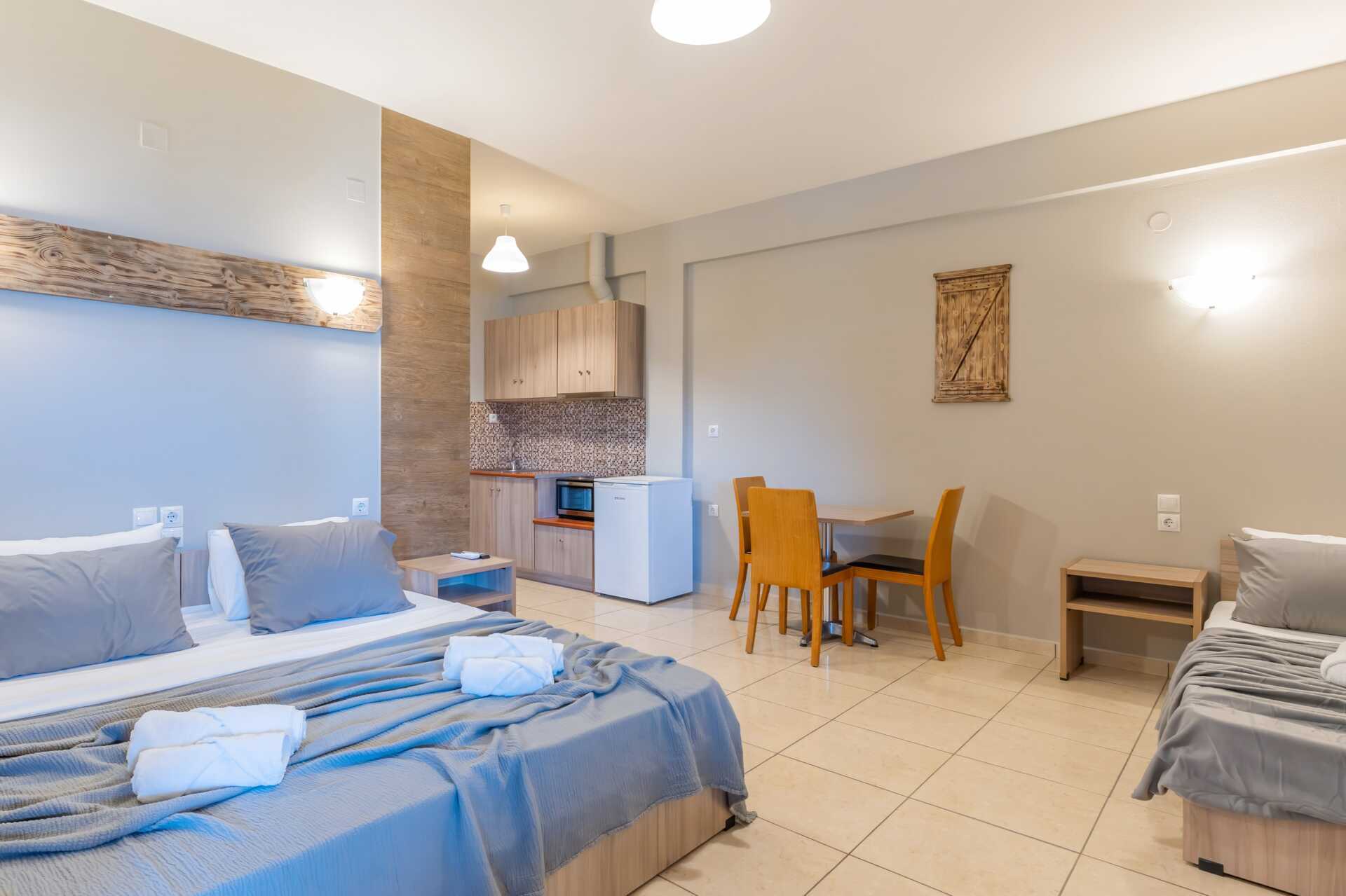 Enrumslägenhet med balkong. Sovrum med kombinerat minikök. En dubbelsäng eller två enkelsängar. Möjlighet till extrabädd i enkelsäng. Minikök med kylskåp, kokplattor, vattenkokare och enkel köksutrustning. Wifi, luftkonditionering och deponering ingår. Tv med lokala kanaler. Hårtork. Badrum med dusch och wc. Städning 5 ggr/vecka.