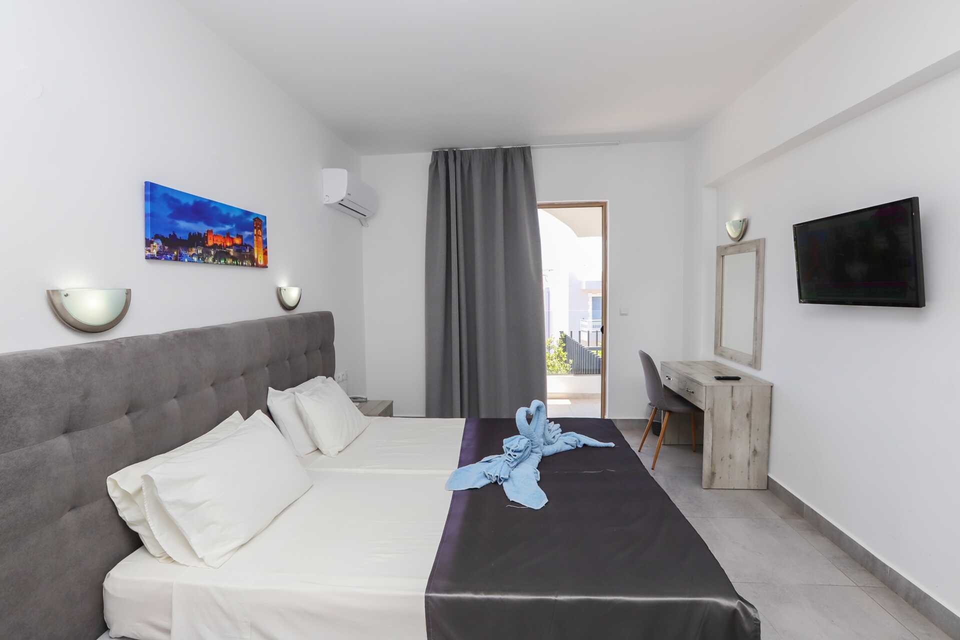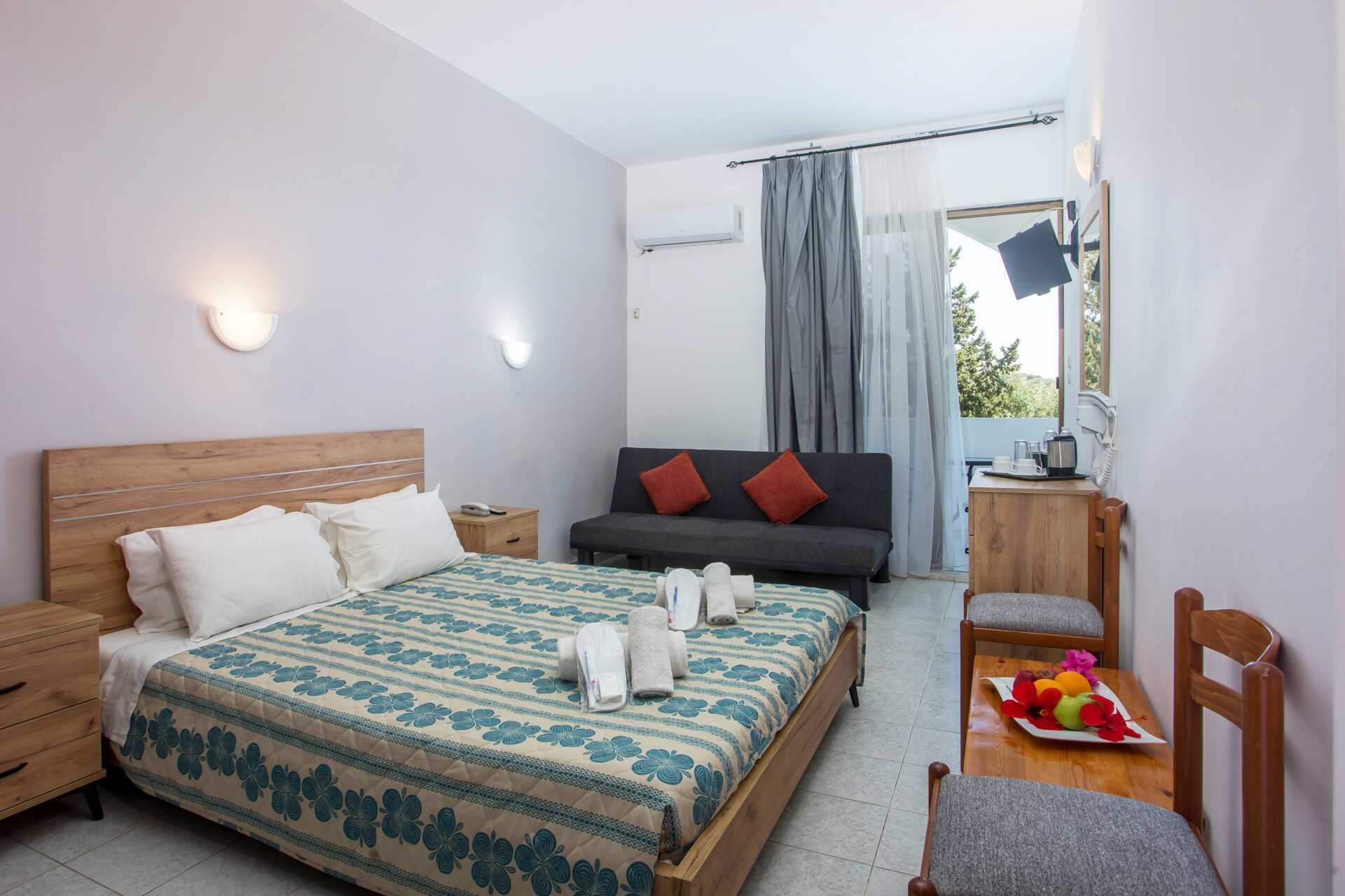Dubbelrum med balkong eller terrass. En dubbelsäng eller två enkelsängar. Möjlighet till extrabädd i bäddsoffa. Wifi, luftkonditionering och deponering ingår. Kylskåp och vattenkokare. Tv med internationella kanaler. Hårtork. Badrum med dusch samt wc. Städning 6 ggr/vecka.