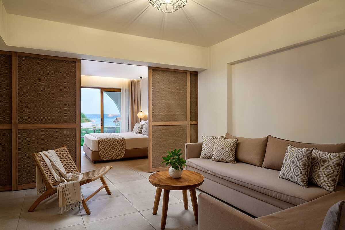 Dubbelrum med balkong eller terrass, vissa med begränsad havsutsikt alternativt med balkong. Rummen för upp till tre personer och med balkong ligger i byggnaden vid vattenlandet. En dubbelsäng eller två enkelsängar. Möjlighet till extrabädd i bäddsoffa. Wifi, luftkonditionering och deponering ingår. Kylskåp. Vattenkokare. Tv med internationella kanaler. Hårtork. Badrum med dusch och wc. Städning 7 ggr/vecka.