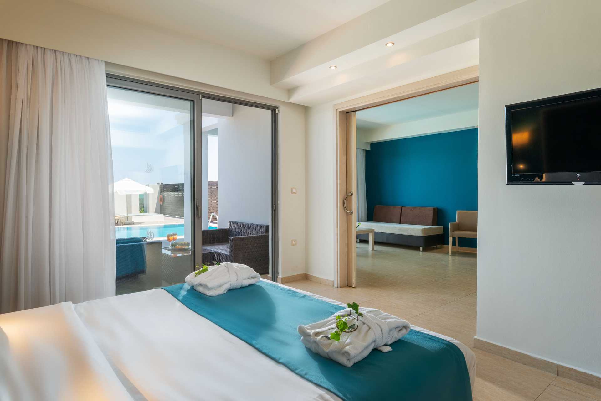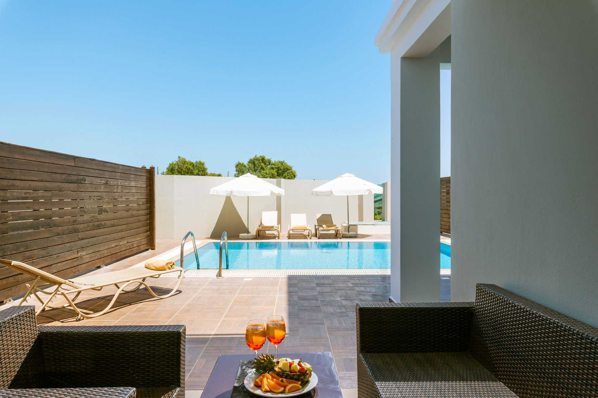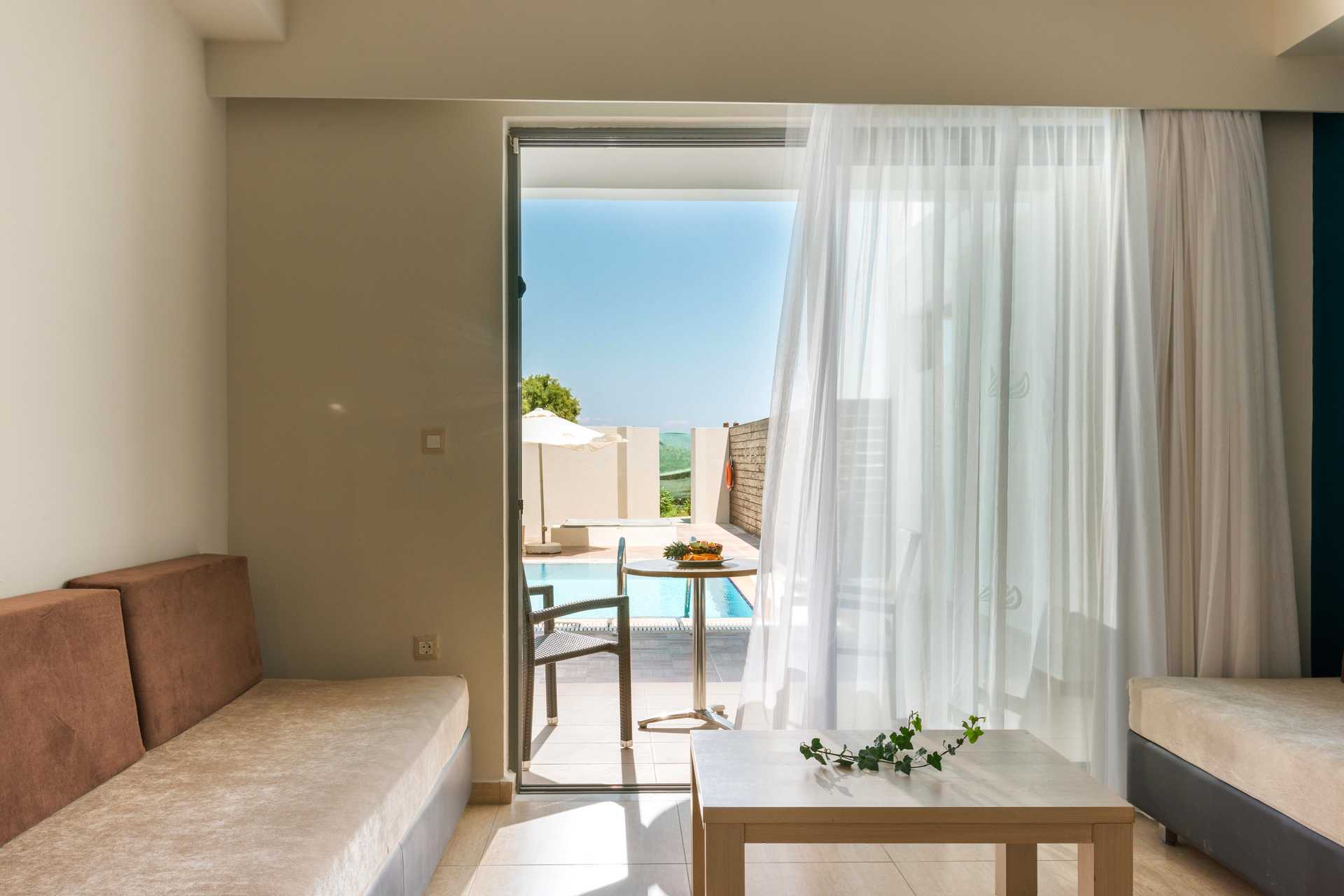 Familjerum med uteplats och privat pool. På uteplatsen finns bekväma loungemöbler och solstolar. En sovrumsdel och en vardagsrumsdel som kan separeras av en skjutdörr. En dubbelsäng. Möjlighet till extrabäddar i bäddsoffor. Wifi, luftkonditionering och deponering ingår. Kylskåp. Vattenkokare. Tv med internationella kanaler. Hårtork. Badrum med badkar eller dusch samt wc. Städning 7 ggr/vecka.