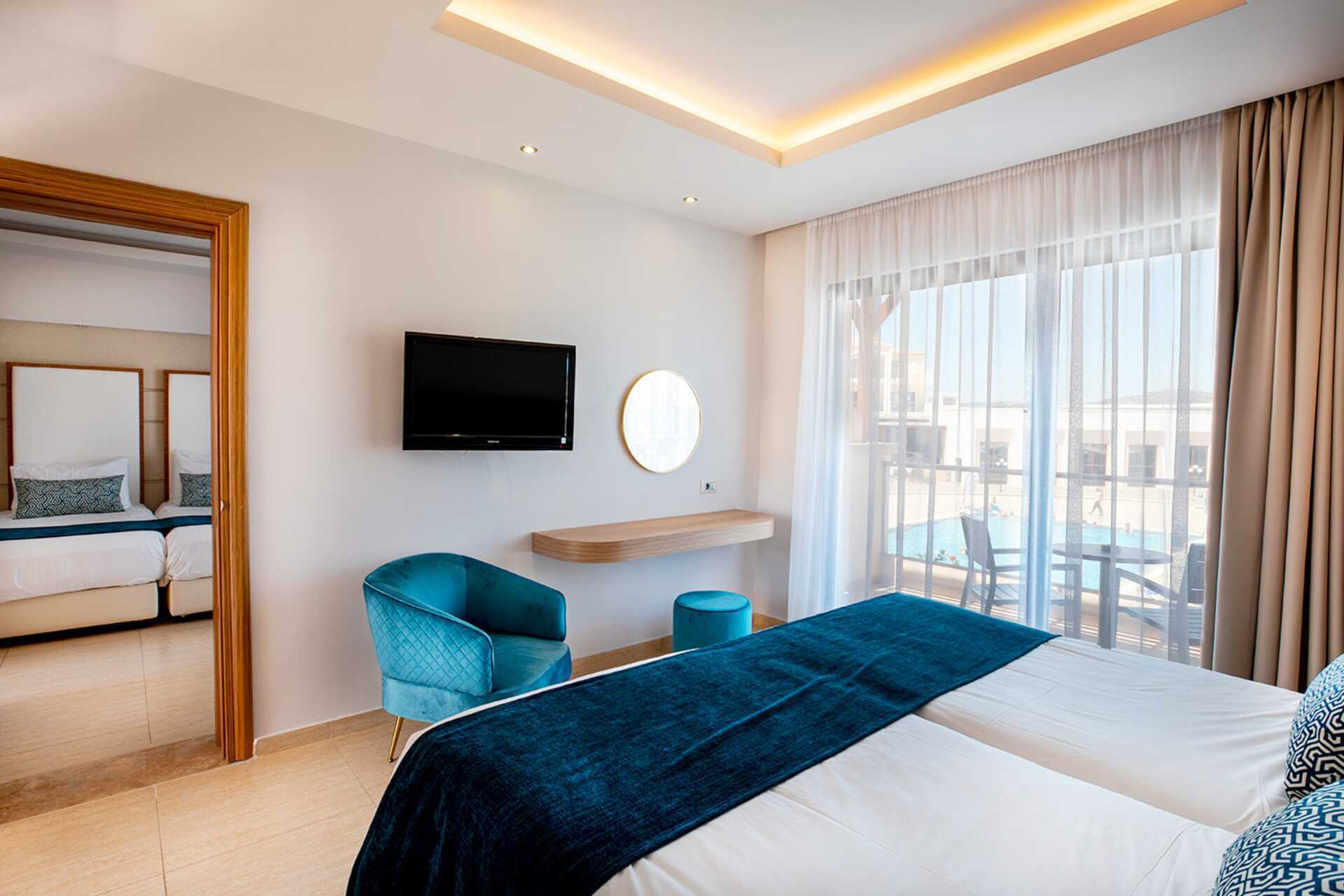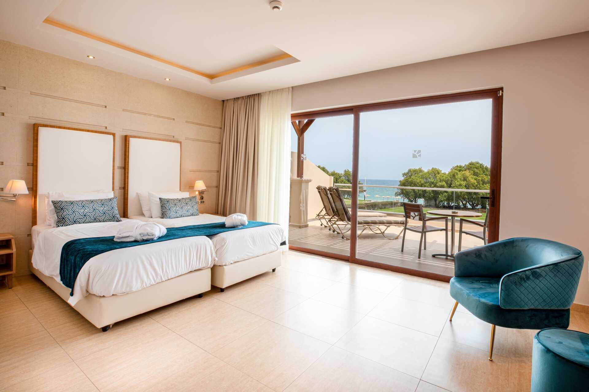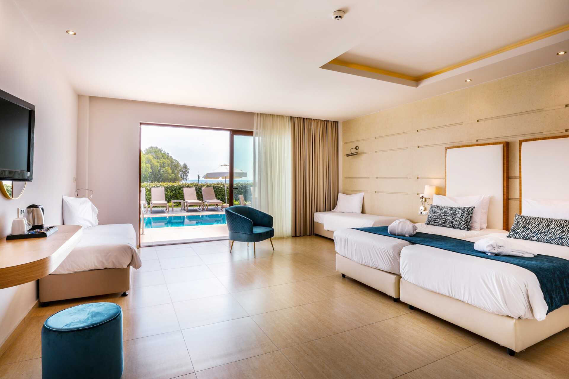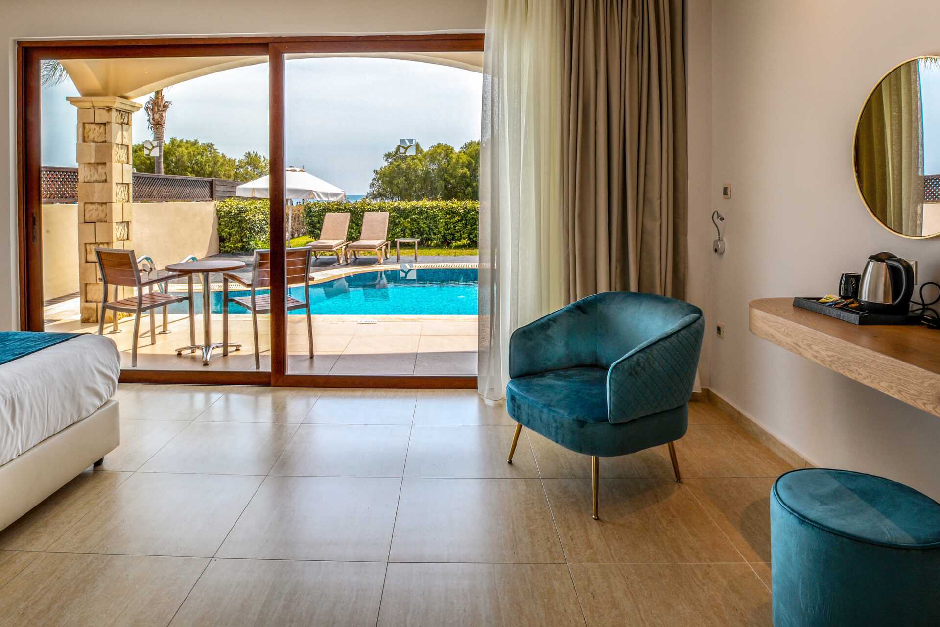 Juniorsvit med privat pool och begränsad havsutsikt från markterrassen. På terrassen finns solstolar och parasoll samt bord och stolar. Två enkelsängar. Möjlighet till extrabäddar i två bäddsoffor. Wifi, deponering och luftkonditionering ingår. Luftkonditioneringen är centralstyrd och sätts på vid behov (kan då regleras i juniorsviten). Kylskåp. Vattenkokare samt kaffe och te. Tv med internationella kanaler. Hårtork. Badrum dusch och wc. Städning 7 ggr/vecka, varav en dag med enklare städning.