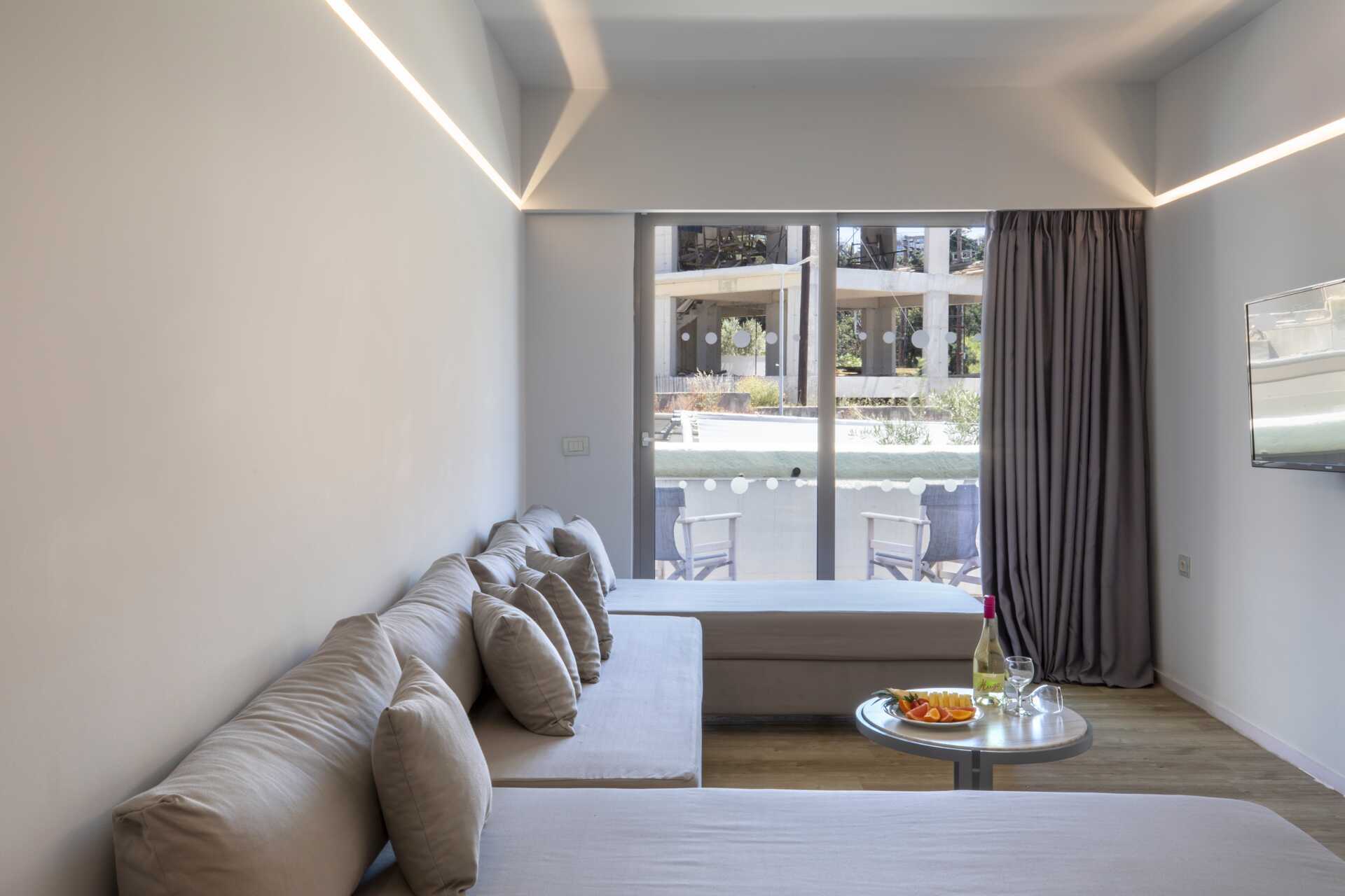 Familjerum med balkong. Rummen ligger i hotellets sidobyggnad. Ett sovrum och ett vardagsrum. En dubbelsäng i sovrummet och möjlighet med tre extrabäddar i tre bäddsoffor. Wifi, luftkonditionering och deponering ingår. Minibaren på rummet ingår, fylls dagligen på med vin, öl, läsk, juice och vatten. Vattenkokare samt kaffe och te. Tv med internationella kanaler. Tofflor. Hårtork. Badrum med dusch och wc. Städning 7 ggr/vecka.