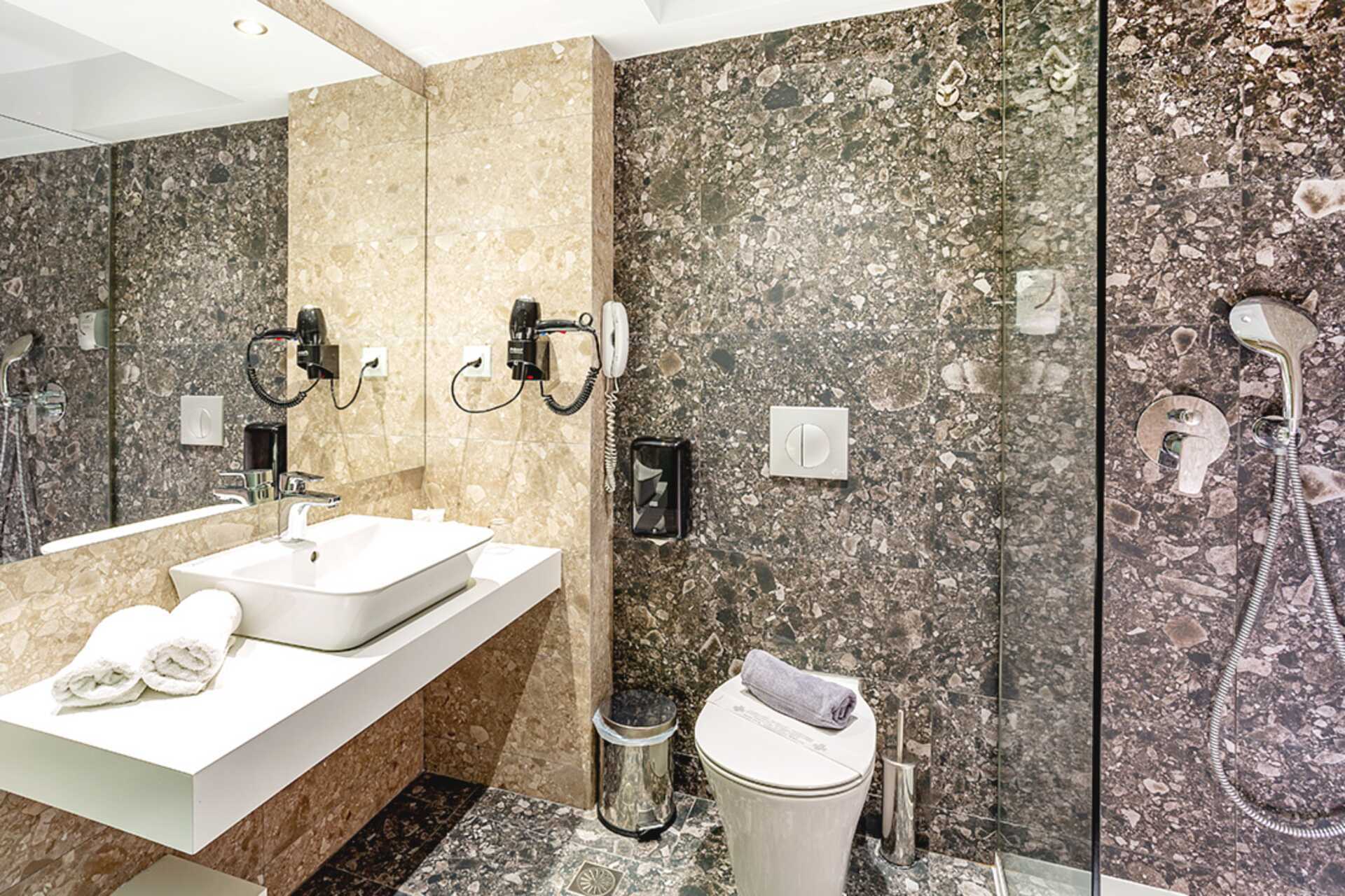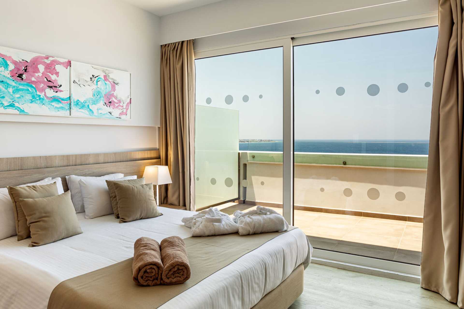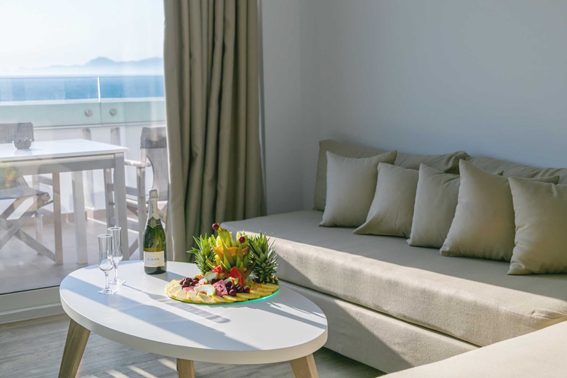 Svit med balkong. Vissa balkonger med havsutsikt och vissa med begränsad havsutsikt. Ett sovrum med en dubbelsäng och ett vardagsrum med möjlighet till två extrasängar i två bäddsoffor. Wifi, luftkonditionering och deponering ingår. Minibaren på rummet ingår, fylls dagligen på med vin, öl, läsk, juice och vatten. Vattenkokare samt kaffe och te samt en Nespresso kaffemaskin. Tv med internationella kanaler. Tofflor. Hårtork. Badrum med badkar eller dusch samt wc. Städning 7 ggr/vecka.