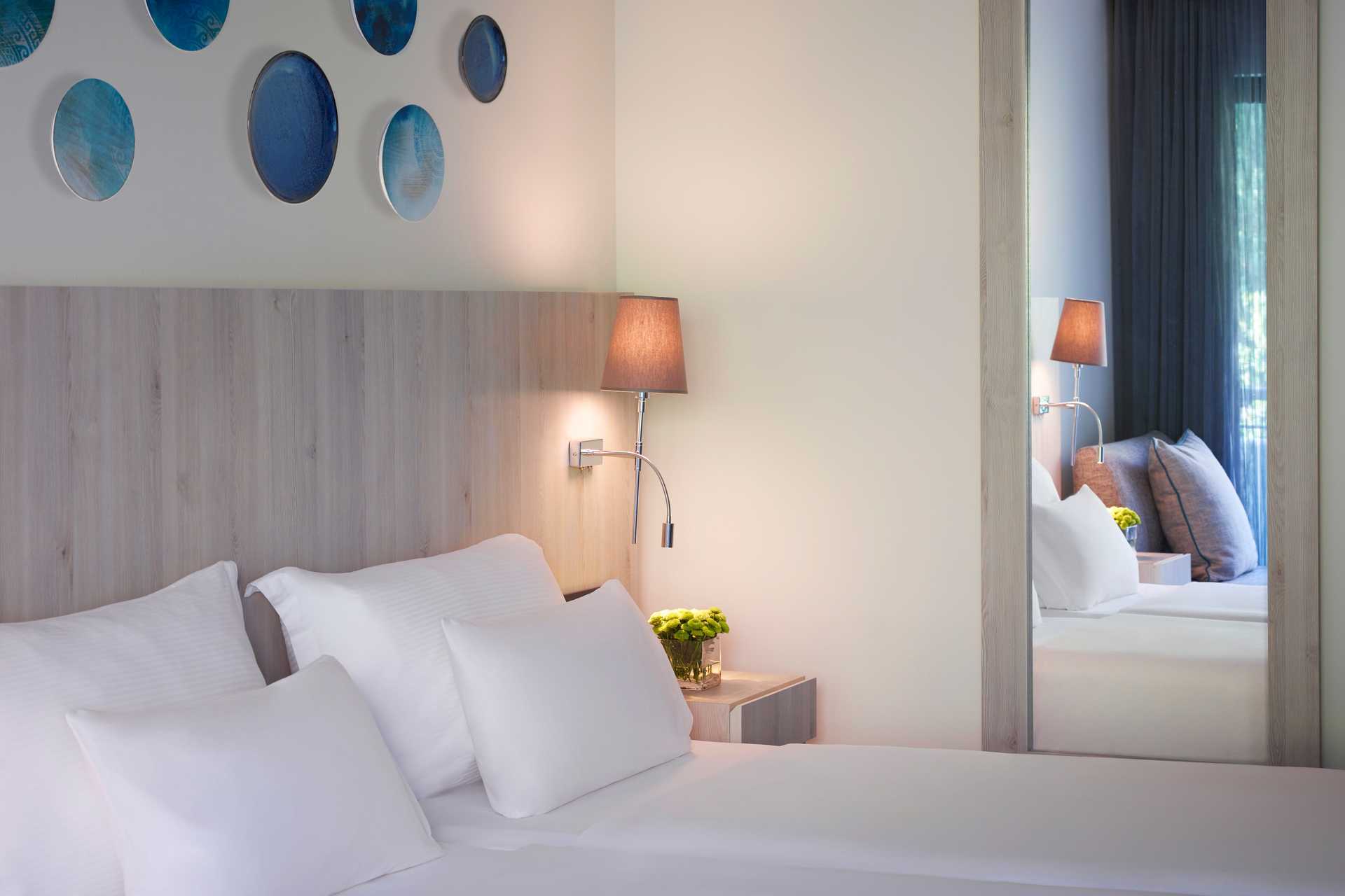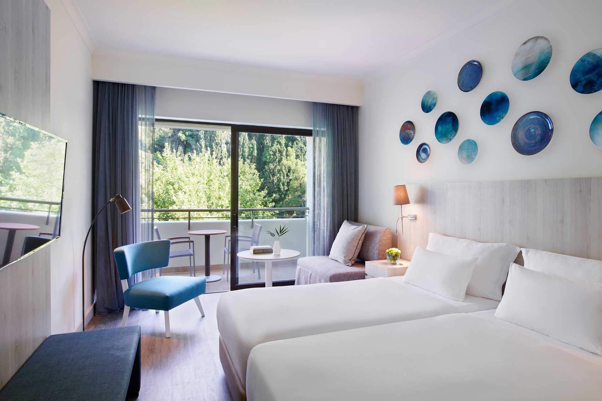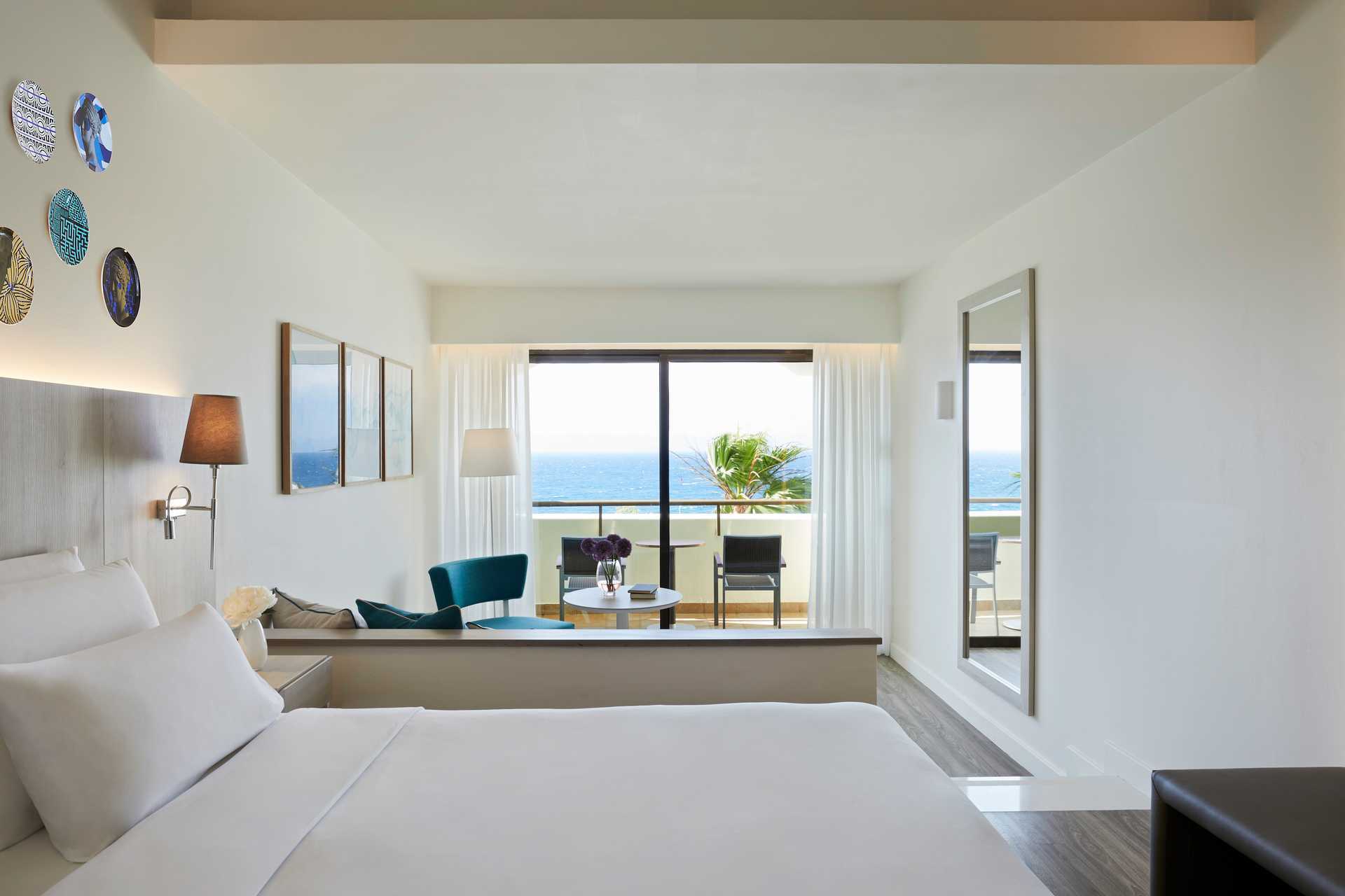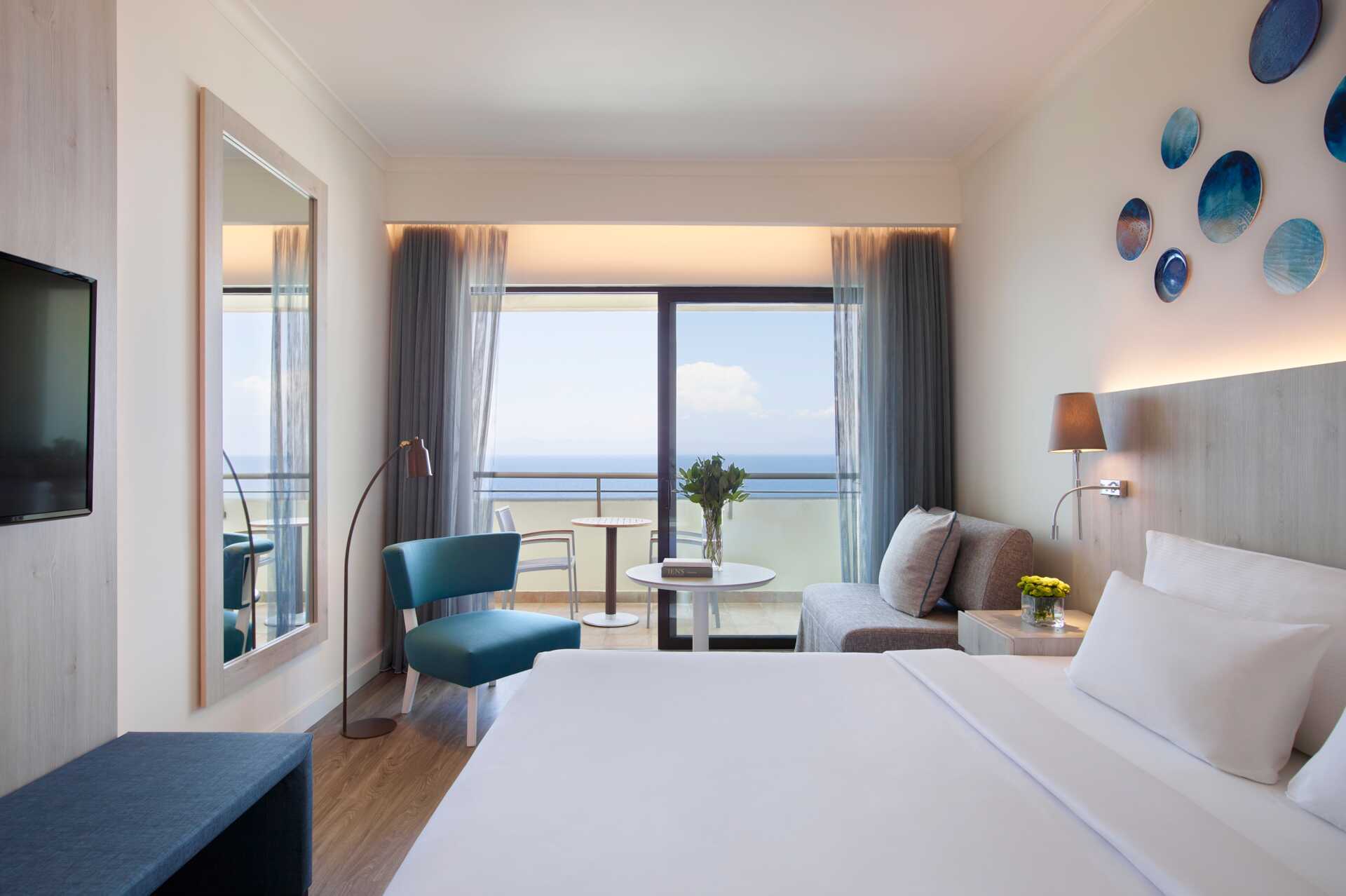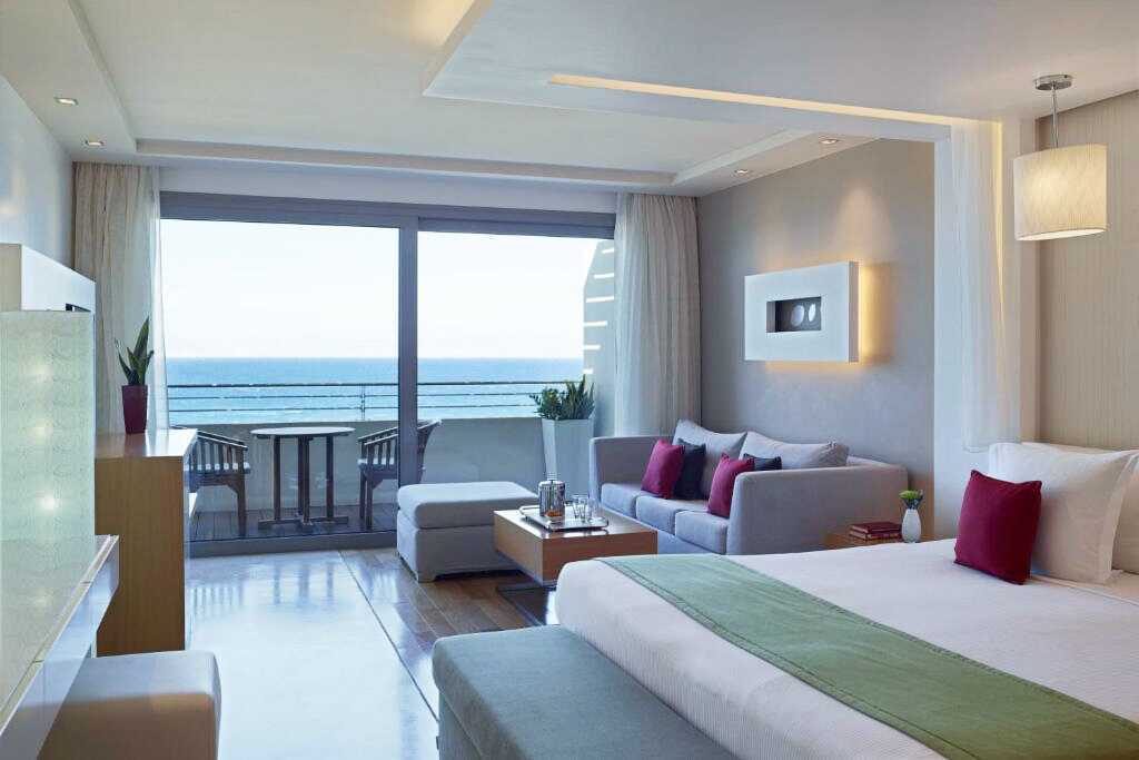 Deluxerum med balkong och havsutsikt. En dubbelsäng eller två enkelsängar. Möjlighet till extrabädd i bäddbar fåtölj. Wifi, luftkonditionering och deponering ingår. Kylskåp. Vattenkokare samt kaffe och te. Tv med internationella kanaler. Badrockar och tofflor. Hårtork. Badrum med badkar och wc. Städning 7 ggr/vecka. Barn under två år räknas in i maxantalet personer i rummet.