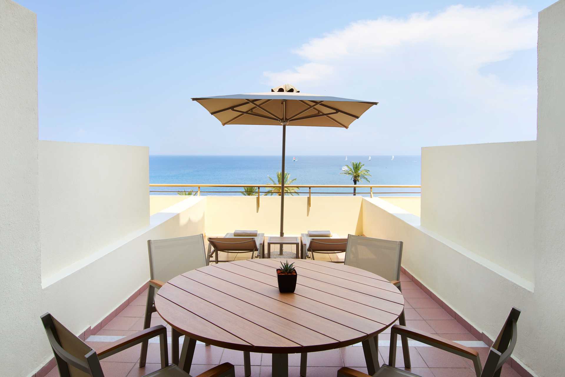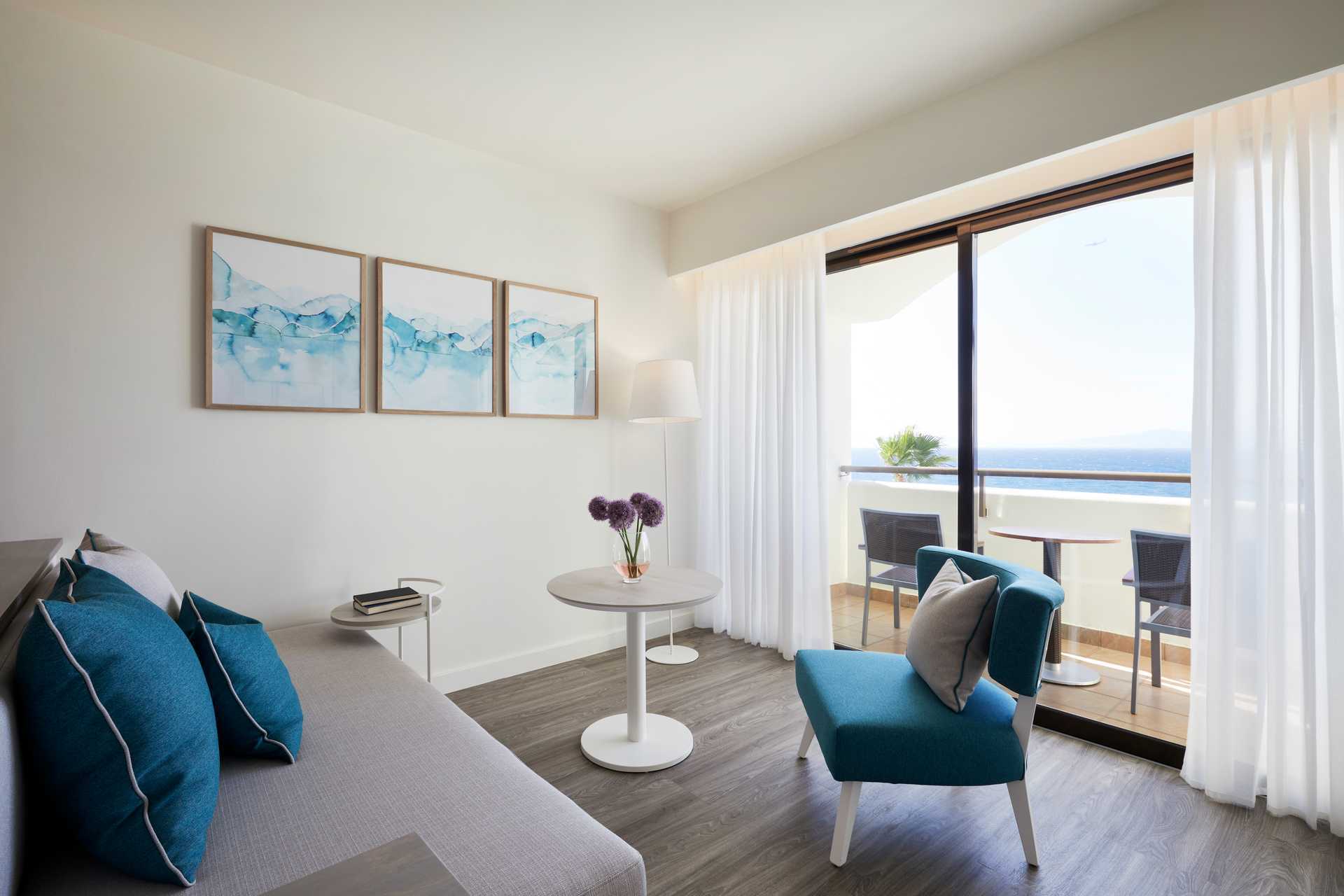 Svit med balkong och havsutsikt. En dubbelsäng eller två enkelsängar. Möjlighet till extrabädd i bäddsoffa. Wifi, luftkonditionering och deponering ingår. Kylskåp. Vattenkokare samt kaffe och te. Tv med internationella kanaler. Badrockar och tofflor. Hårtork. Badrum med badkar/dusch och wc. Städning 7 ggr/vecka. Barn under två år räknas in i maxantalet personer i rummet.