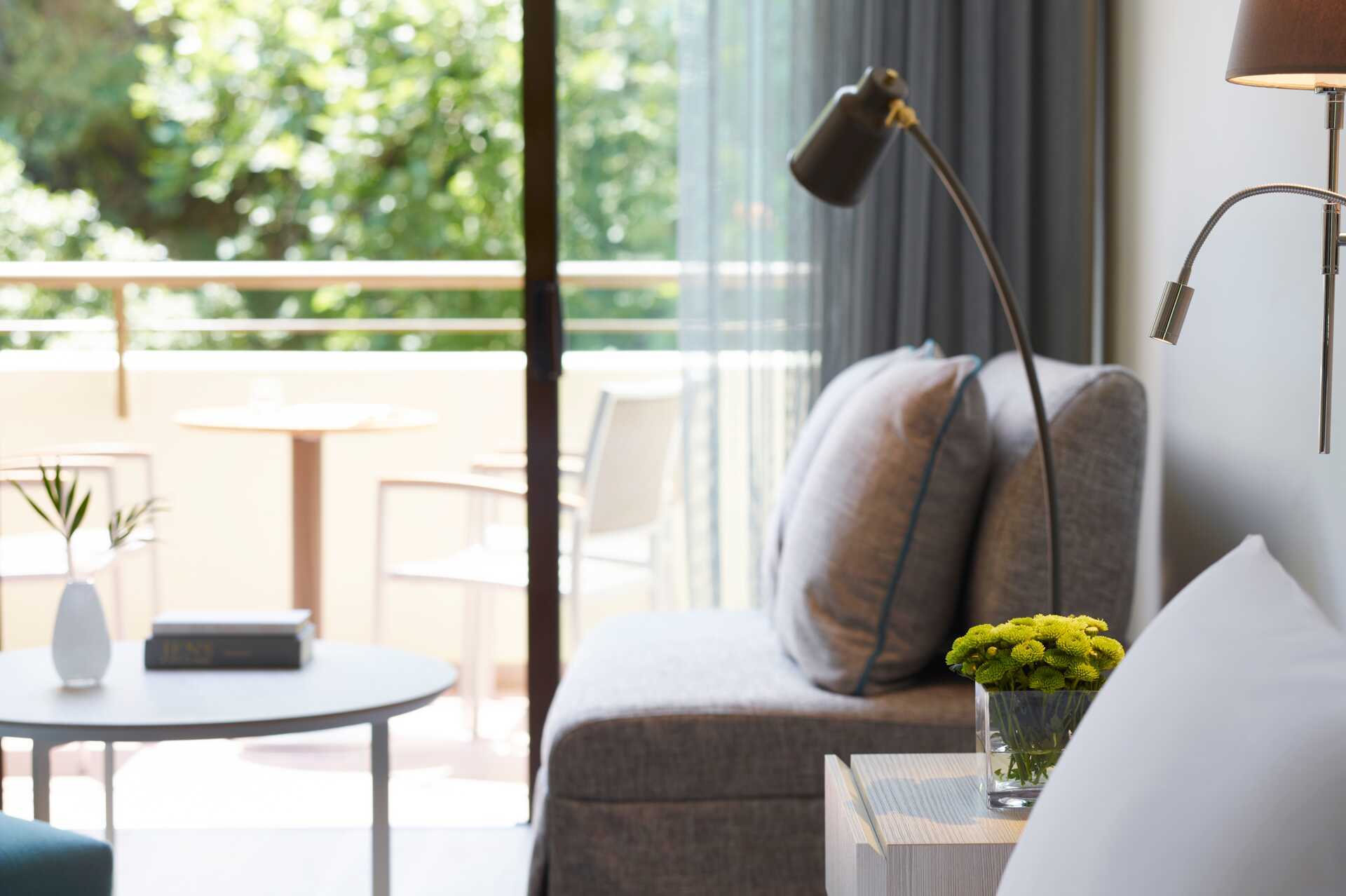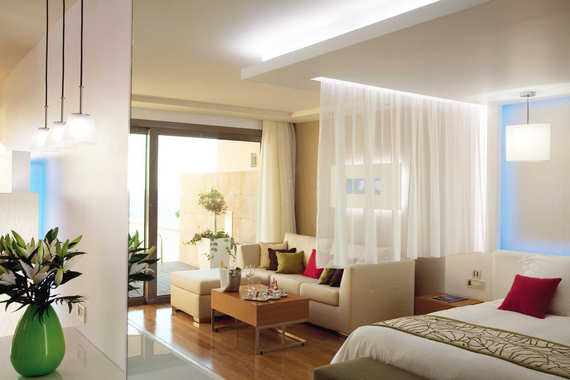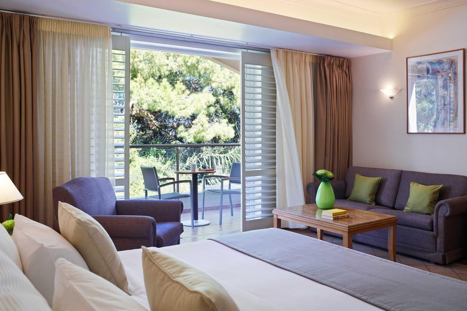 Deluxerum plus med balkong och havsutsikt. Rummet består av en sovrumsdel med en dubbelsäng och ett par trappstg ner en vardagsrumsdel med bäddsoffa. Wifi, luftkonditionering och deponering ingår. Kylskåp. Vattenkokare samt kaffe och te. Nespressomaskin. Tv med internationella kanaler. Badrockar och tofflor. Badrum med dusch och wc. Städning 7 ggr/vecka. Barn under två år räknas in i maxantalet personer i rummet.