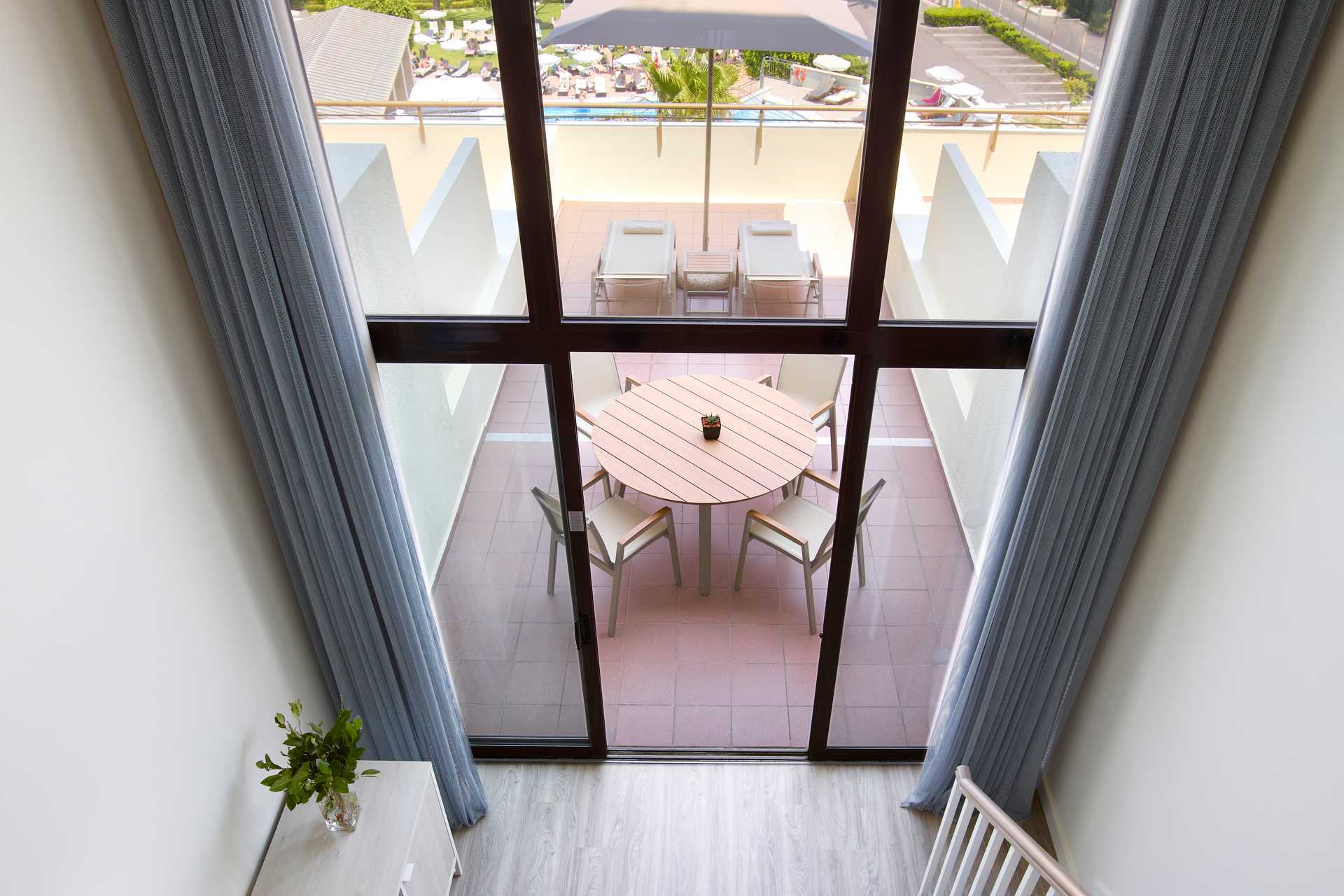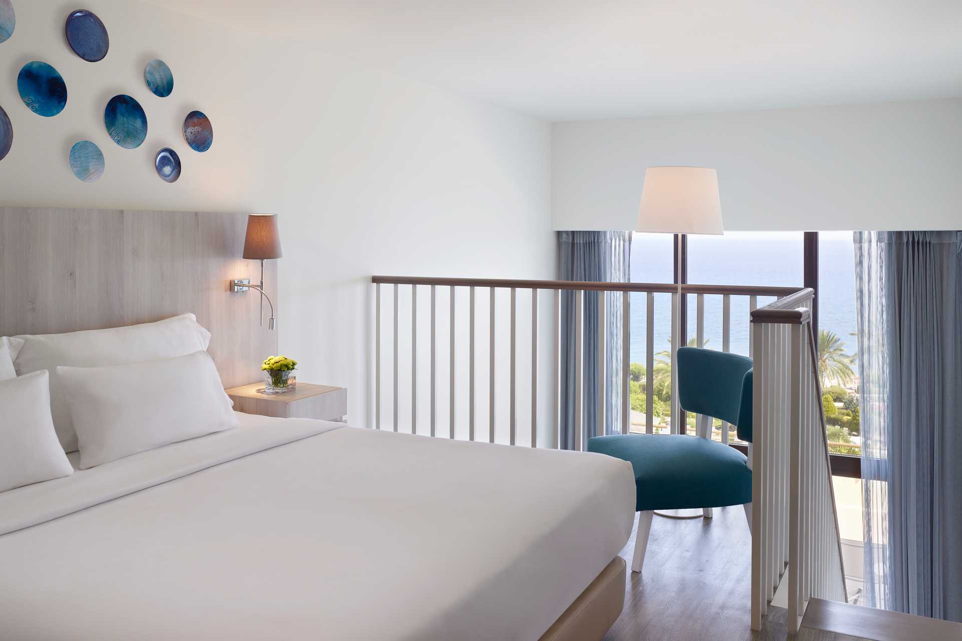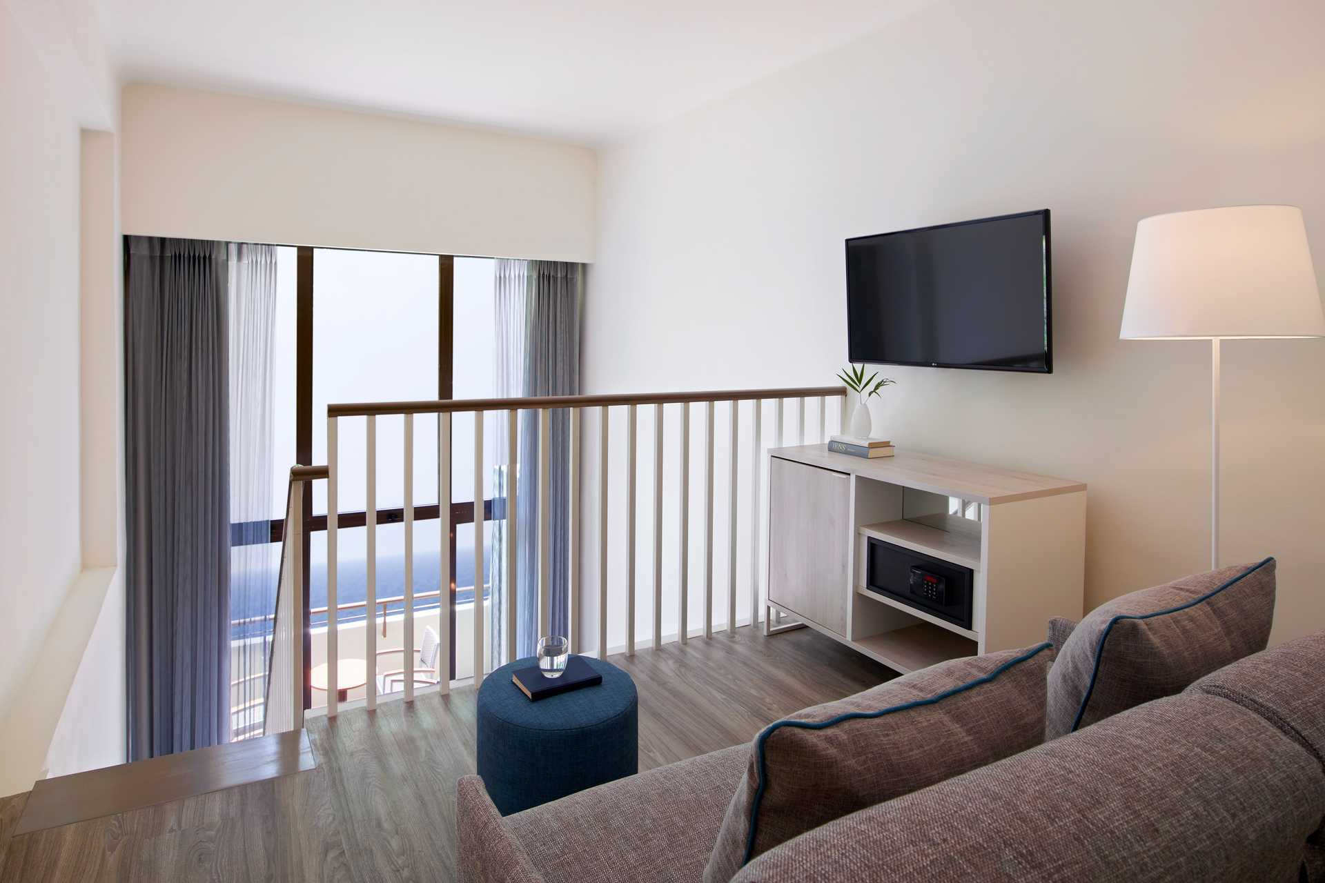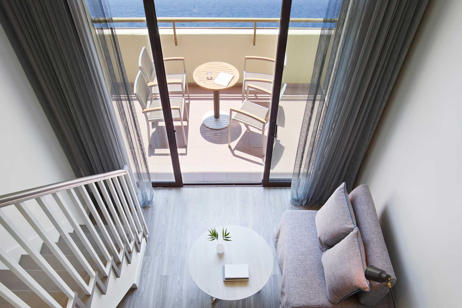 Familjerum i etage med balkong, stora panoramafönster och havsutsikt. På entréplan finns ett vardagsrum med en bäddsoffa och ett badrum med dusch och wc. En trappa upp finns ett sovloft med en dubbelsäng eller två enkelsängar och ett badrum med badkar och wc. Öppen planlösning mellan våningarna. En tv med internationella kanaler på varje våning. Wifi, luftkonditionering och deponering ingår. Kylskåp. Vattenkokare samt kaffe och te. Nespresso kaffemaskin. Badrockar och tofflor. Hårtork. Städning 7 ggr/vecka. Barn under två år räknas in i maxantalet personer i rummet.