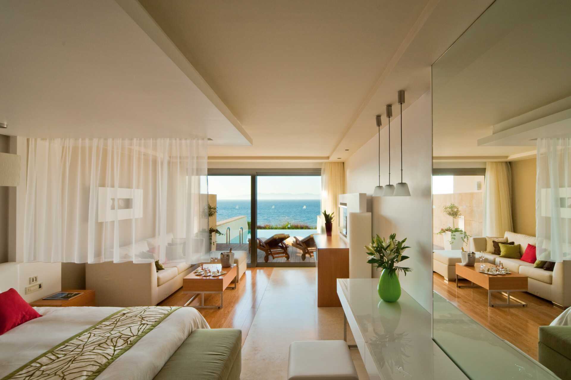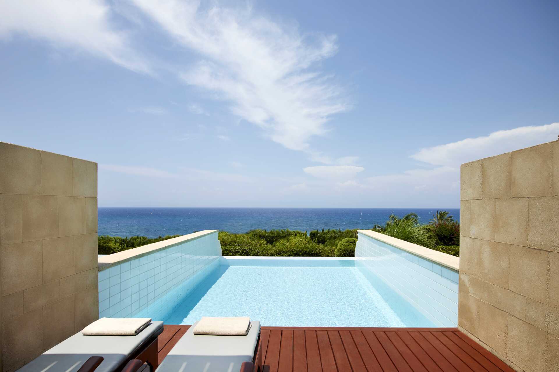 Svit med uteplats med privat pool och havsutsikt. Solsängar på uteplatsen. En dubbelsäng eller två enkelsängar. Möjlighet till extrabädd i bäddsoffa. Wifi, luftkonditionering och deponering ingår. Kylskåp. Vattenkokare samt kaffe och te. Tv med internationella kanaler. Badrockar och tofflor. Hårtork. Badrum med badkar/dusch och wc. Städning 7 ggr/vecka. Barn under två år räknas in i max antal personer i rummet.