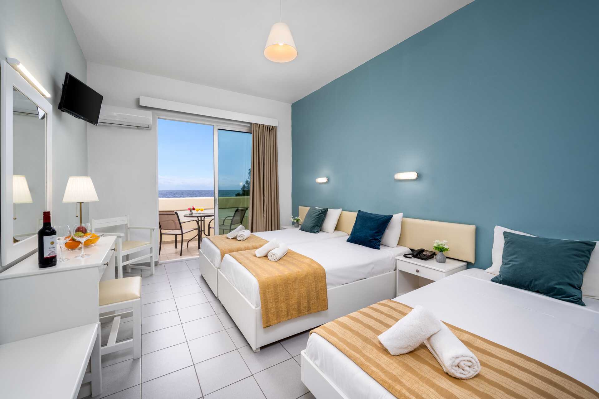 Enrumslägenhet superior med balkong och havsutsikt. Kombinerat sovrum och minikök. Matplats finns på balkongen. Två enkelsängar. I vissa rum finns möjlighet till extrabädd i hopfällbar säng. Minikök med kokplattor, kylskåp, vattenkokare och enkel köksutrustning. Wifi, luftkonditionering och deponering ingår. Tv med internationella kanaler. Hårtork. Badrum med dusch och wc. Städning 5 ggr/vecka.