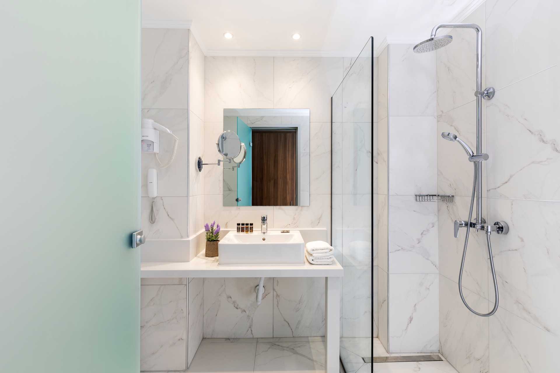 Dubbelrum med balkong, vissa med havsutsikt. En dubbelsäng eller två enkelsängar. Möjlighet till extrabäddar i hopvikbar säng. Wifi och luftkonditionering ingår. Luftkonditioneringen är tillgänglig juni-september. Deponering mot avgift. Kylskåp. Vattenkokare samt kaffe och te. Tv med internationella kanaler. Hårtork. Badrum med badkar och wc. Städning 6 ggr/vecka.