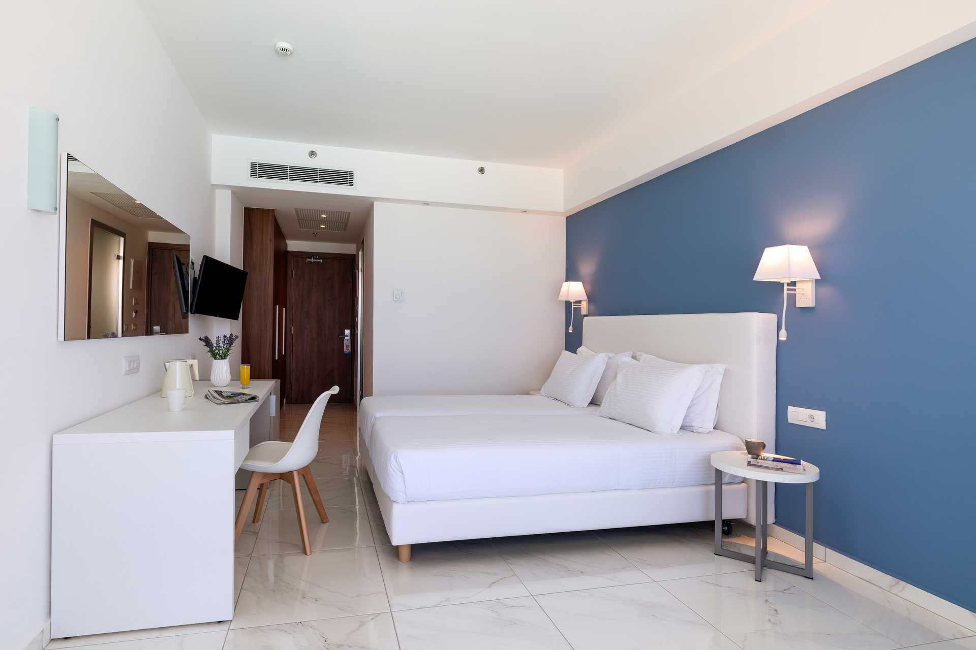 Deluxerum med balkong eller terrass, vissa med havsutsikt. En dubbelsäng eller två enkelsängar. Möjlighet till extrabäddar i enkelsäng. Wifi, luftkonditionering ingår. Luftkonditioneringen är tillgänglig juni-september. Deponering mot avgift. Kylskåp. Vattenkokare samt kaffe och te. Tv med internationella kanaler. Strykjärn och strykbräda. Hårtork. Badrum med dusch och wc. Städning 6 ggr/vecka.