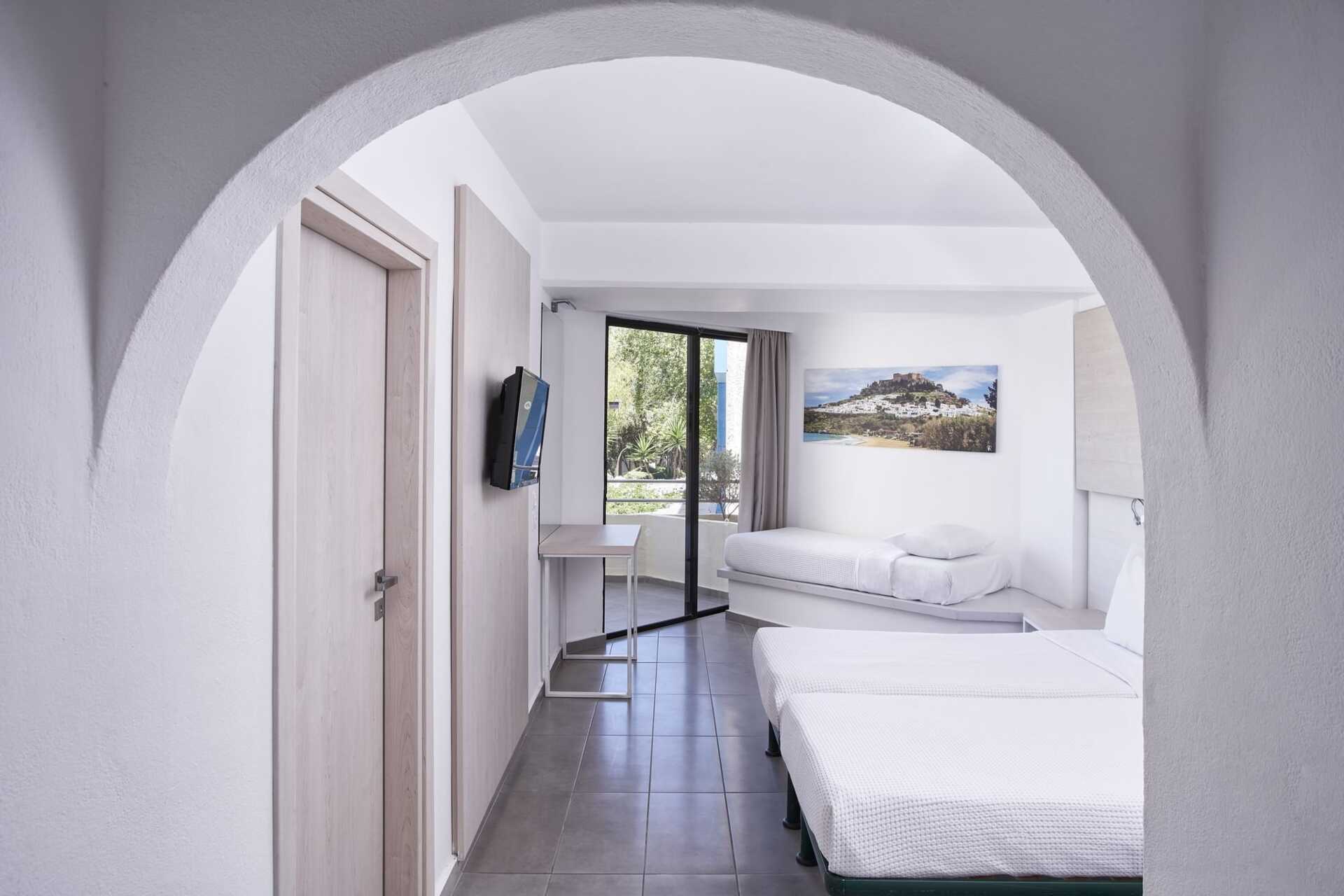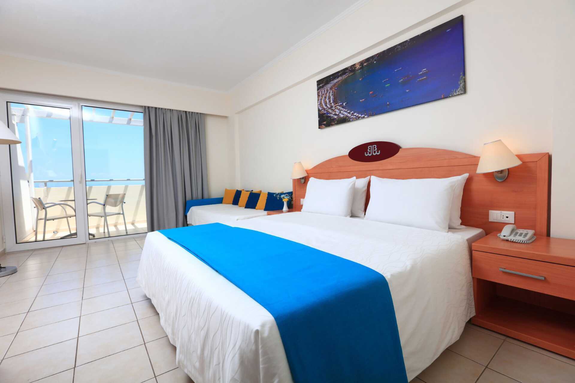 Familjerum med balkong eller terrass, vissa balkonger med havsutsikt. Familjerummet består av två dubbelrum med öppen planlösning mellan rummen. En dubbelsäng eller två enkelsängar. Möjlighet till extrabäddar i två enkelsängar. Wifi, luftkonditionering och deponering ingår. Kylskåp där en flaska vatten ingår per dag. Vattenkokare samt kaffe och te. Tv med internationella kanaler. Hårtork. Badrum med badkar och wc. Städning 6 ggr/vecka.