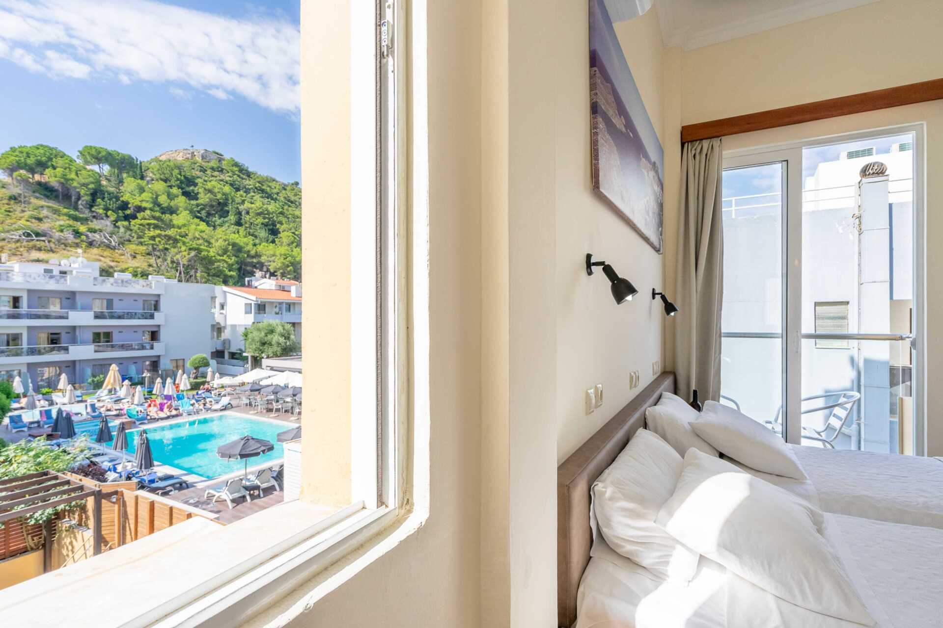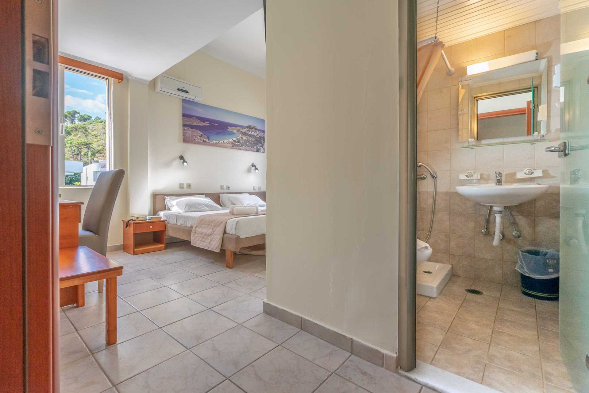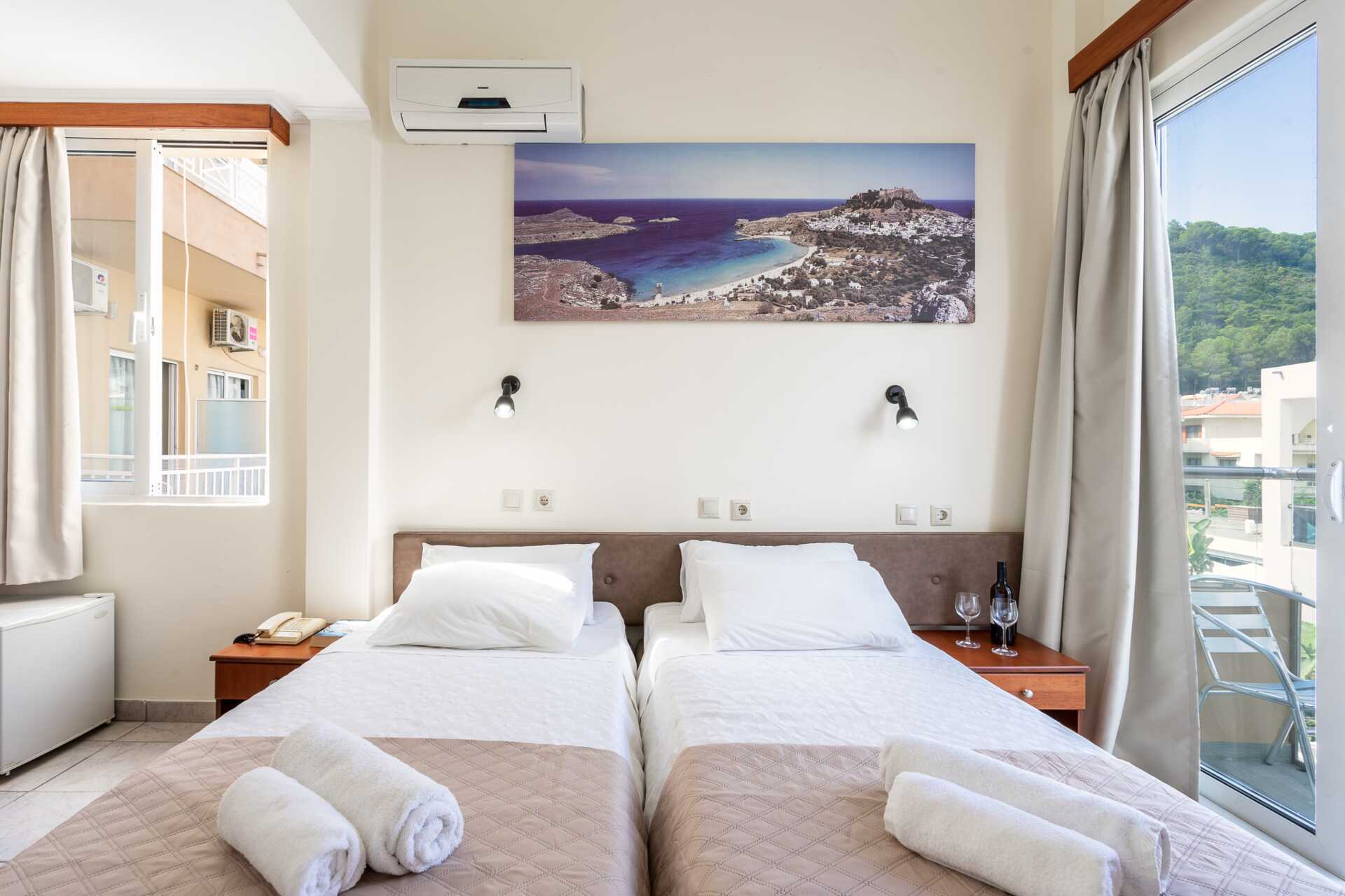 Dubbelrum med balkong. En dubbelsäng eller två enkelsängar. Wifi, luftkonditionering och deponering. Deponering mot avgift. Kylskåp. Tv med internationella kanaler. Hårtork. Badrum med dusch och wc. Städning 6 ggr/vecka.
