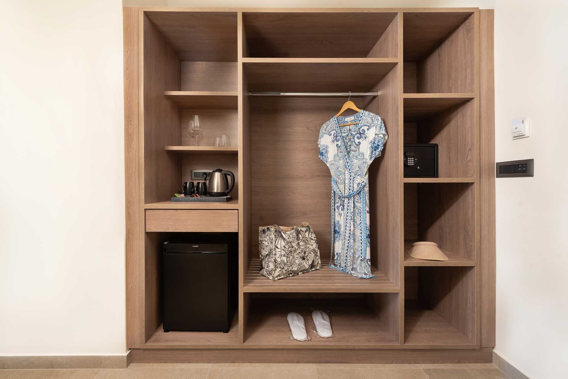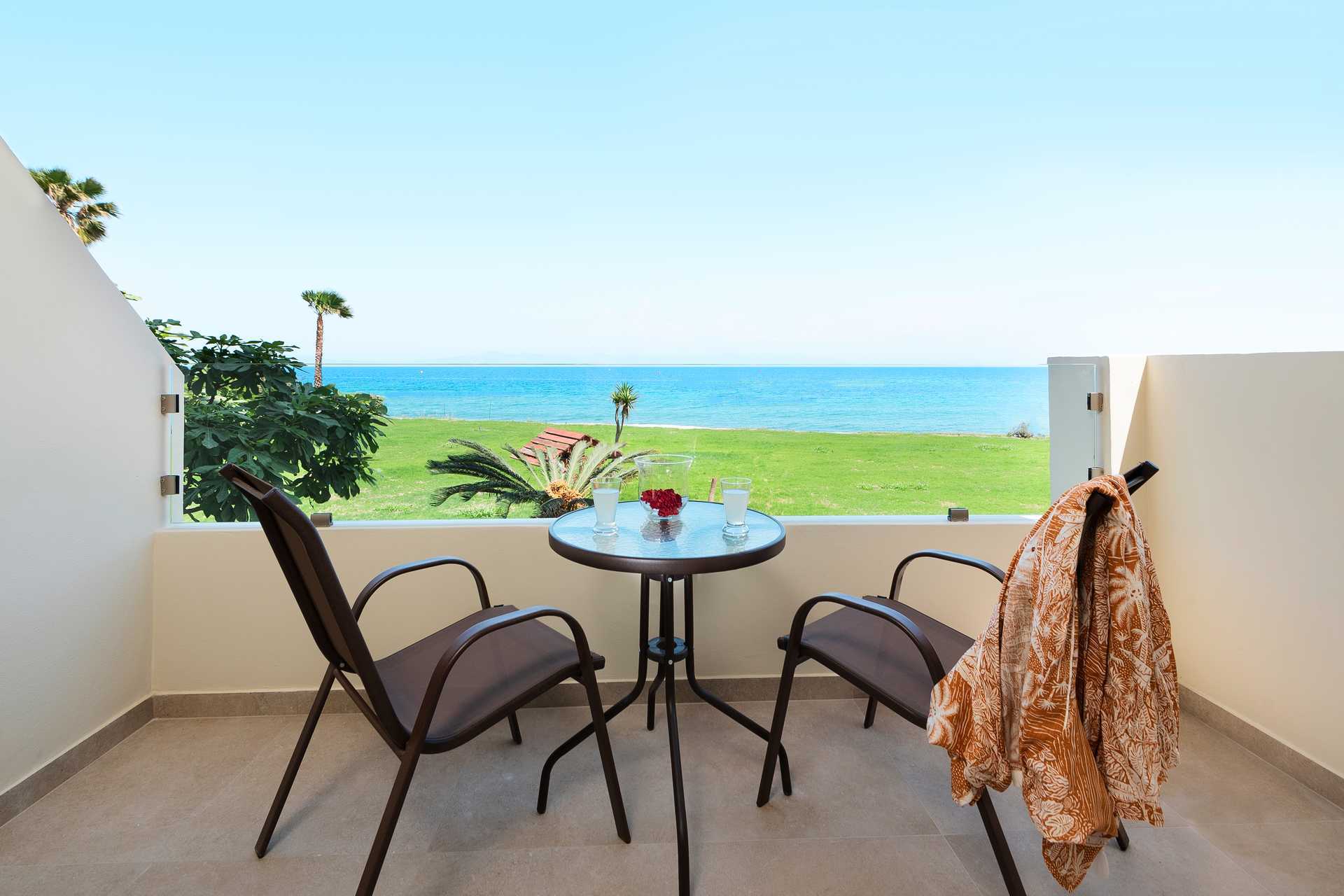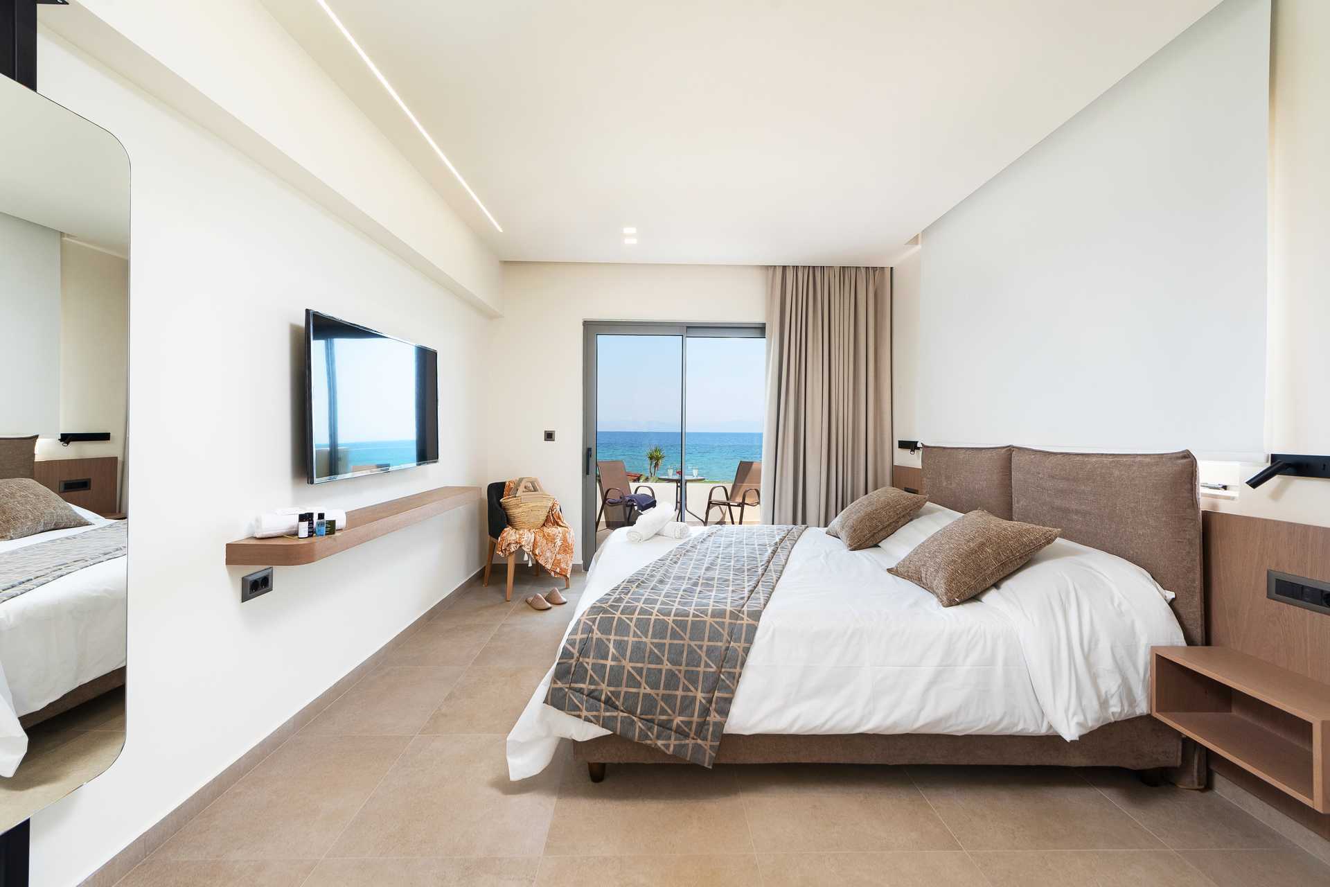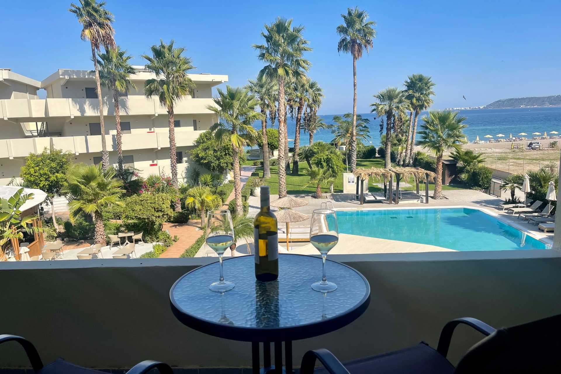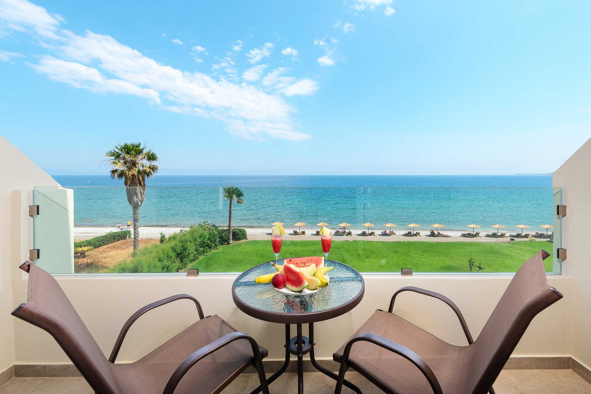 Deluxerum med balkong och havsutsikt eller poolutsikt. En dubbelsäng. Möjlighet till extrabädd. Wifi, luftkonditionering och deponering ingår. Kylskåp. Vattenkokare samt kaffe och te. Tv med internationella kanaler. Hårtork. Tofflor. Badrum med dusch och wc. Städning 7 ggr/vecka.