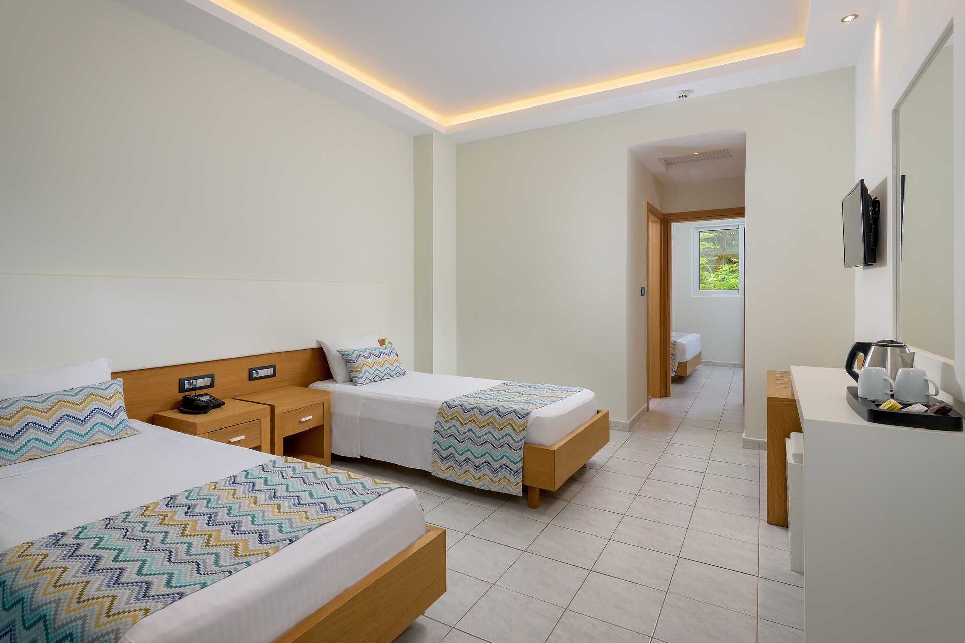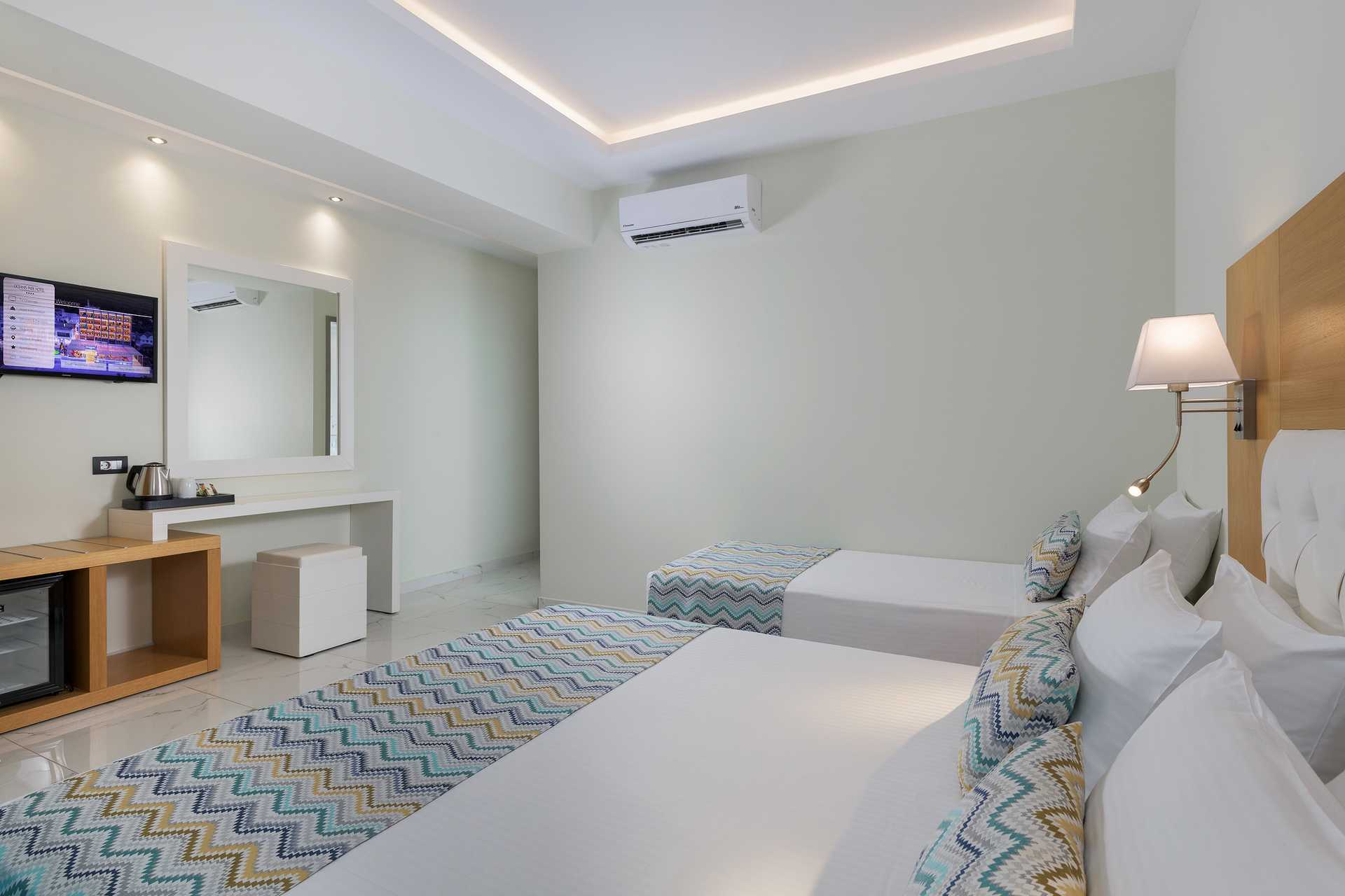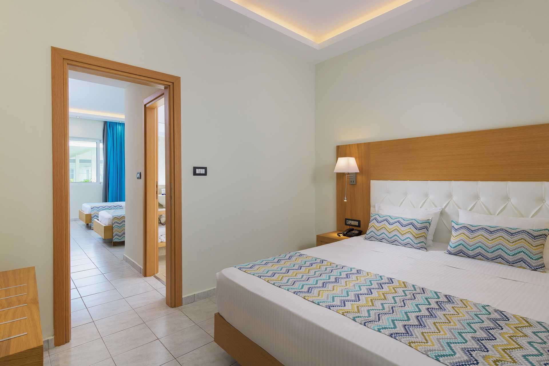 Familjerum med balkong eller terrass. Rummen består av två sovrum, ett med en dubbelsäng och ett med två enkelsängar. Wifi, luftkonditionering och deponering ingår. Kylskåp. Vattenkokare samt kaffe och te. Tv med internationella kanaler i båda rummen. Hårtork. Badrum med dusch och wc. Städning 7 ggr/vecka.