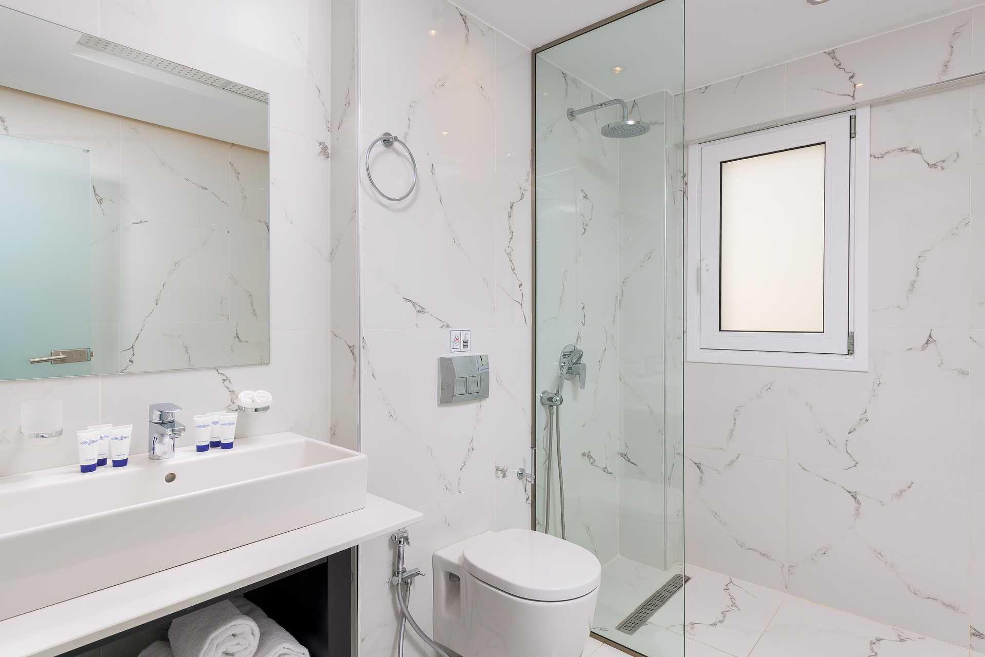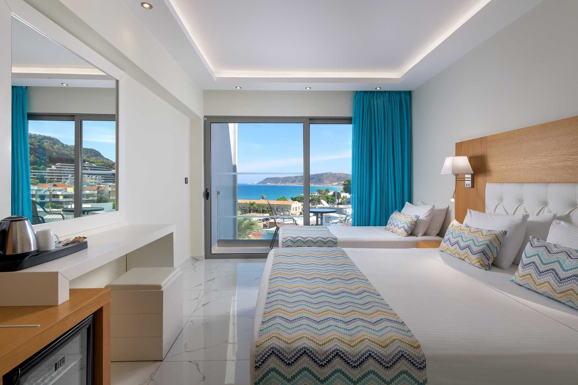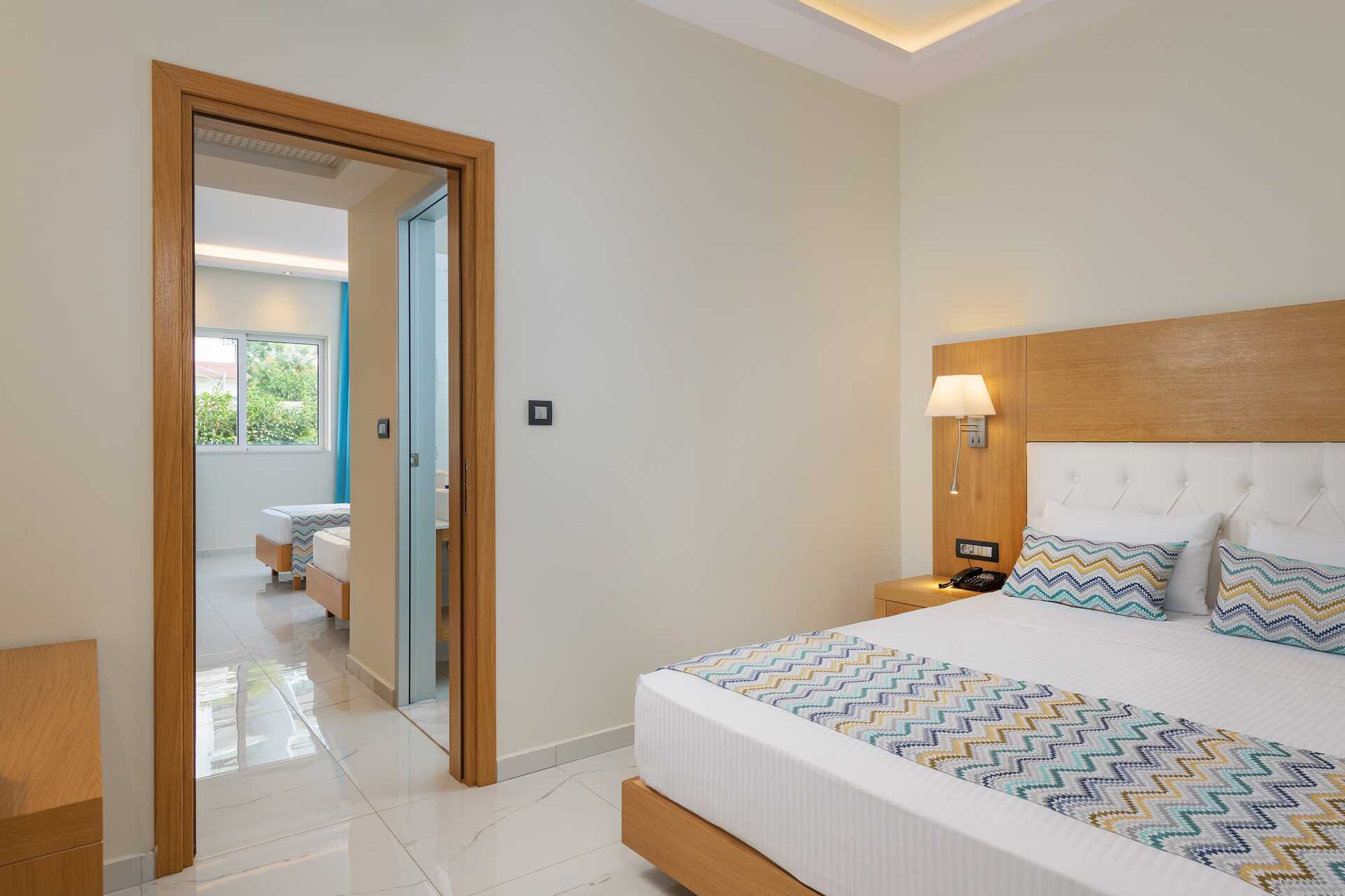 Familjerum med balkong eller terrass. Rummen består av två sovrum, ett med en dubbelsäng och ett med två enkelsängar. Wifi, luftkonditionering och deponering ingår. Kylskåp. Vattenkokare samt kaffe och te. Tv med internationella kanaler i båda rummen. Hårtork. Badrum med dusch och wc. Städning 7 ggr/vecka.