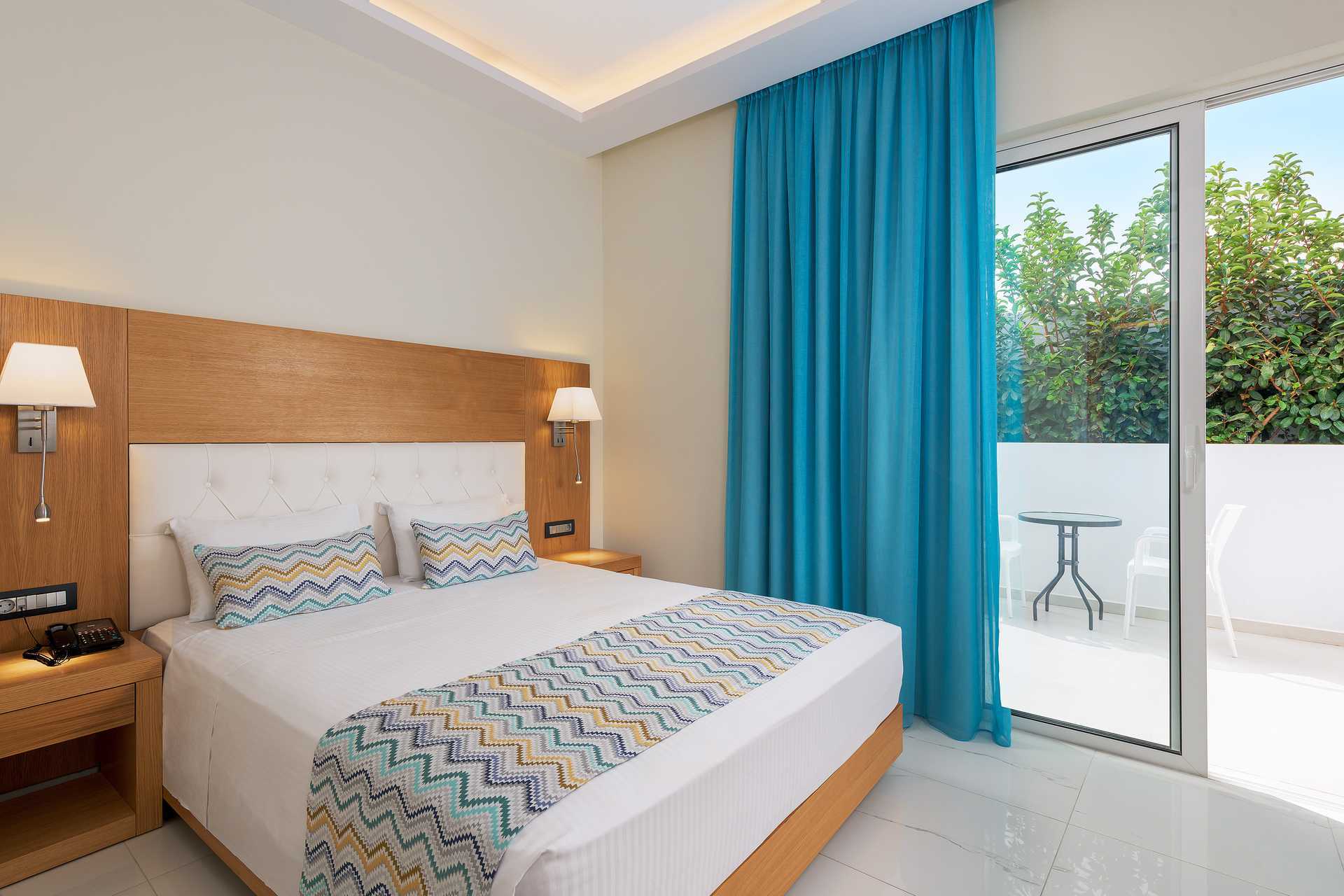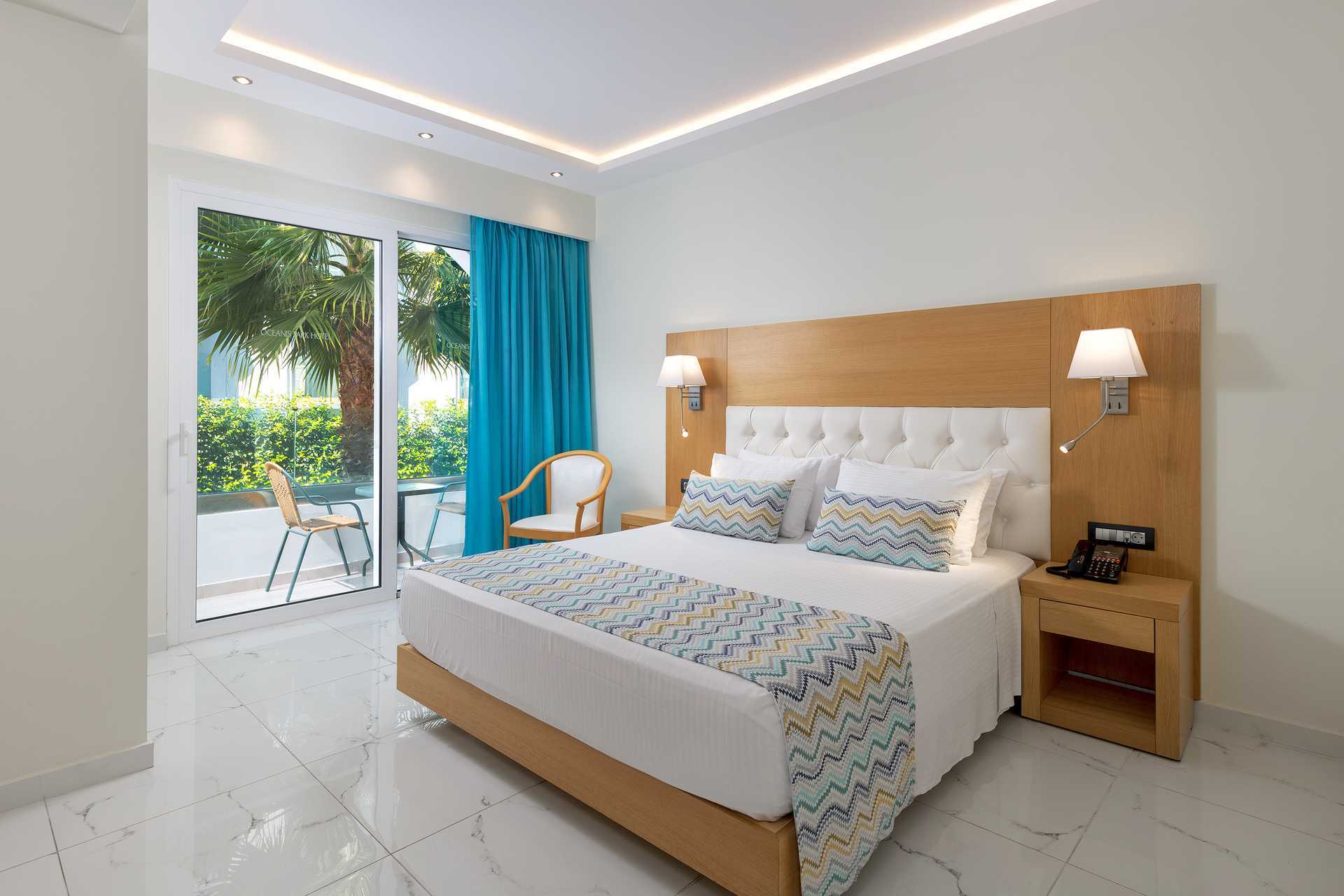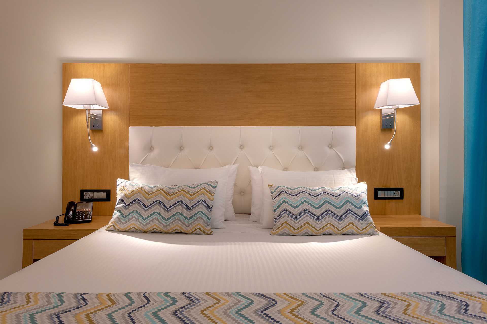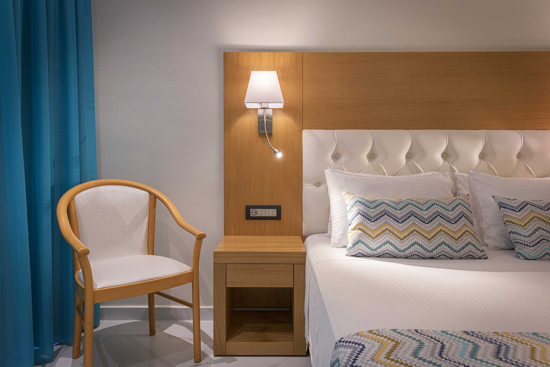 Dubbelrum med balkong eller terrass, vissa med havsutsikt eller med begränsad havsutsikt. En dubbelsäng eller två enkelsängar. Möjlighet till extrabädd i en tredje enkelsäng. Wifi, luftkonditionering och deponering ingår. Kylskåp. Vattenkokare samt kaffe och te. Tv med internationella kanaler. Hårtork. Badrum med dusch och wc. Städning 7 ggr/vecka.