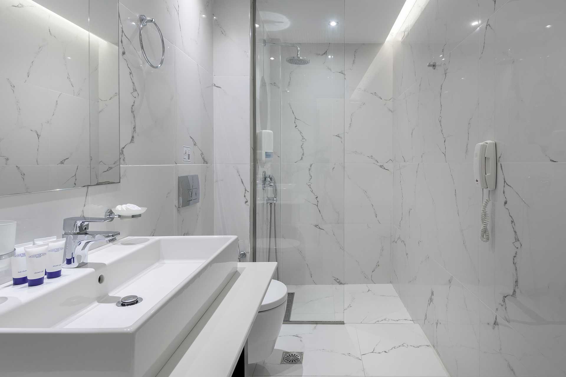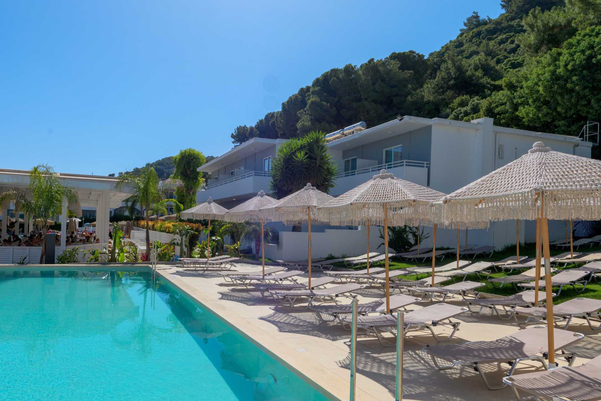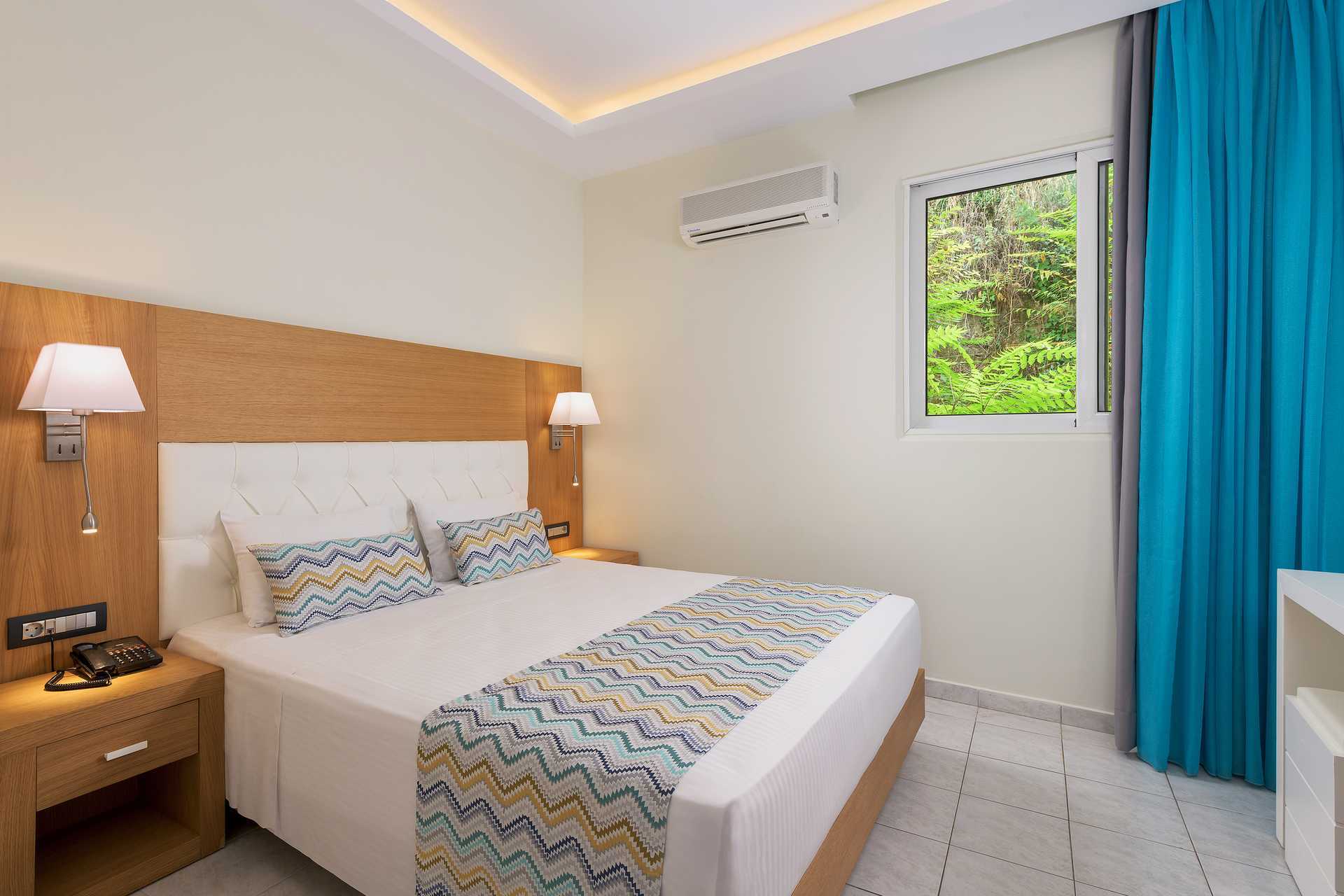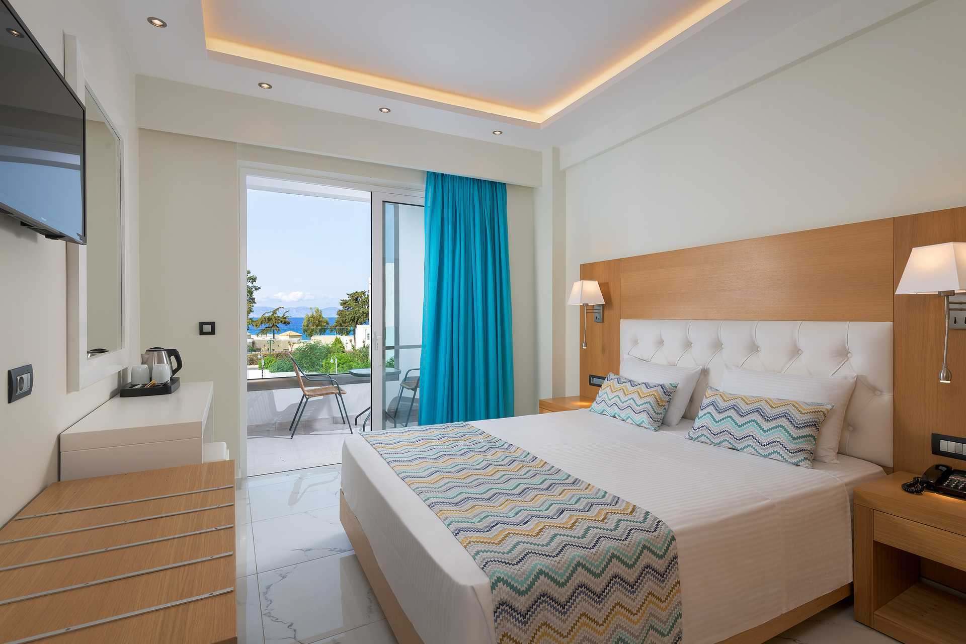 Dubbelrum med balkong eller terrass, vissa med havsutsikt eller med begränsad havsutsikt. En dubbelsäng eller två enkelsängar. Möjlighet till extrabädd i en tredje enkelsäng. Wifi, luftkonditionering och deponering ingår. Kylskåp. Vattenkokare samt kaffe och te. Tv med internationella kanaler. Hårtork. Badrum med dusch och wc. Städning 7 ggr/vecka.
