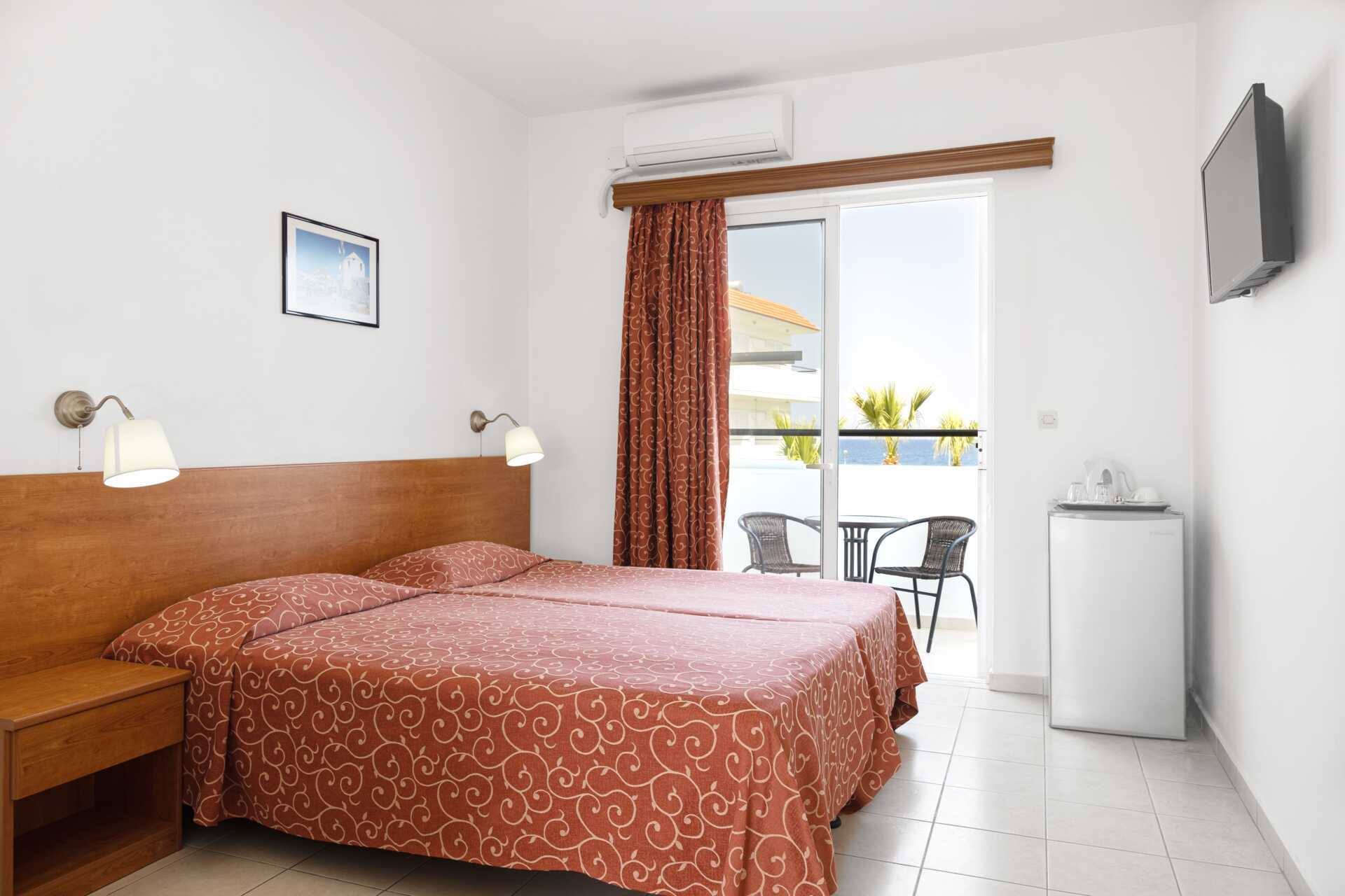 Dubbelrum med balkong eller markbalkong, vissa balkonger med begränsad havsutsikt. Två enkelsängar. Möjlighet till extrabädd för en tredje person. Wifi och luftkonditionering ingår. Deponering mot avgift. Kylskåp. Vattenkokare. Hårtork. Badrum med badkar och wc. Städning 7 ggr/vecka.