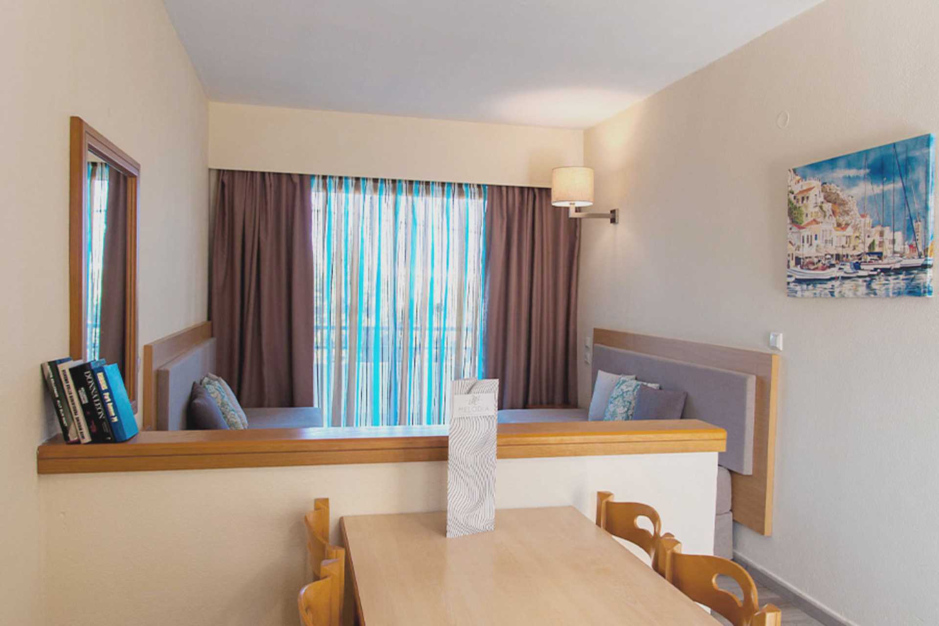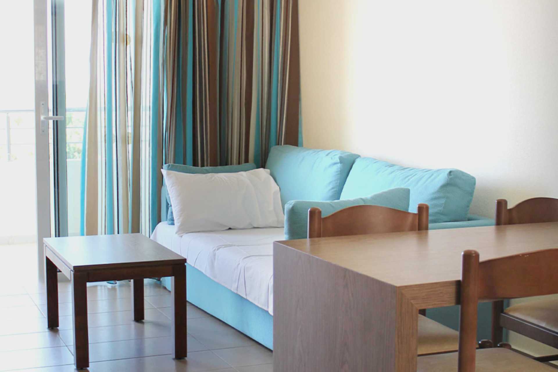 Familjerum med balkong eller terrass. Familjerummet består av ett sovrum och ett vardagsrum. Två enkelsängar. Möjlighet till extrabäddar i två bäddsoffor. Wifi, luftkonditionering och deponering ingår. Kylskåp. Hårtork. Badrum med badkar eller dusch samt wc. Städning 6 ggr/vecka.