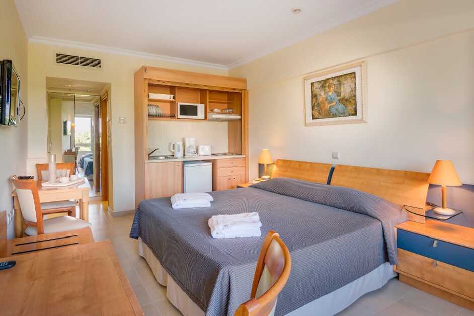 Enrumslägenhet med balkong, vissa med havsutsikt. Lägenheterna ligger i hotelldelarna Garden Ving, Zeus och Hera. Sovrum kombinerat med minikök. Två enkelsängar. Möjlighet till extrabädd i enkelsäng. Minikök med kylskåp, kokplattor, mikrovågsugn, kaffebryggare, brödrost, vattenkokare och enkel köksutrustning. Wifi och luftkonditionering ingår. Luftkonditioneringen styrs centralt dygnet runt av hotellet under juni till september. Deponering mot avgift. Tv med internationella kanaler. Hårtork. Badrum med badkar och wc. Städning 7 ggr/vecka. Barn under två år räknas in i maxantalet personer i lägenheten.