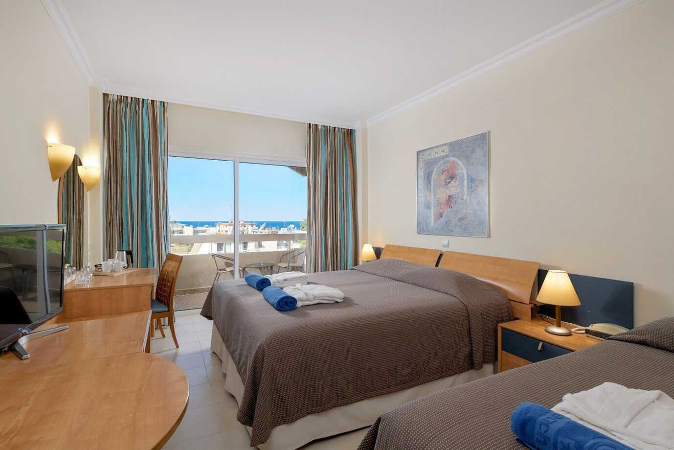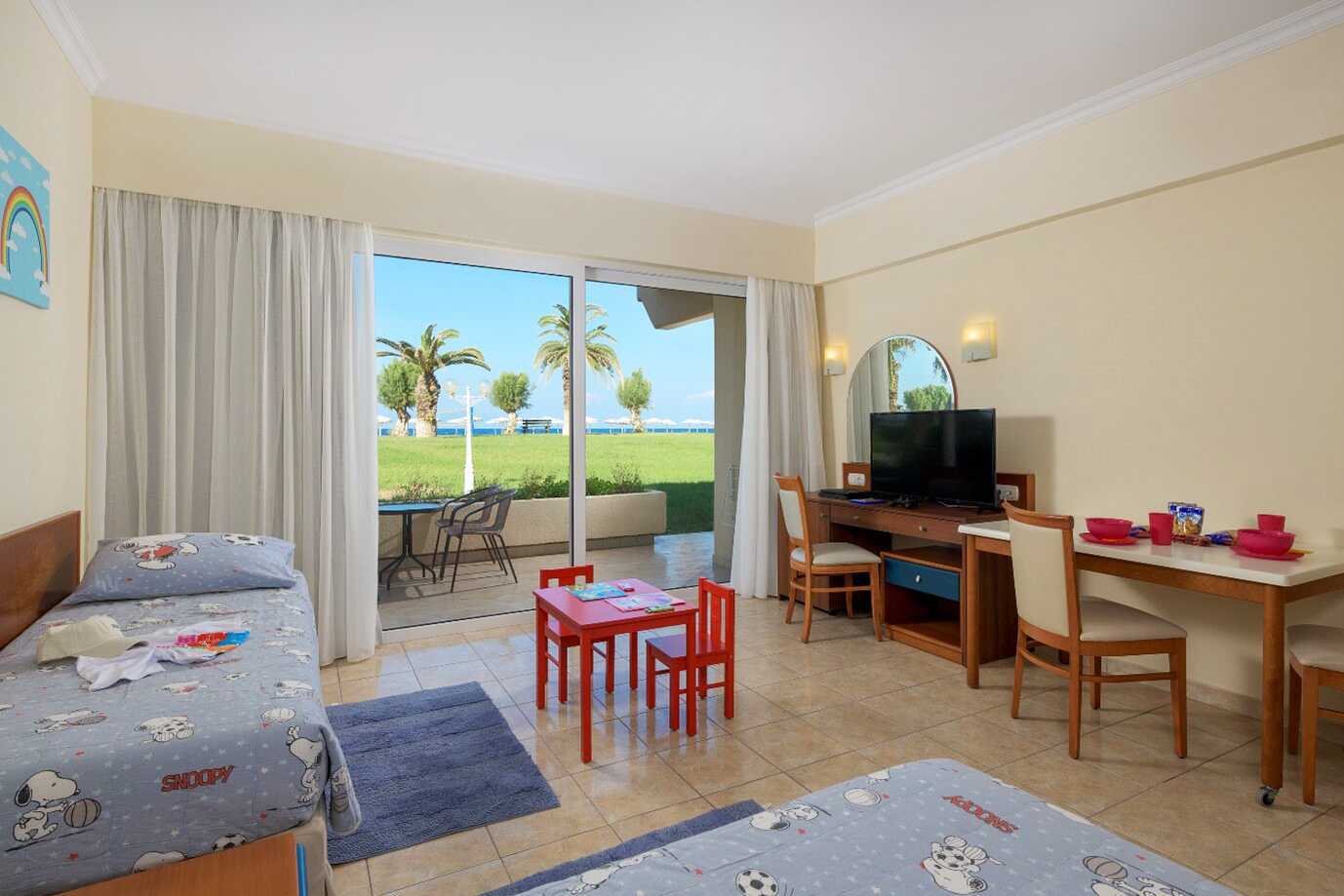 Familjerum med balkong. Rummen ligger i hotelldelarna Garden Ving, Zeus och Hera. Två enkelsängar. Möjlighet till extrabädd i enkelsäng och i hopfällbar säng. Wifi och luftkonditionering ingår. Luftkonditioneringen styrs centralt dygnet runt av hotellet under juni till september. Deponering mot avgift. Kylskåp. Vattenkokare samt kaffe och te. Tv med internationella kanaler. Hårtork. Badrum med badkar och wc. Städning 7 ggr/vecka. Barn under två år räknas in i maxantalet personer i rummet.