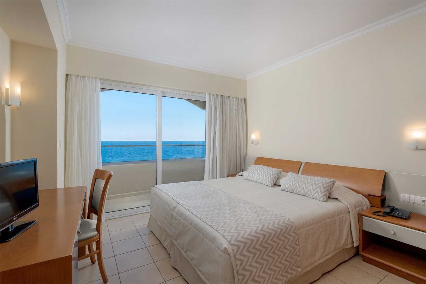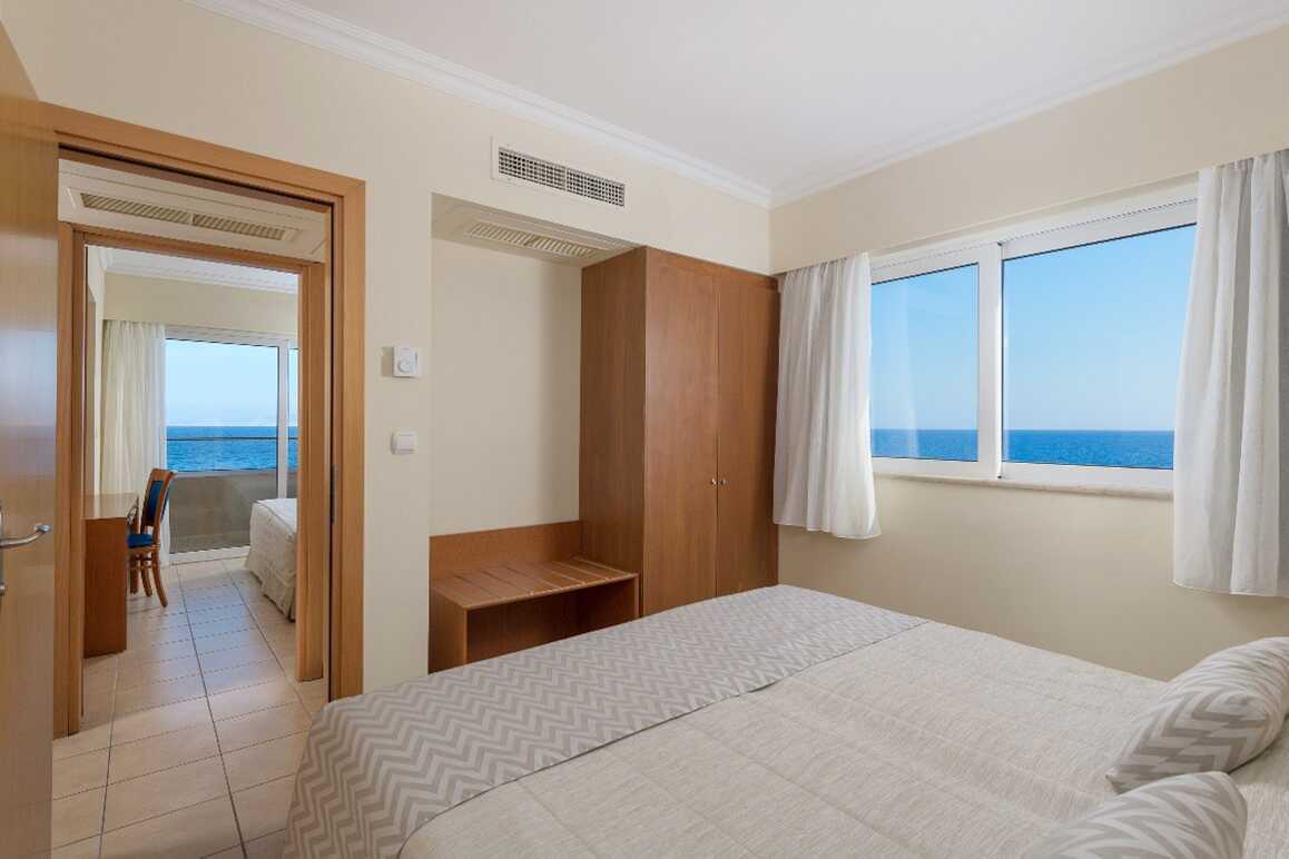 Trerumslägenhet med balkong och havsutsikt. Lägenheterna ligger i hotelldelen Beachfront Wing. Två sovrum och ett kombinerat vardagsrum med minikök. Två enkelsängar i varje sovrum. Möjlighet till extrabäddar i två bäddsoffor eller i enkelsängar. Minikök med kylskåp, kokplattor, mikrovågsugn, kaffebryggare, brödrost, vattenkokare och enkel köksutrustning. Wifi och luftkonditionering ingår. Luftkonditioneringen styrs centralt dygnet runt av hotellet under juni till september. Deponering mot avgift. Tv med internationella kanaler. Badrockar och tofflor. Hårtork. Badrum med badkar och wc. Städning 7 ggr/vecka. Barn under två år räknas in i maxantalet personer i lägenheten.