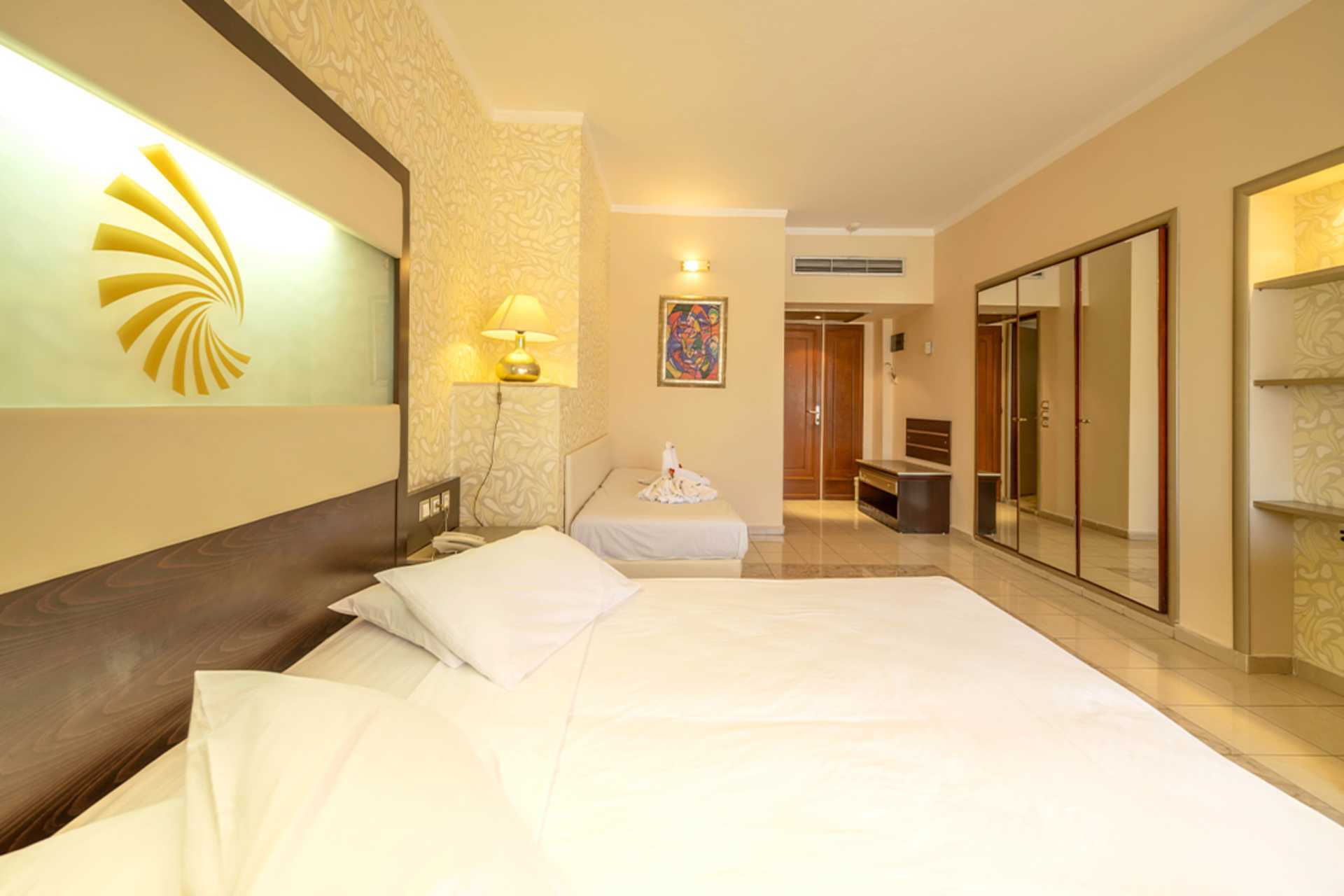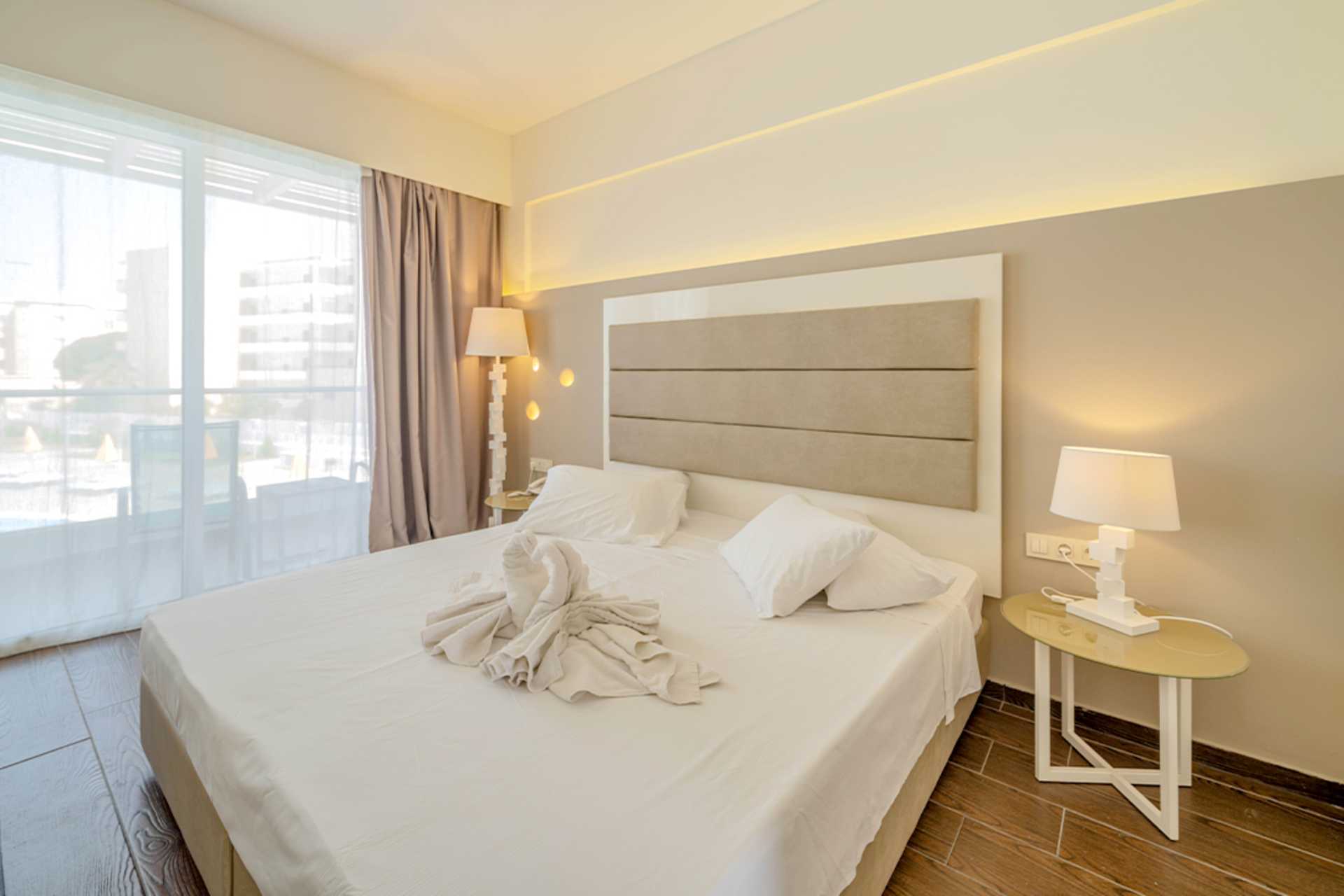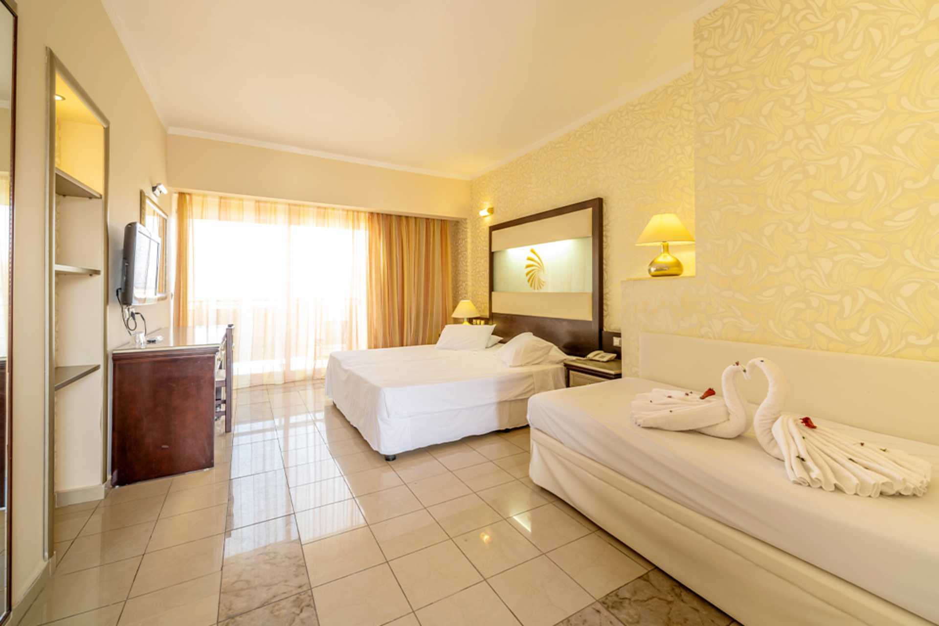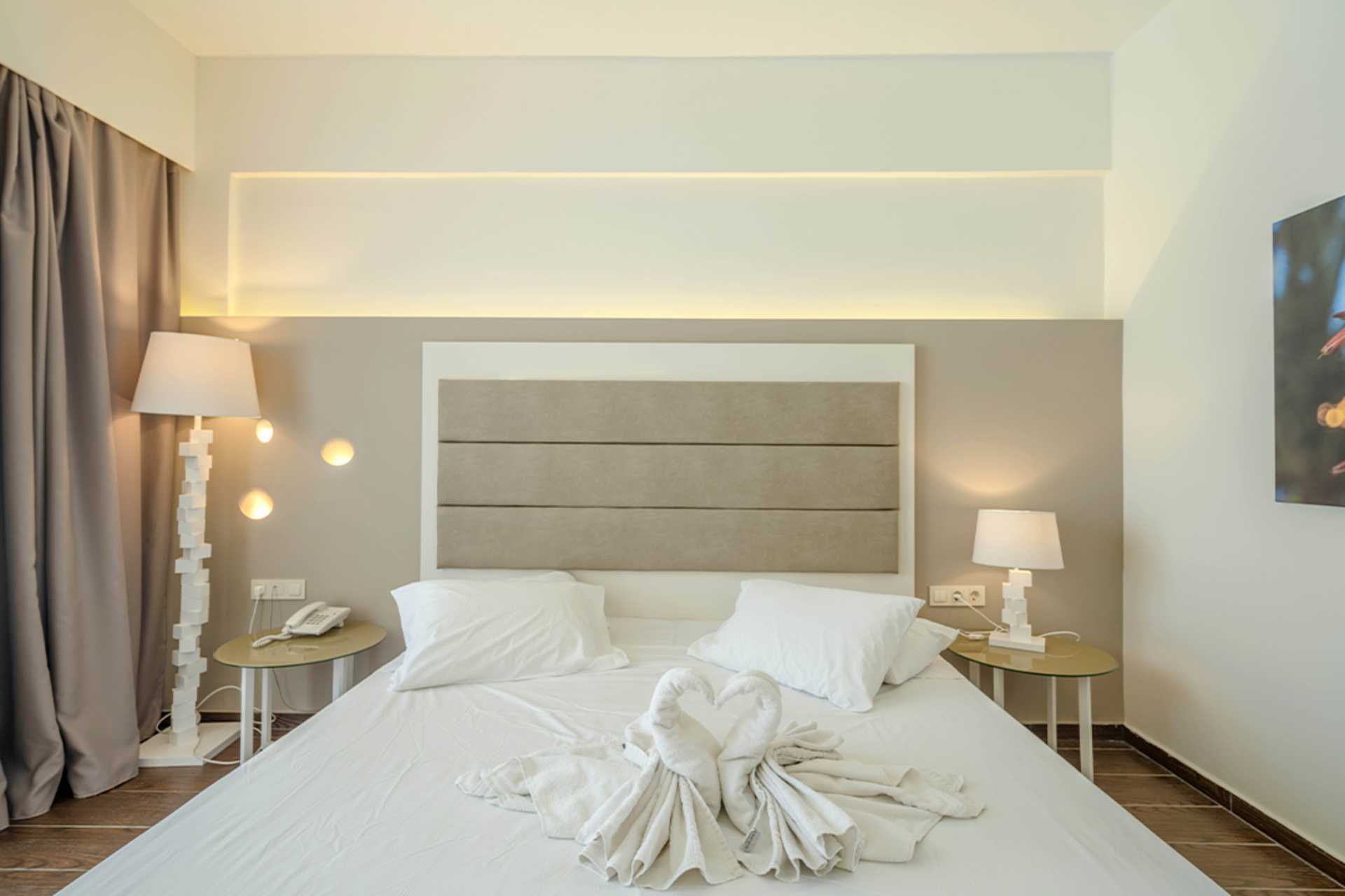 Familjerum med balkong, vissa med havsutsikt eller poolutsikt. Sovrum med en dubbelsäng eller två enkelsängar. Rummen med balkong och balkong med havsutsikt (ca 45 kvadratmeter) har ett vardagsrum med möjlighet till extrabädd i bäddsoffa. Rummen med poolutsikt (36 kvadratmeter) har två bäddsoffor i en sovdel som kan separeras från sovrummet med skjutdörrar, För att nå rummen med poolutsikt måste liten väg korsas. Wifi, luftkonditionering och deponering ingår. Luftkonditionering finns tillgängligt från 1 juni till 30 september. Kylskåp. Tv med internationella kanaler. Hårtork. Badrum med badkar eller dusch samt wc. Städning 7 ggr/vecka.