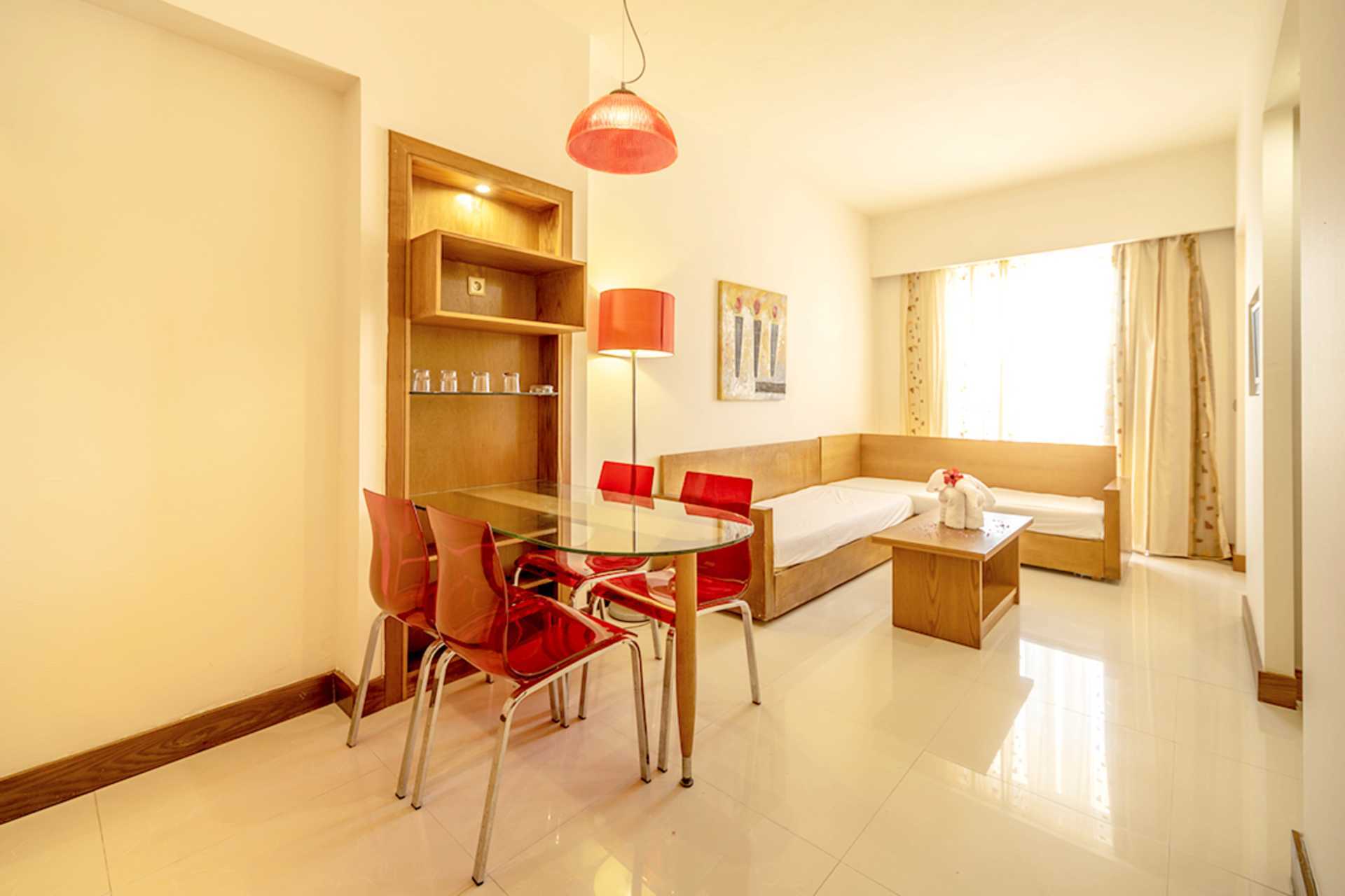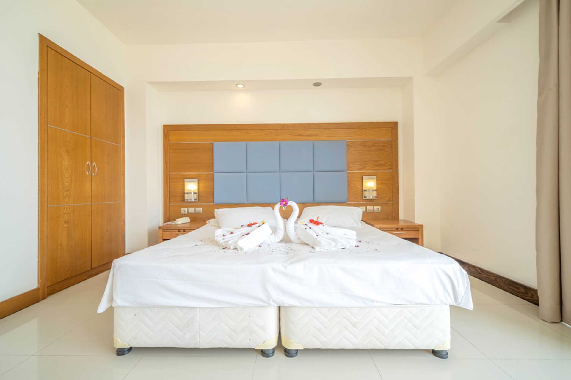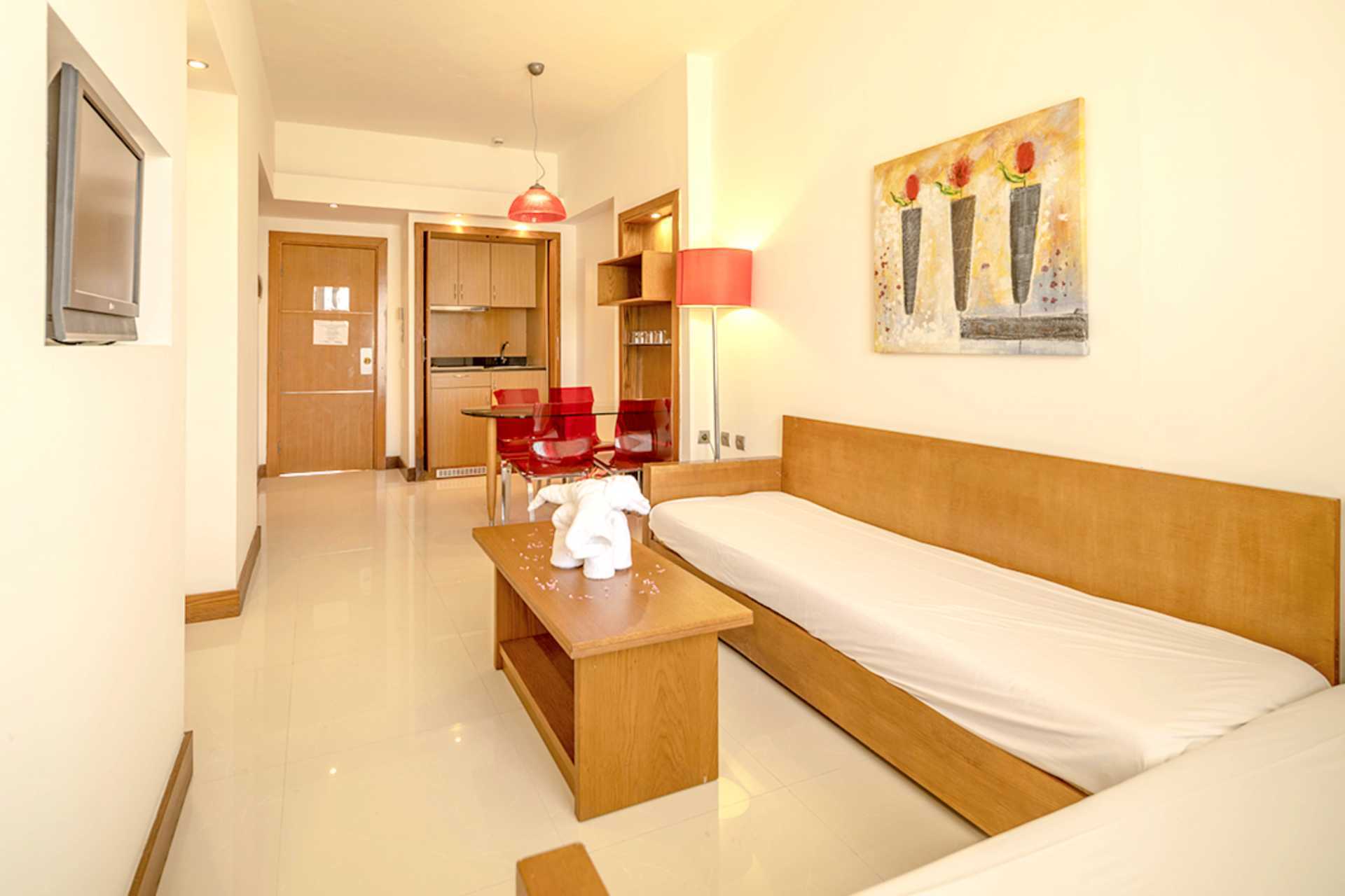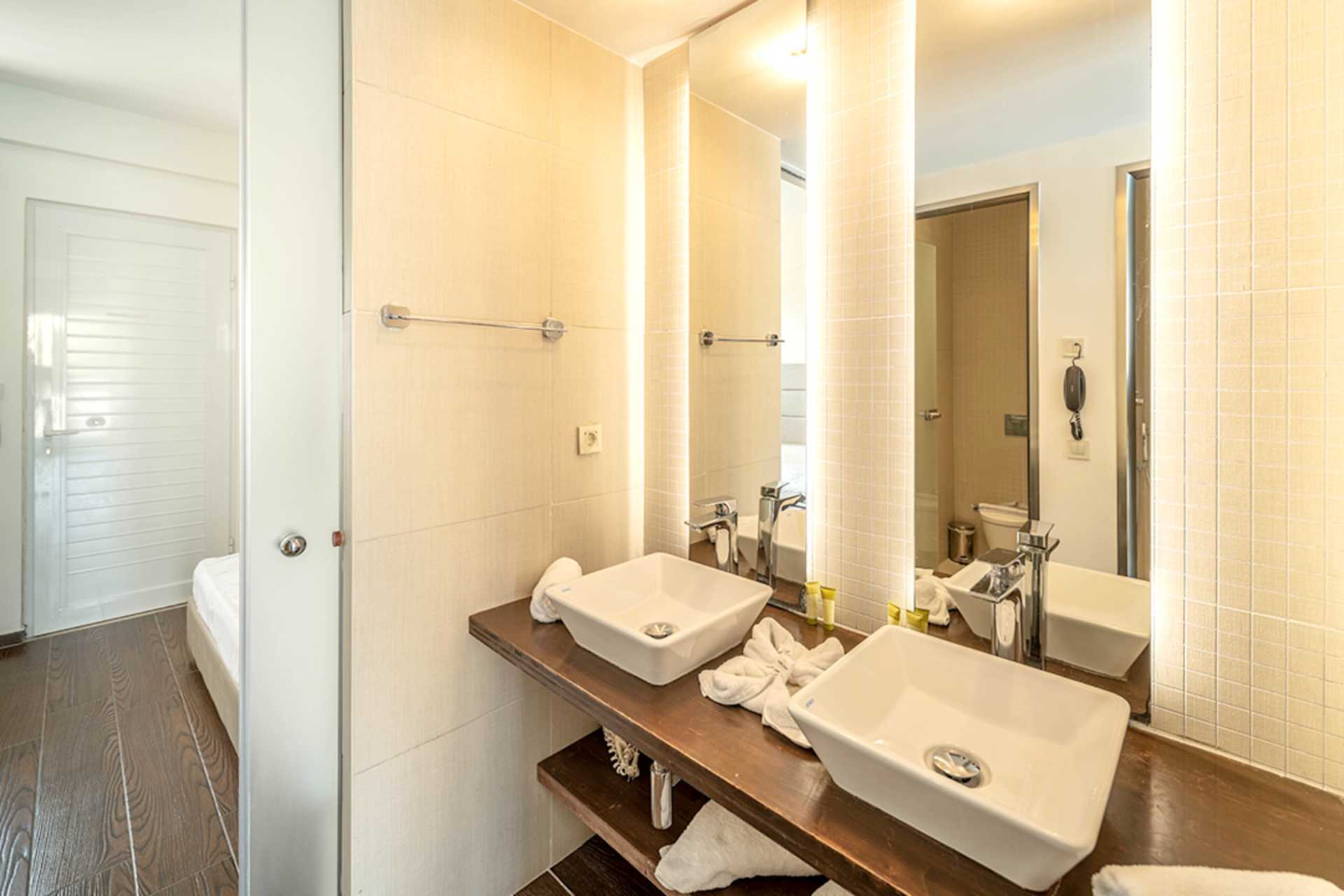 Familjerum med balkong, vissa med havsutsikt eller poolutsikt. Sovrum med en dubbelsäng eller två enkelsängar. Rummen med balkong och balkong med havsutsikt (ca 45 kvadratmeter) har ett vardagsrum med möjlighet till extrabädd i bäddsoffa. Rummen med poolutsikt (36 kvadratmeter) har två bäddsoffor i en sovdel som kan separeras från sovrummet med skjutdörrar, För att nå rummen med poolutsikt måste liten väg korsas. Wifi, luftkonditionering och deponering ingår. Luftkonditionering finns tillgängligt från 1 juni till 30 september. Kylskåp. Tv med internationella kanaler. Hårtork. Badrum med badkar eller dusch samt wc. Städning 7 ggr/vecka.