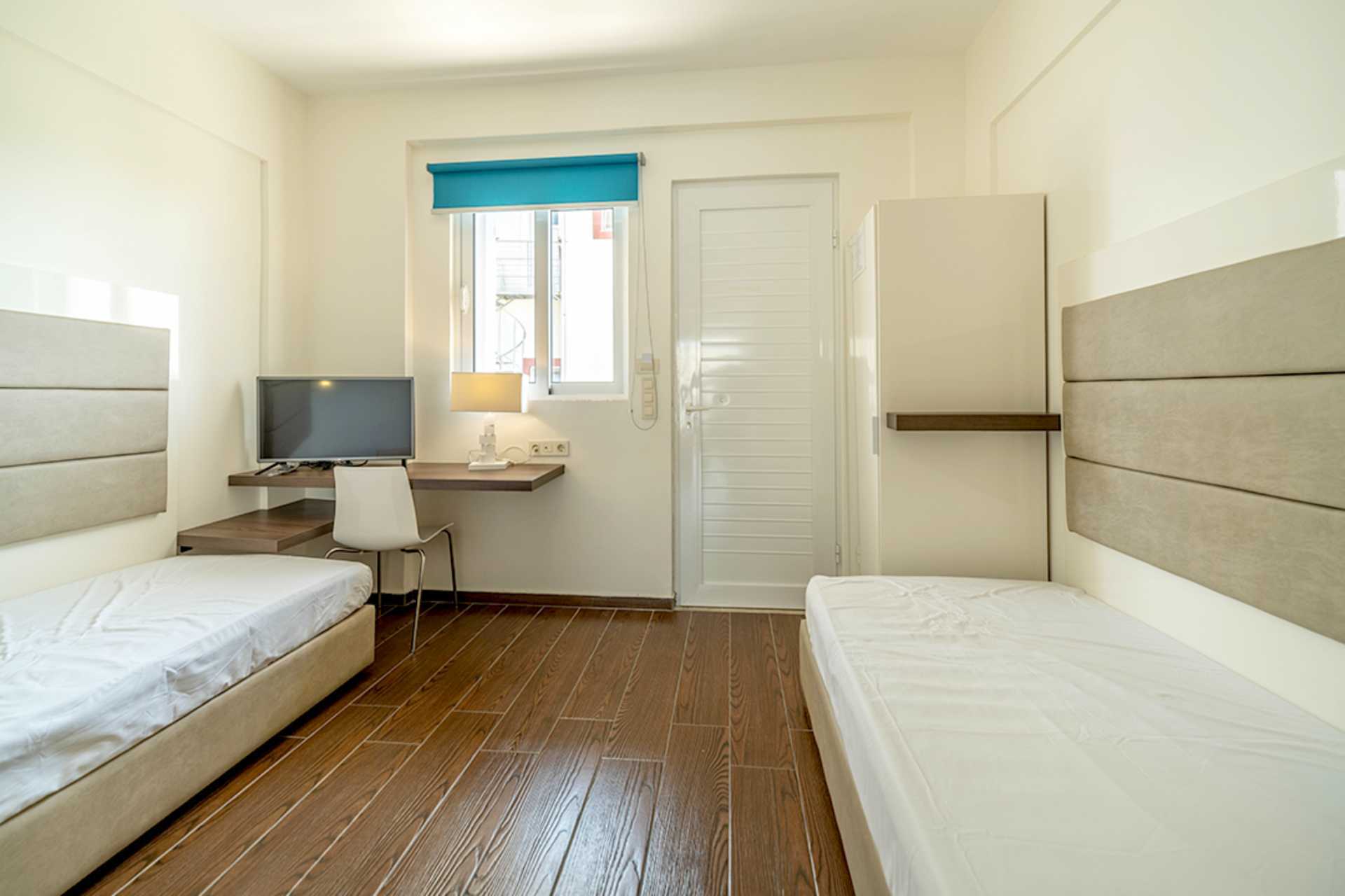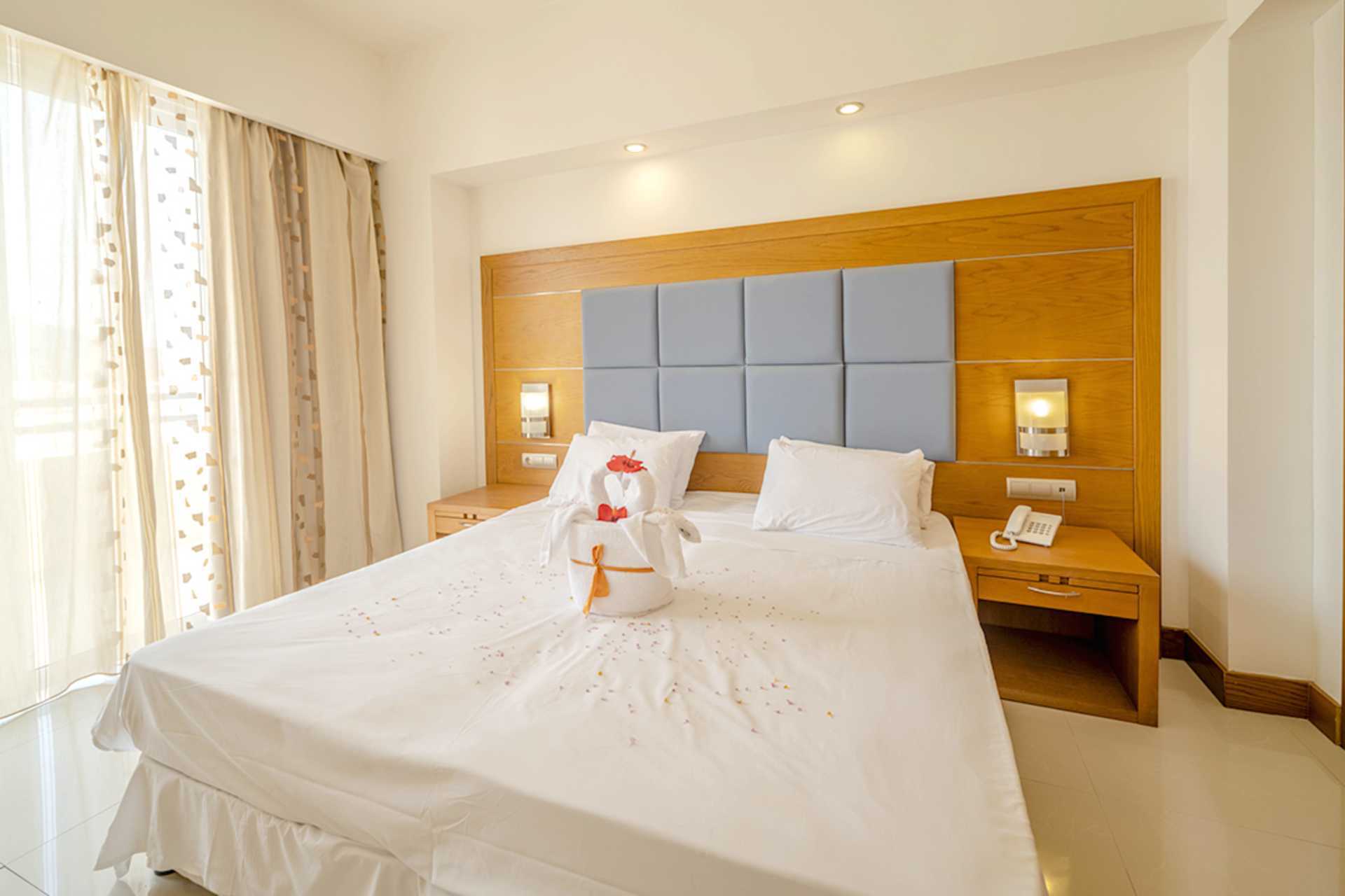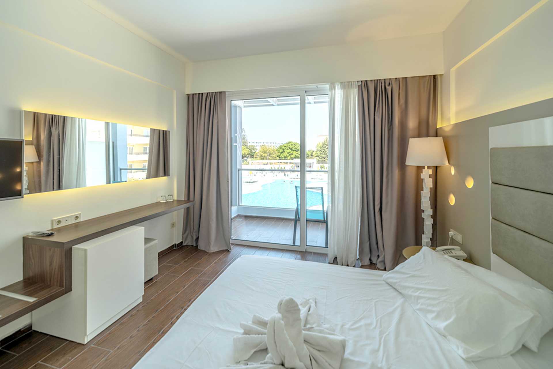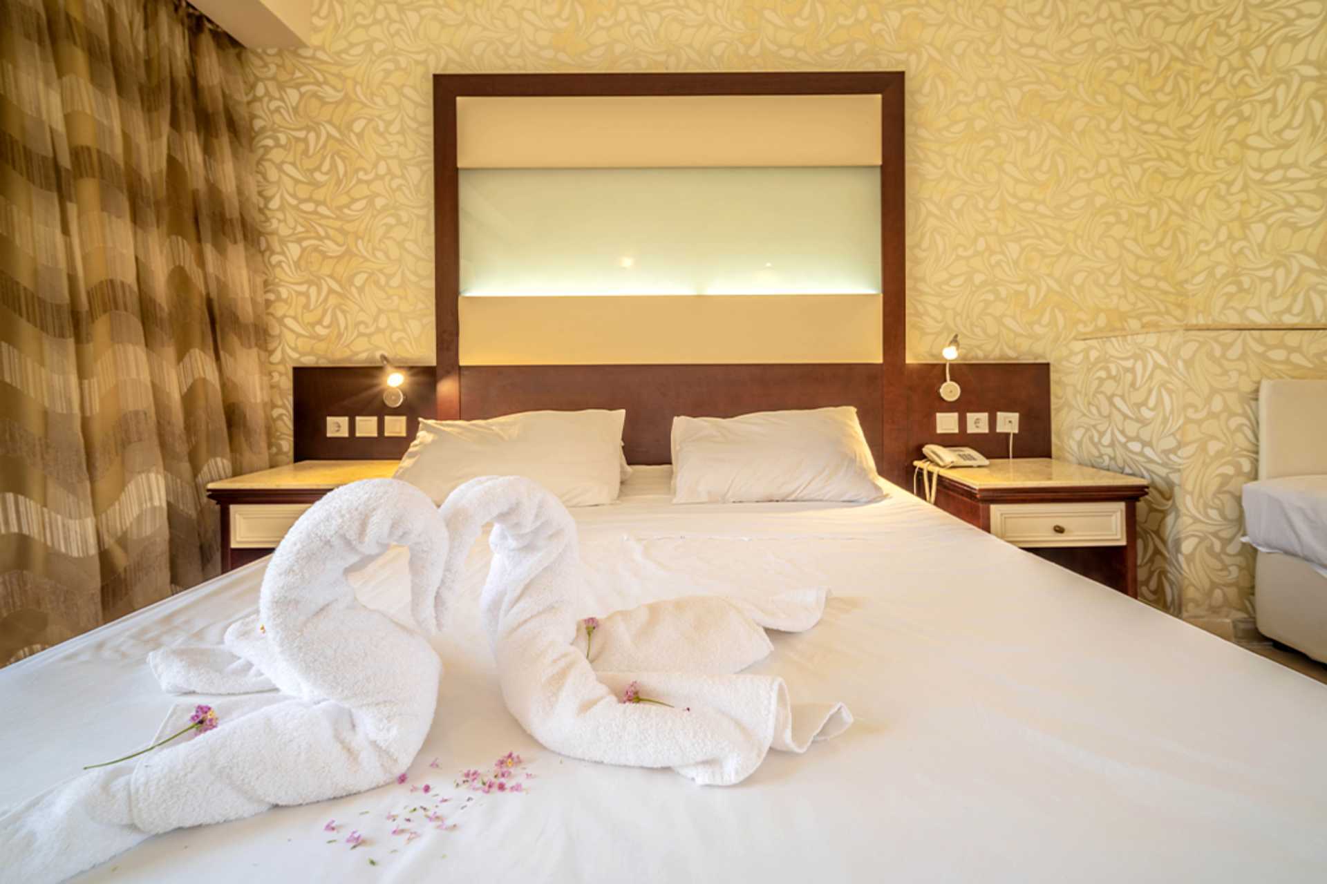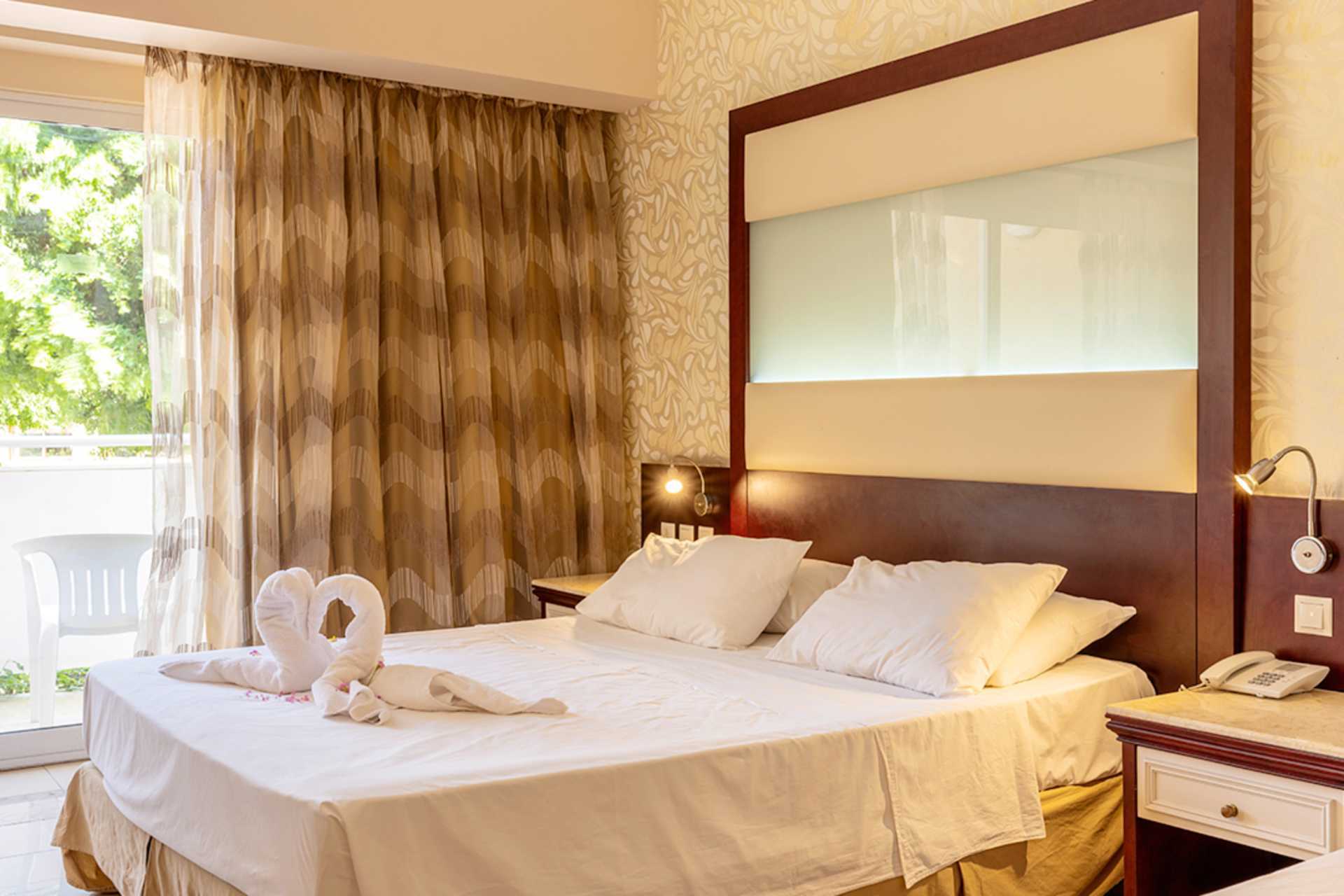 Dubbelrum med balkong, vissa med havsutsikt. En dubbelsäng eller två enkelsängar. Möjlighet till extrabädd i bäddsoffa. Wifi, luftkonditionering och deponering ingår. Luftkonditionering finns tillgängligt från 1 juni till 30 september. Kylskåp. Tv med internationella kanaler. Hårtork. Badrum med badkar eller dusch samt wc. Städning 7 ggr/vecka.