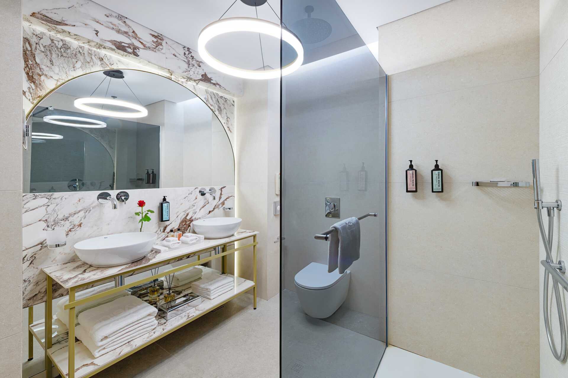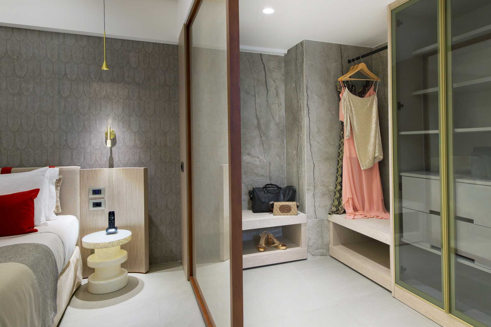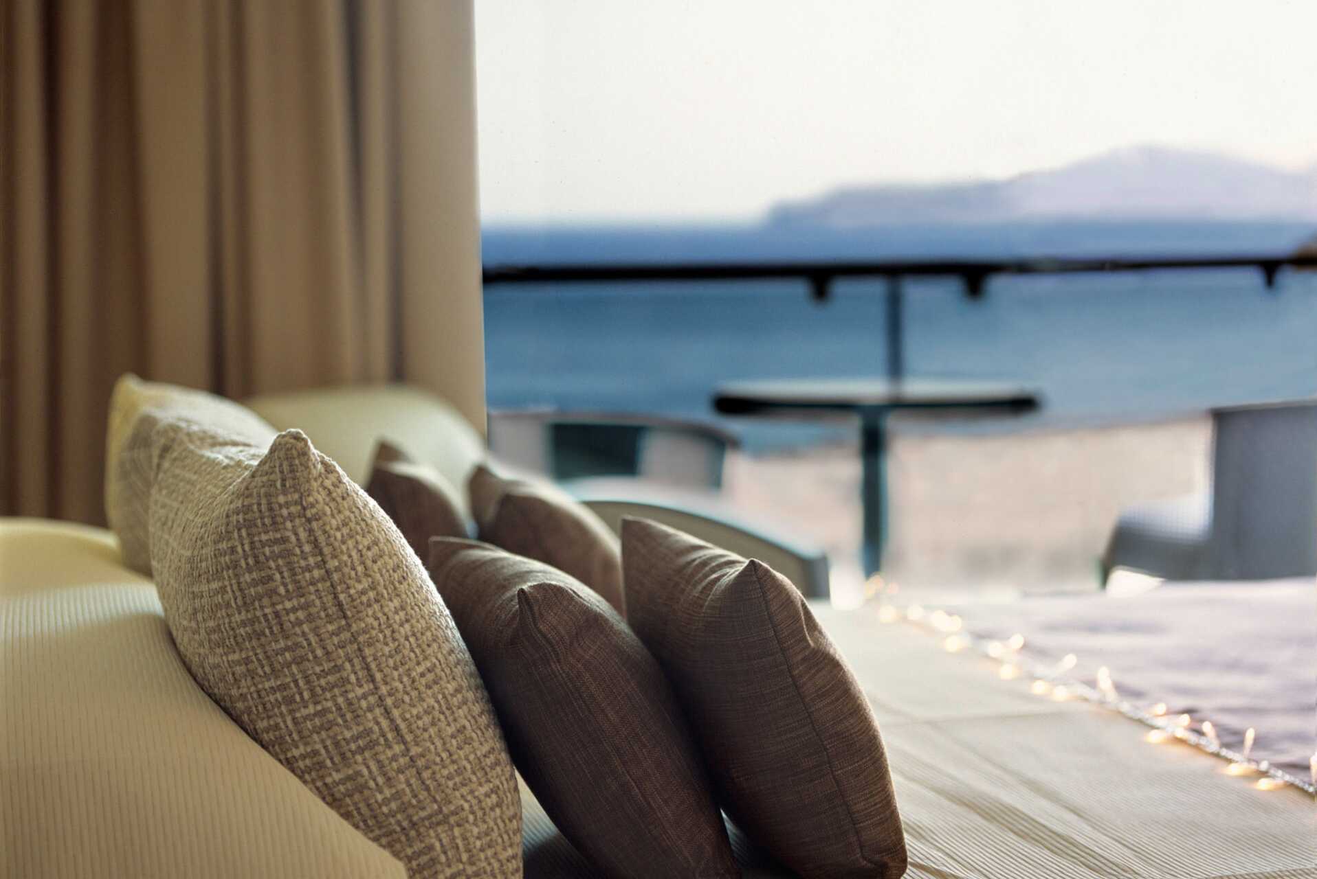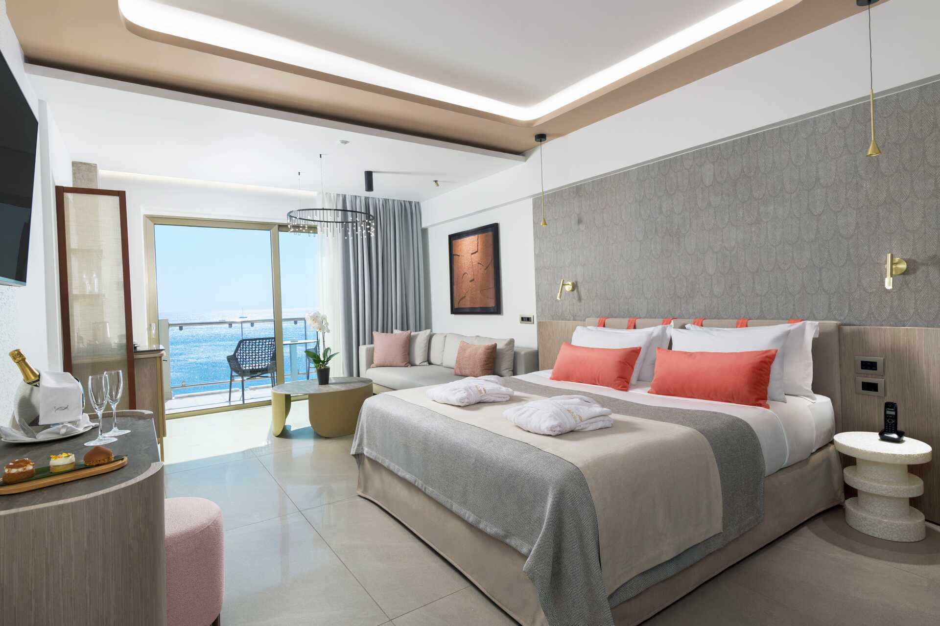 Juniorsvit med balkong och havsutsikt. Juniorsviten består av ett vardagsrum och ett sovrum som separeras med skjutdörrar. En dubbelsäng eller två enkelsängar. Möjlighet till extrabäddar i bäddsoffa. Wifi, luftkonditionering (under högsäsong) och deponering ingår. Nespressomaskin - kapslar ingår. Kylskåp - en flaska vin och en flaska vatten ingår vid ankomst. Vattenkokare samt kaffe och te. Tv med internationella kanaler. Hårtork. Två badrum, varav det ena har jacuzzibadkar och det andra har dusch. Städning 7 ggr/vecka. Barn under två år räknas in i maxantalet personer i rummet.