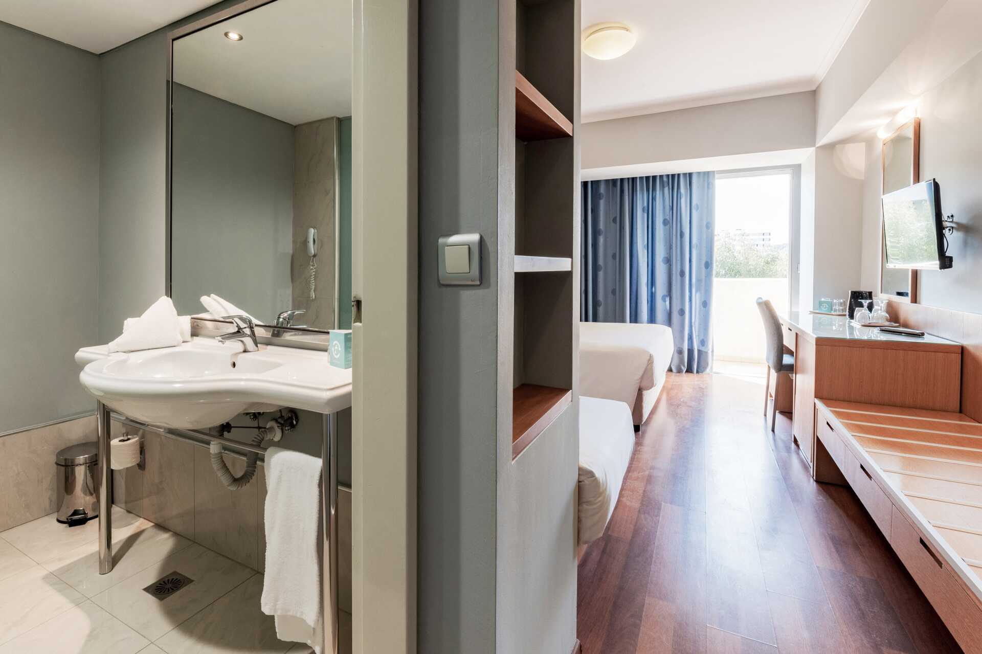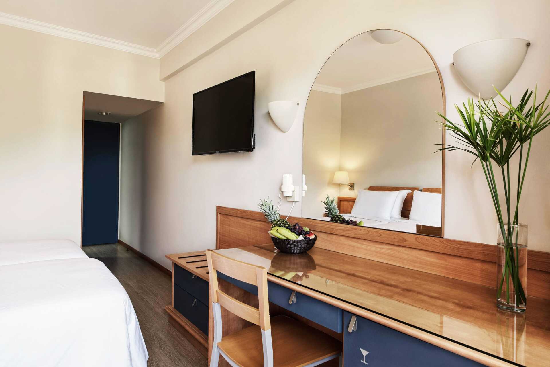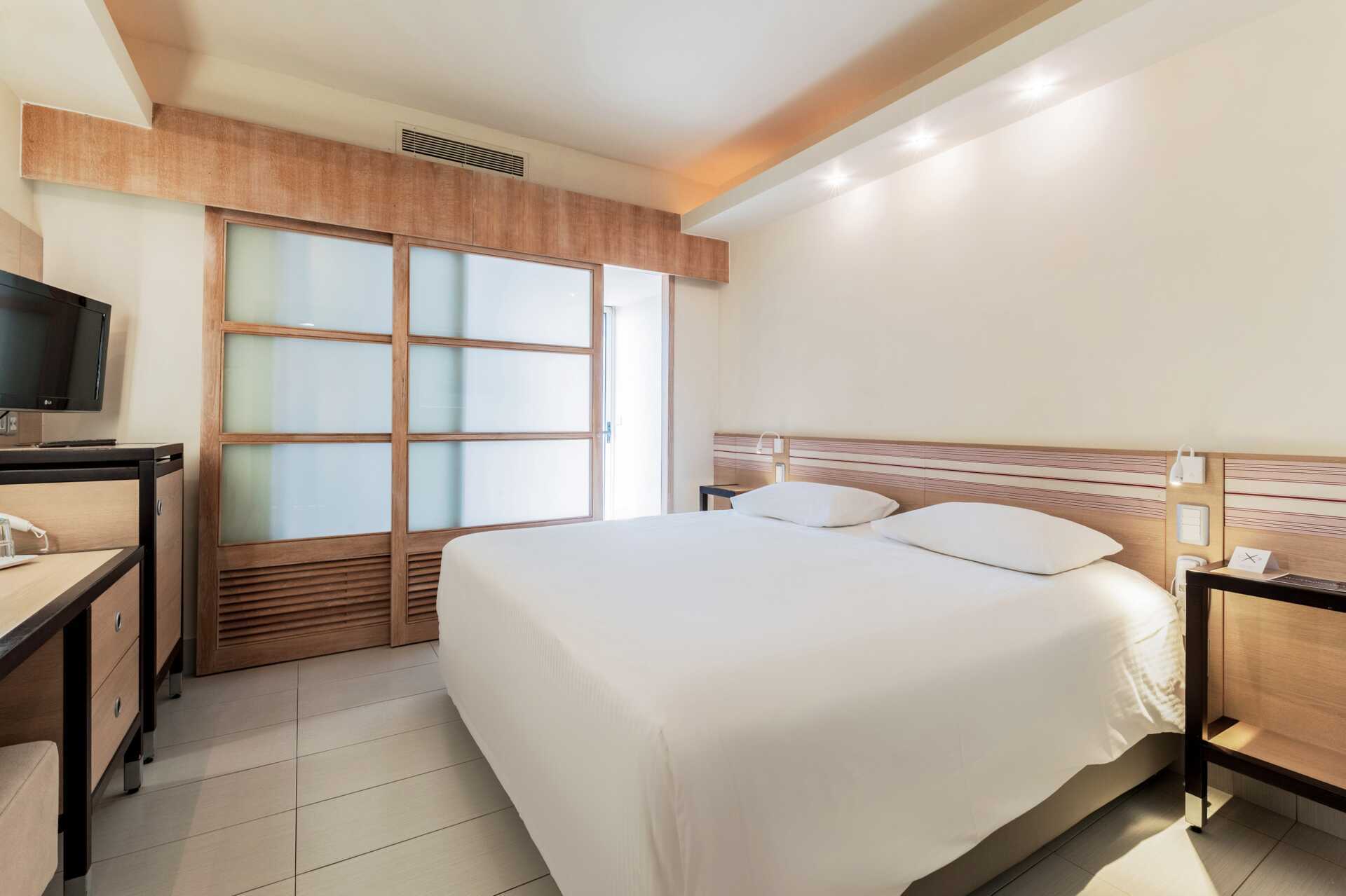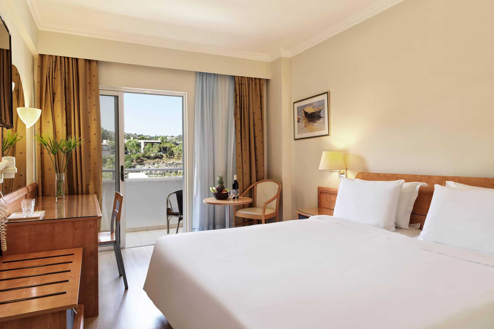 Dubbelrum med balkong eller terrass, vissa med havsutsikt. Rummen är belägna i huvudbyggnaden. En dubbelsäng eller två enkelsängar. Central luftkonditionering (möjlig i perioden 1/6–30/9), wifi och deponering ingår. Kylskåp. Vid ankomst är kylskåpet fyllt med vattenflaskor, läsk och öl som ingår. Tv med internationella kanaler. Badrum med badkar eller dusch samt wc. Städning 7 ggr/vecka. Barn under två är räknas in i max antal personer i rummet.