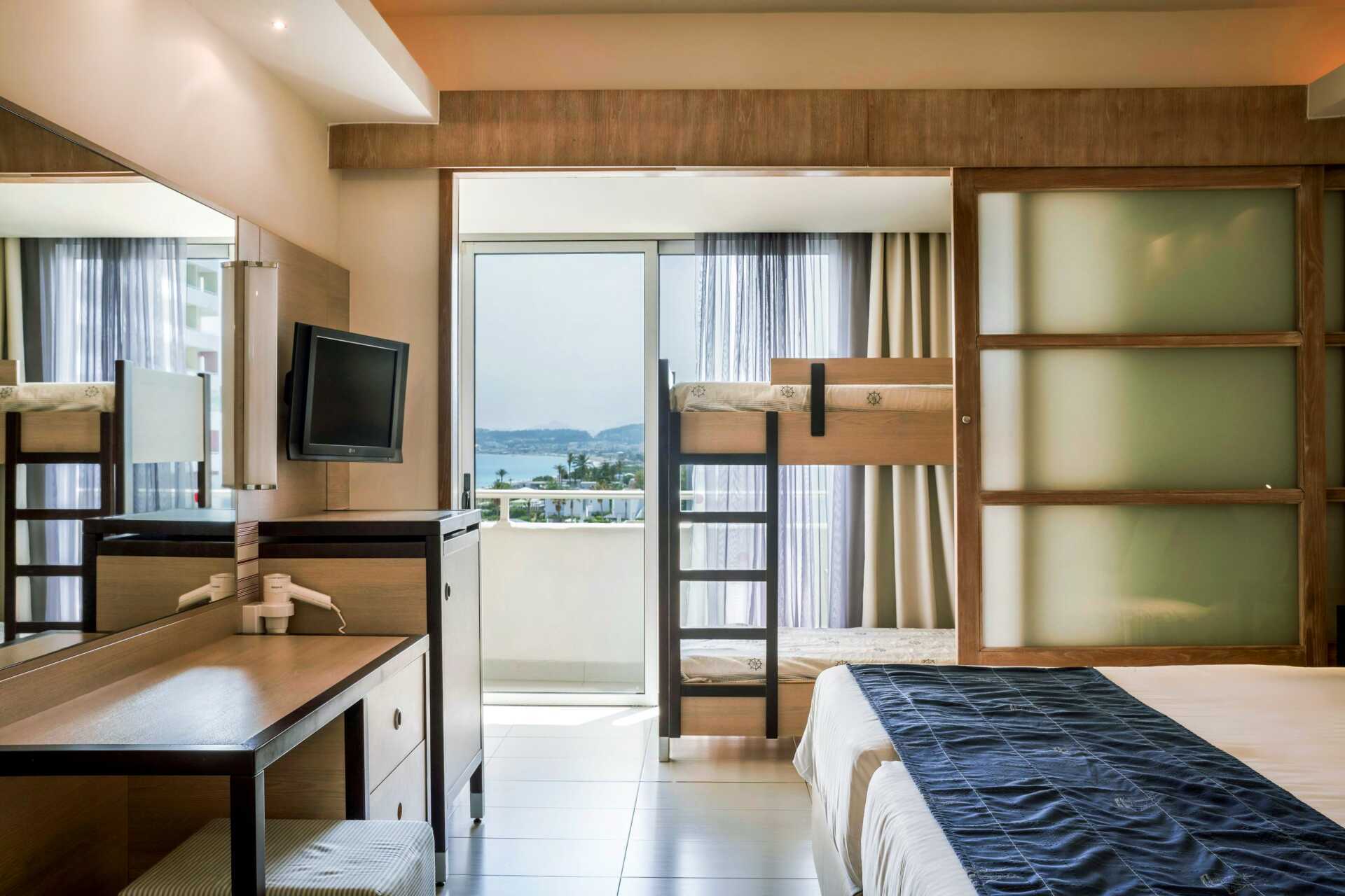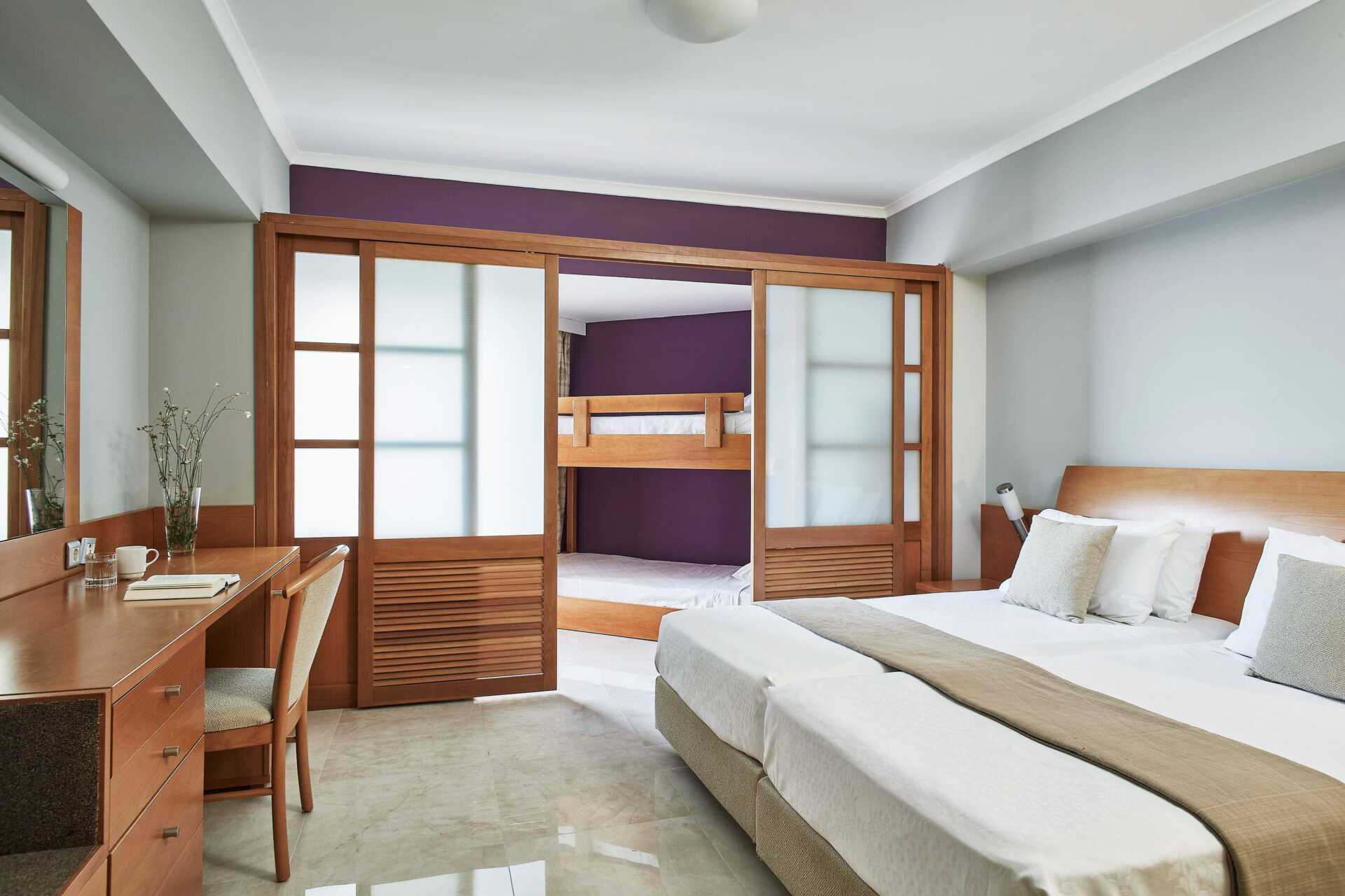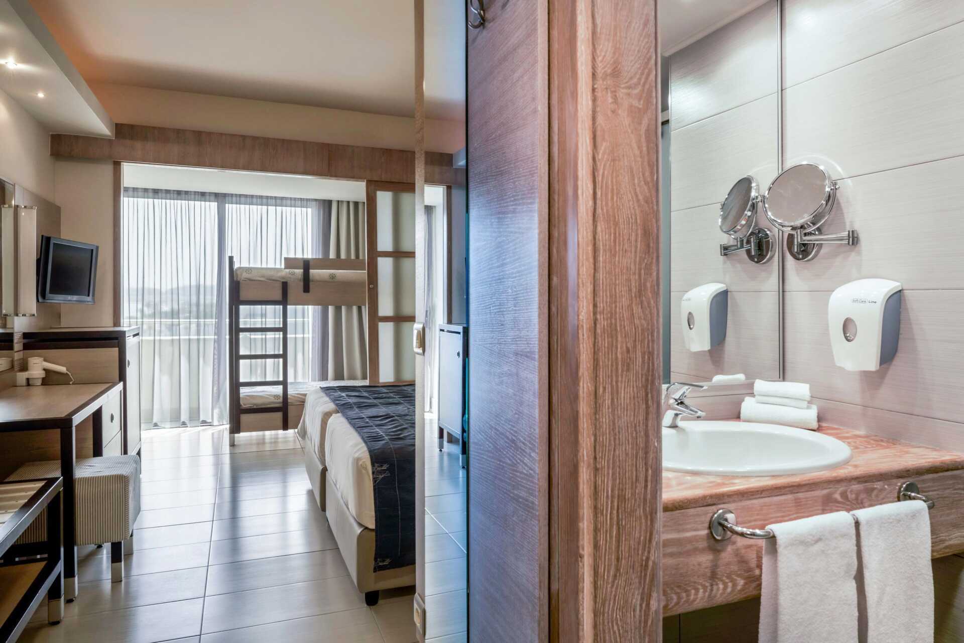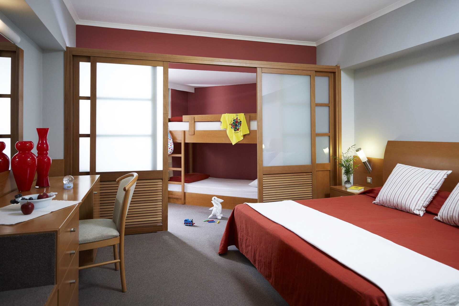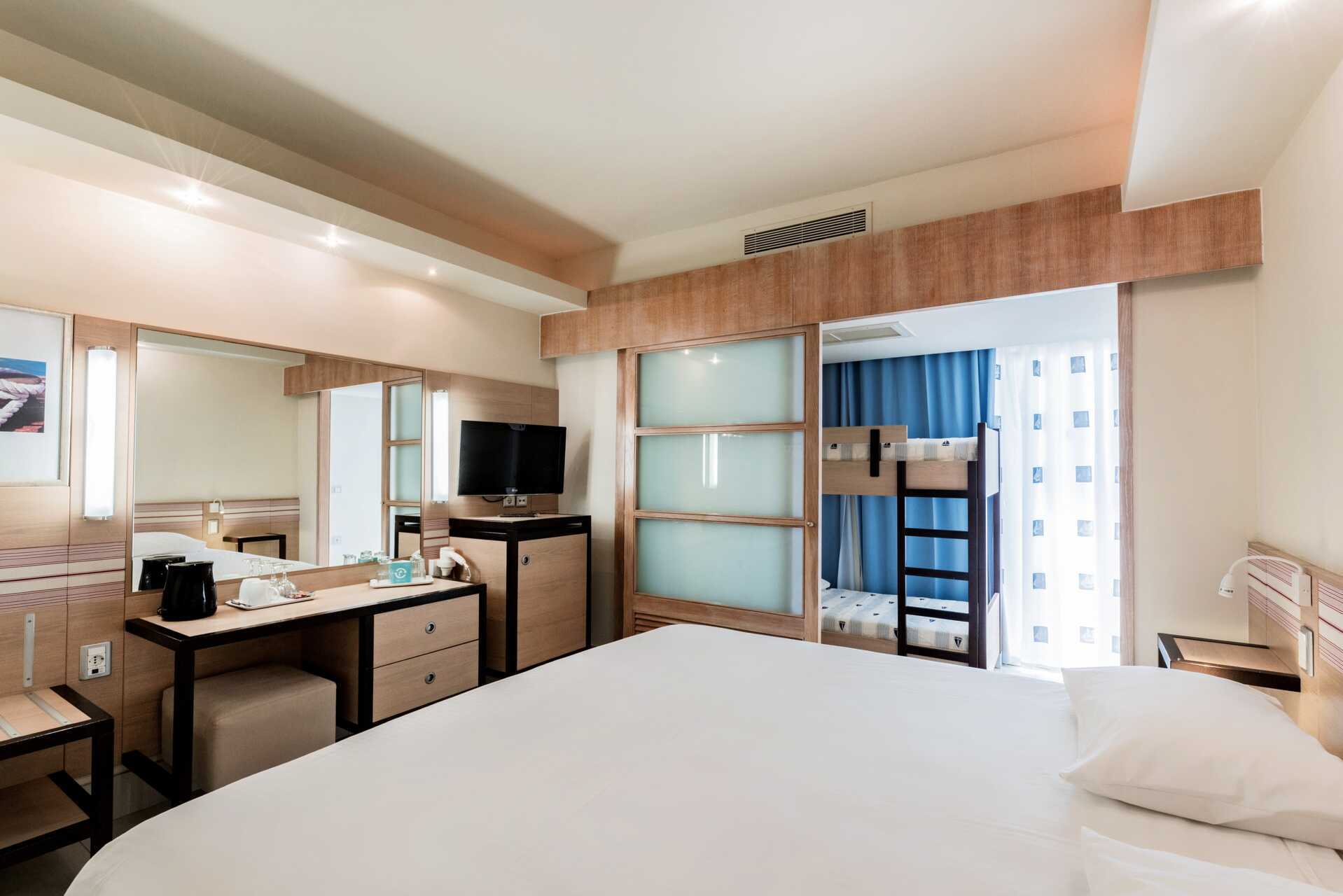 Familjerum med balkong eller terrass. Familjerummen är belägna i hotellets sidobyggnader. En dubbelsäng eller två enkelsängar samt en sovalkov med en våningssäng. Alkoven kan avdelas från sovrummet med skjutdörrar. Central luftkonditionering (möjlig i perioden 1/6–30/9), wifi och deponering ingår. Kylskåp. Vid ankomst är kylskåpet fyllt med vattenflaskor, läsk och öl som ingår. Tv med internationella kanaler. Vissa rum har heltäckningsmatta. Badrum med badkar eller dusch samt wc. Städning 7 ggr/vecka. Barn under två år räknas in i maxantalet personer i rummet.