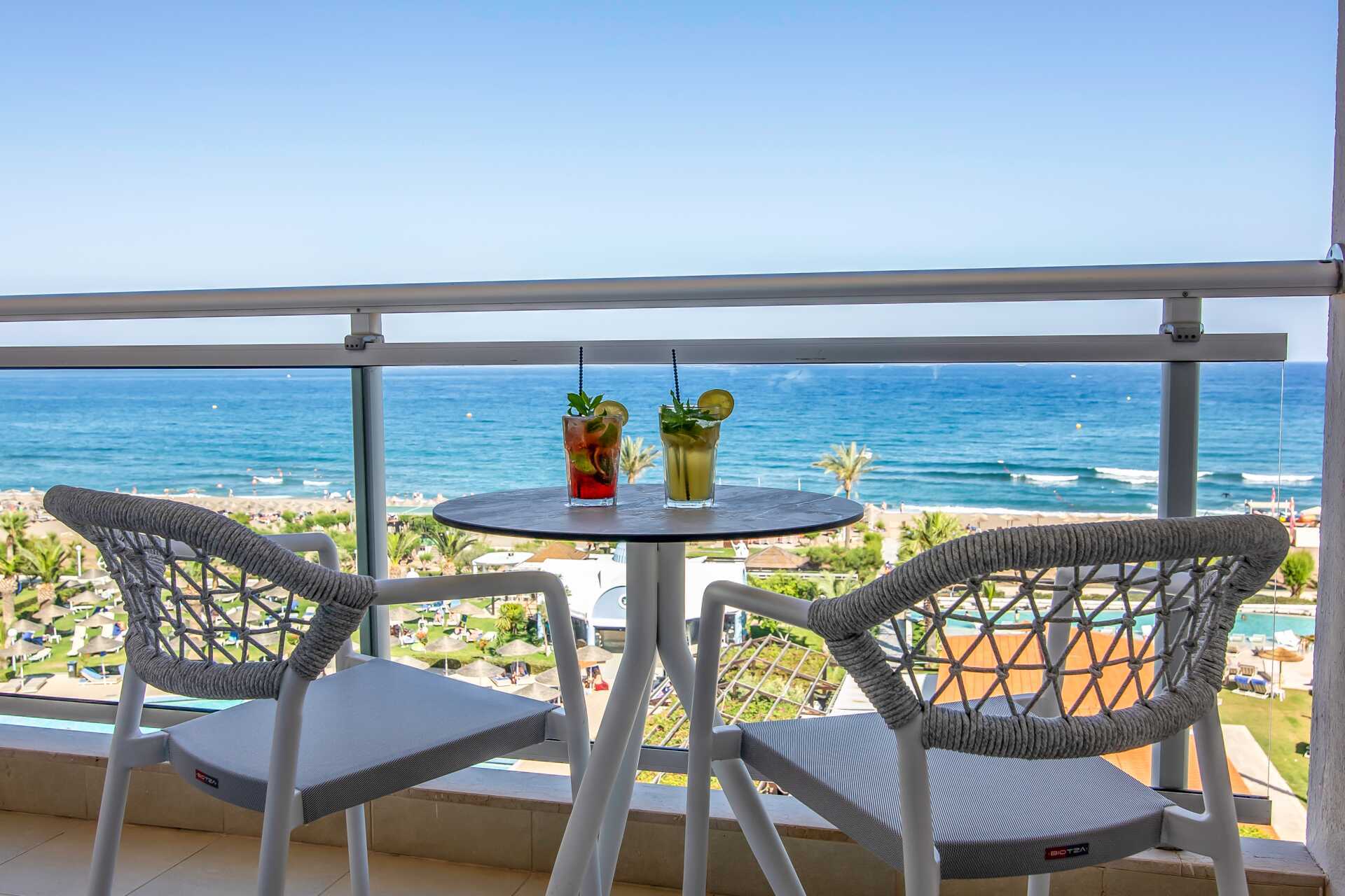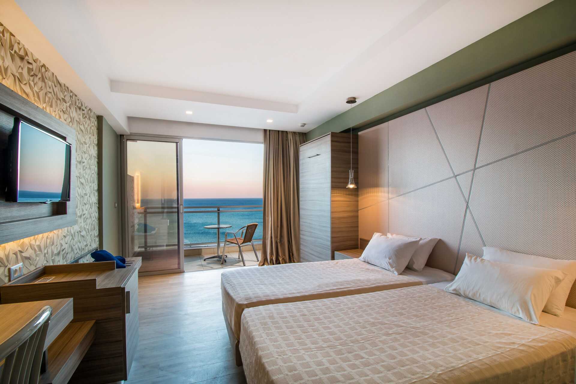 Deluxerum med balkong och havsutsikt. En dubbelsäng elelr två enkelsängar. Wifi, luftkonditionering och deponering ingår. Kylskåp. Vattenkokare samt kaffe och te. Nespressomaskin. Tv med internationella kanaler. Badrockar och tofflor. Hårtork. Badrum med dusch och wc. Städning 7 ggr/vecka.
