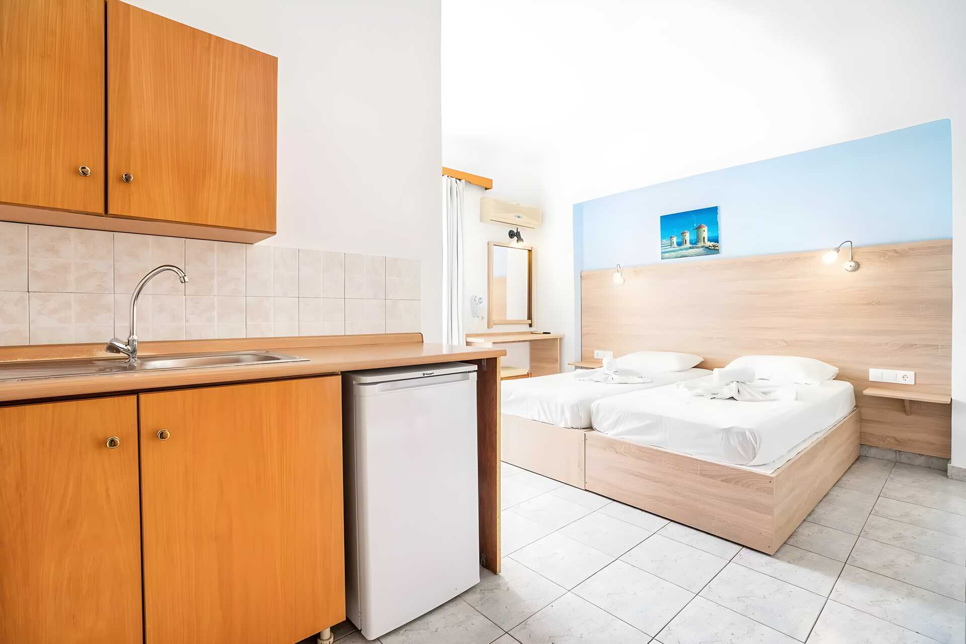 Dubbelrum med balkong. En dubbelsäng eller två enkelsängar. Wifi ingår. Luftkonditionering mot avgift. Kylskåp. Vattenkokare. Tv. Hårtork. Badrum med badkar eller dusch samt wc. Städning 3 ggr/vecka.