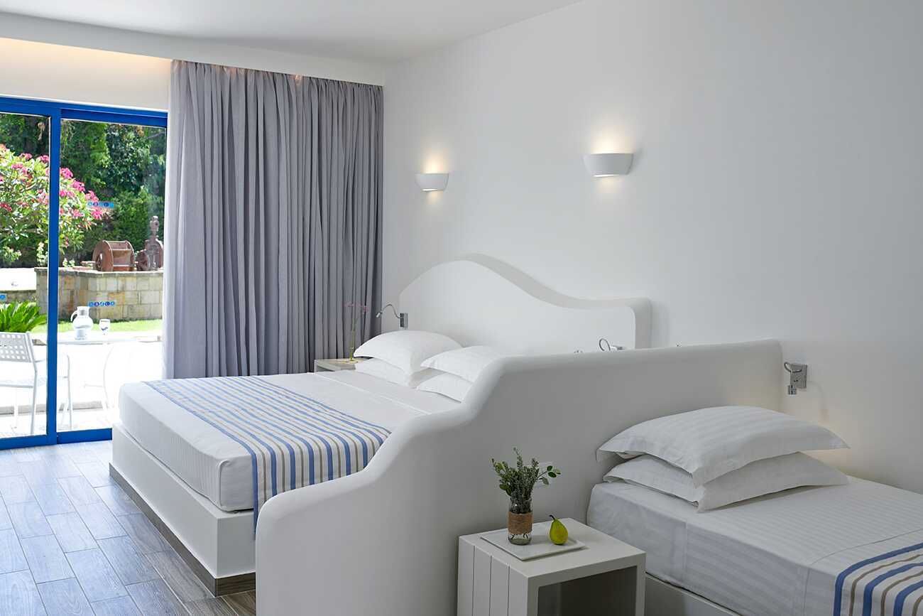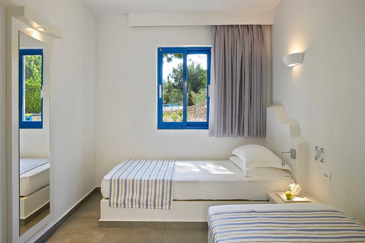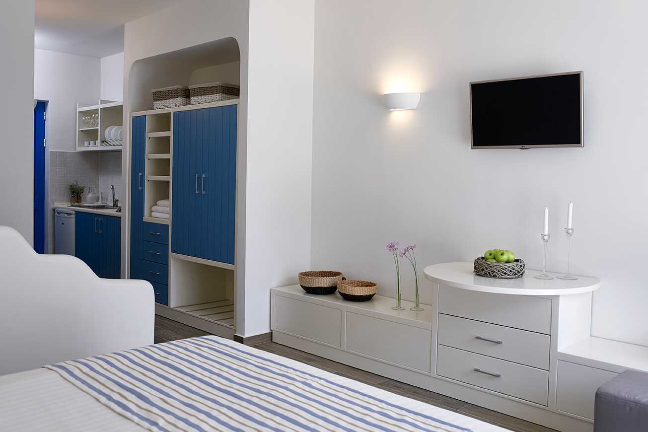 Enrumslägenhet med balkong eller terrass. Sovrum kombinerat med minikök. En dubbelsäng och, i vissa lägenheter, möjlighet till extrabädd i enkelsäng. Minikök med kylskåp, kokplattor, vattenkokare, smörgåsgrill, brödrost och enkel köksutrustning. Wifi och luftkonditionering ingår. Deponering mot avgift. Tv med internationella kanaler. Strykjärn och strykbräda. Hårtork. Badrum med dusch och wc. Städning 6 ggr/vecka.