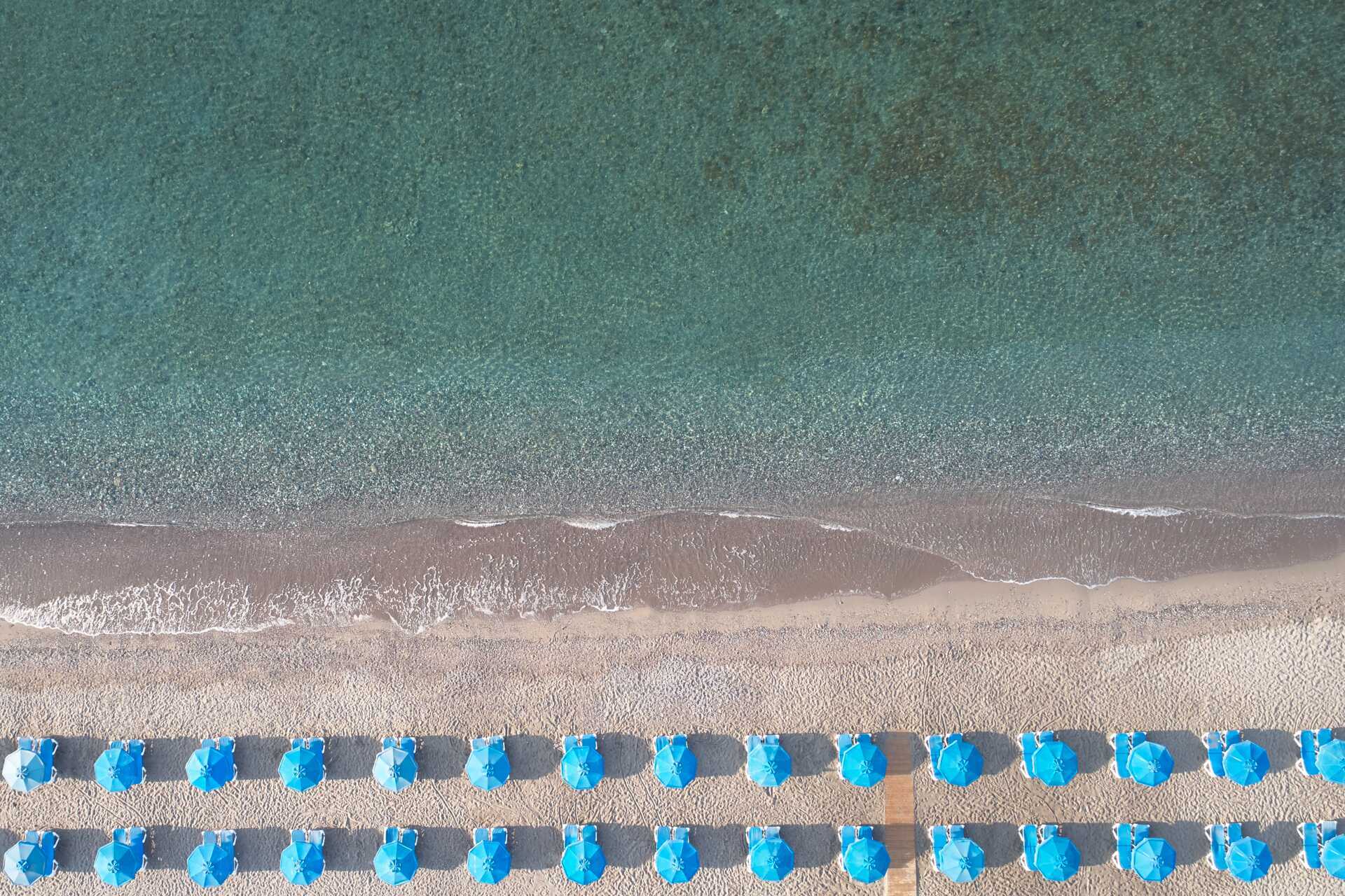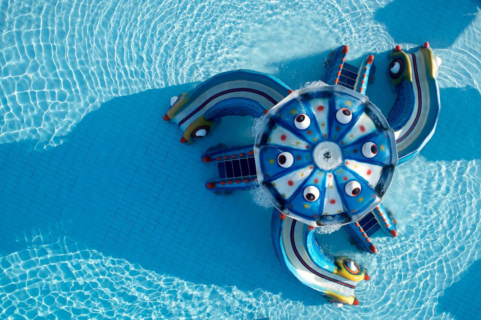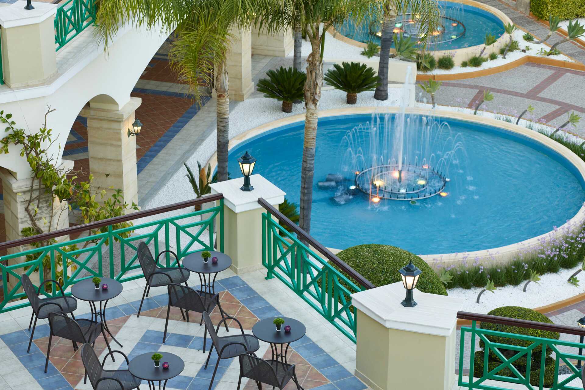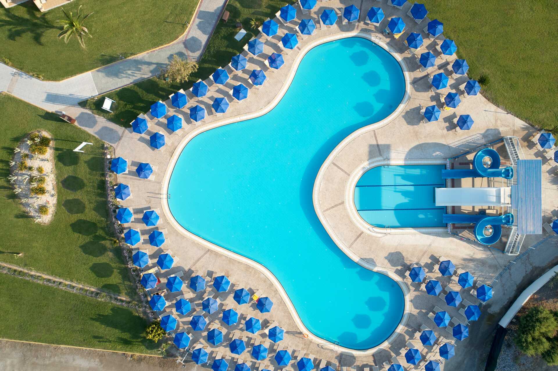 Vidsträckt poolområde med flera pooler och separata barnpooler. Solstolar och parasoller finns att låna vid poolerna och på stranden. Pool-/strandhaddukar finns mot en deposition. Vattenrutschkanor för alla över 10 år. Den Blå Flagg-prisade stranden vid hotellet är en klapperstenstrand med inslag av sand. Det förekommer småsten på stranden och i vattnet. Badskor rekommenderas.