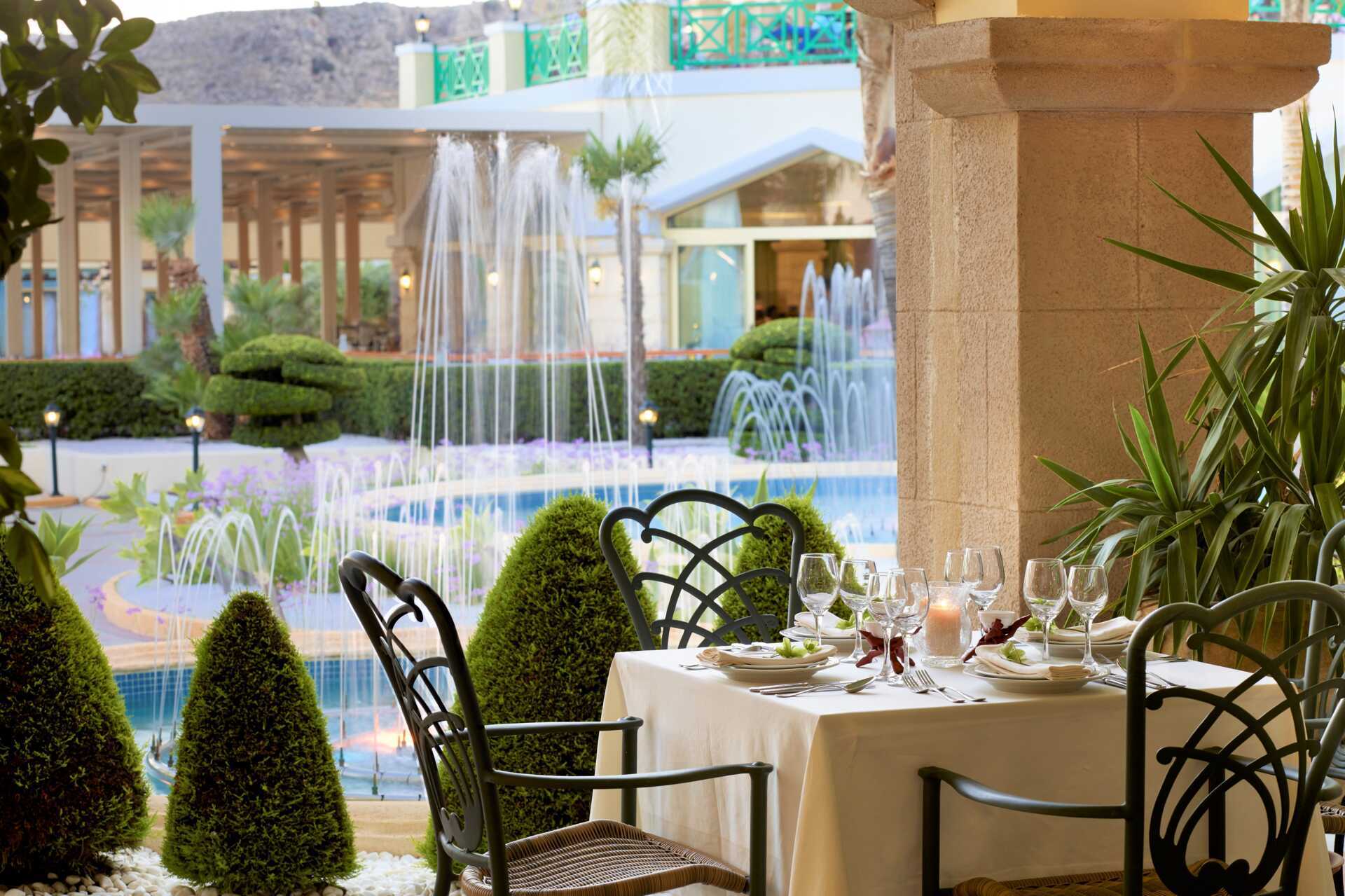 När det kommer till mat och dryck har hotellet mycket att erbjuda. Huvudrestaurangen Spondi lockar med grekisk och internationell mat. Thalassa lockar med smaker från det grekiska köket och L’Osteria med italienska smaker. Aeros Beach Restaurant har bufféer med enklare rätter dagtid och en BBQ-buffé till middag. Vid Street Food Corner kan du få gyros, pizza och andra enklare rätter. Och drycken kan i någon av de fyra barer som finns på hotellet.