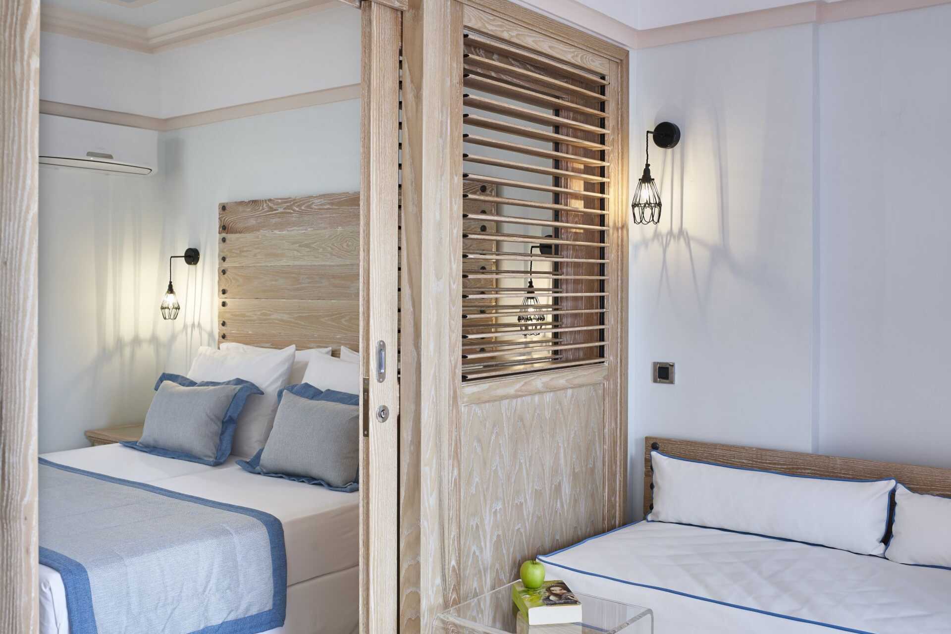 Familjerum med uteplats och utgång till en delad pool. Stege ner i poolen. Familjerummet består av ett sovrum och en vardagsrumsdel med skjutdörrar mellan delarna. En dubbelsäng eller två enkelsängar. Möjlighet till extrabäddar i två enkelsängar/bäddsoffor. Wifi, luftkonditionering och deponering ingår. Minibar - vatten, läsk och öl ingår och fylls på varannan dag. Vattenkokare samt kaffe och te. Tv med internationella kanaler. Badrockar och tofflor. Hårtork. Badrum med badkar och wc. Städning 7 ggr/vecka. Barn under två år räknas in i maxantalet personer i rummet.