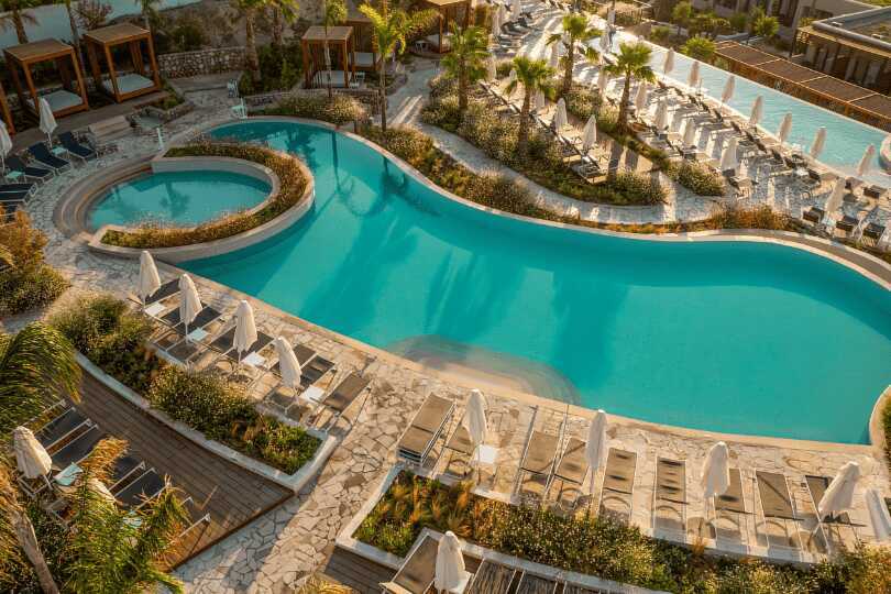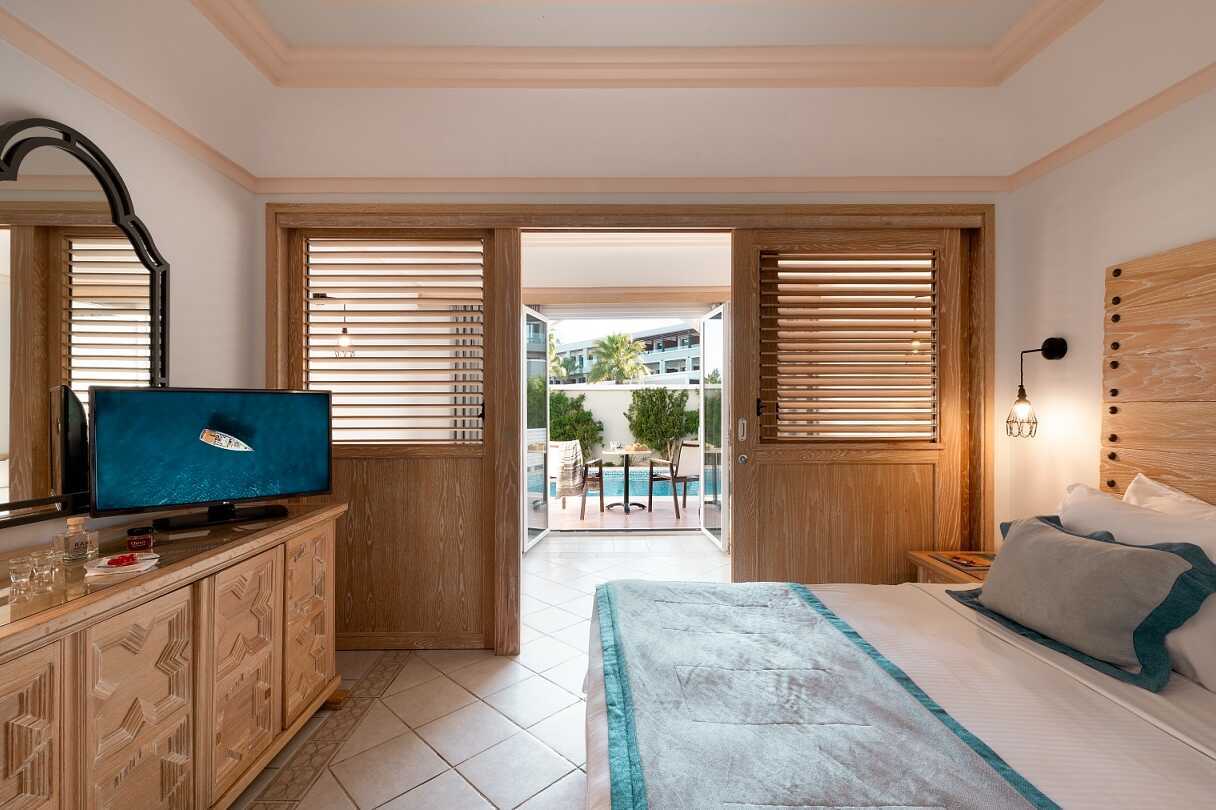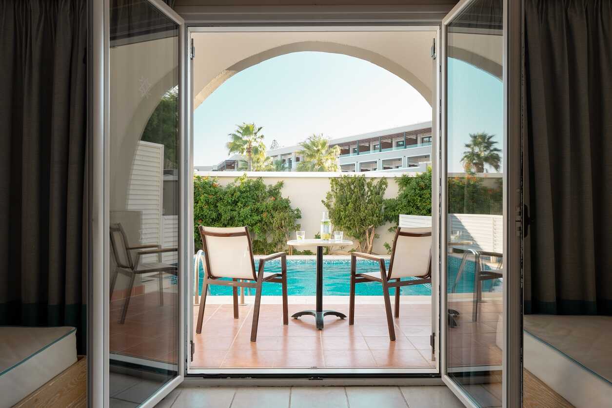Superiorrum med uteplats och privat pool. En dubbelsäng eller två enkelsängar. Möjlighet till extrabädd i enkelsäng eller i bäddsoffa. Wifi, luftkonditionering och deponering ingår. Minibar - vatten, läsk och öl ingår och fylls på varannan dag. Vattenkokare samt kaffe och te. Nespresso kaffemaskin - ingår och fylls på dagligen. Tv med internationella kanaler. Badrockar och tofflor. Hårtork. Badrum med badkar och wc. Städning 7 ggr/vecka. Barn under två år räknas in i maxantalet personer i rummet.