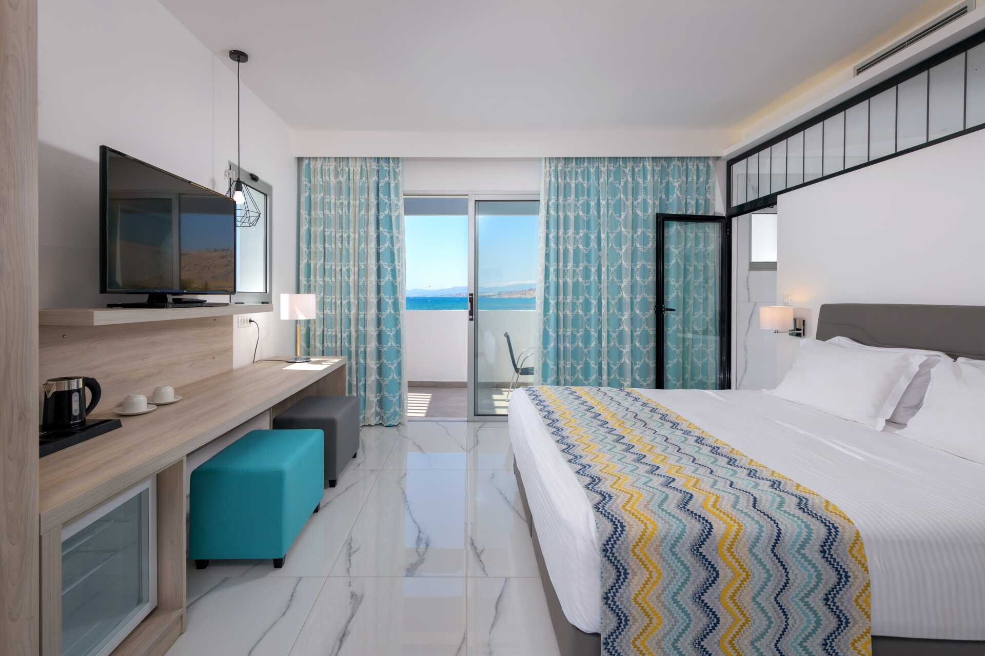 Deluxerum med balkong eller terrass och med havsutsikt. En dubbelsäng. Wifi och luftkonditionering ingår. Deponering mot avgift. Kylskåp. Vattenkokare samt kaffe och te. Tv med internationella kanaler. Hårtork. Badrum med dusch och wc. Städning 7 ggr/vecka.