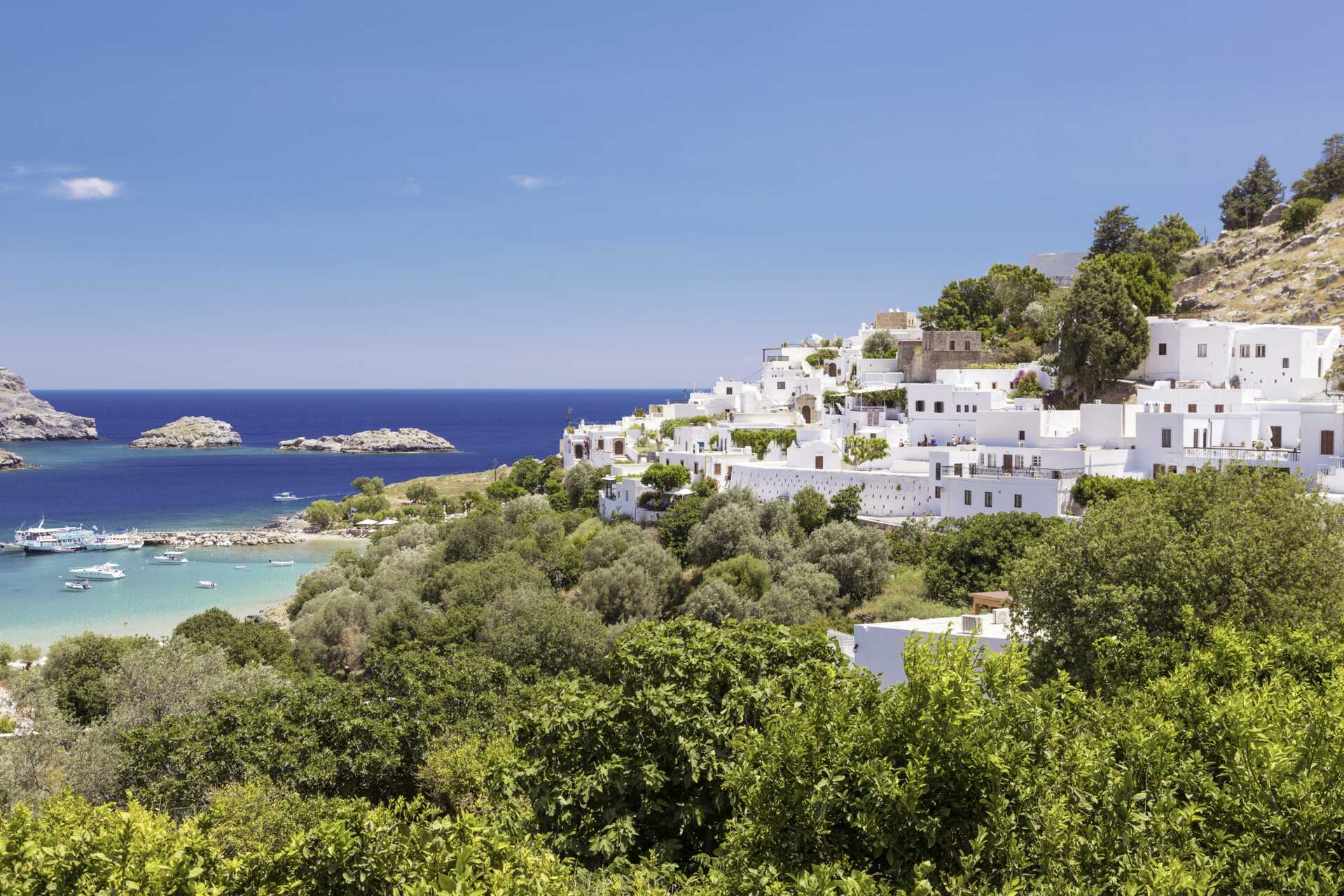 Det är inte svårt att förstå varför Lindos brukar kallas för ”den vita byn” – de vitkalkade små husen ligger längs smala gränder som letar sig uppför slänten. Här är det trevligt att strosa runt och kanske slå sig ner på ett café med en svalkande glass och njuta av den fantastiska havsutsikten.