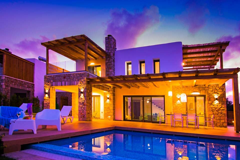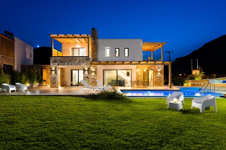 Villan är fördelad på två våningar och rymmer bekvämt upp till 6 personer. Bottenvåningen består av 1 luftkonditionerat sovrum med eget badrum, ett vardagsrum med en bekväm sittgrupp, utrustat med en stor platt-TV, ett öppet fullt utrustat kök med matplats och en gästtoalett. Vardagsrummet öppnar upp mot en stor möblerad veranda med grillmöjligheter där du kan koppla av och njuta av den magnifika utsikten över det blå havet och trädgården. Här hittar du också en stor privat uppvärmd pool, utrustad med jacuzzi, solstolar och parasoller.