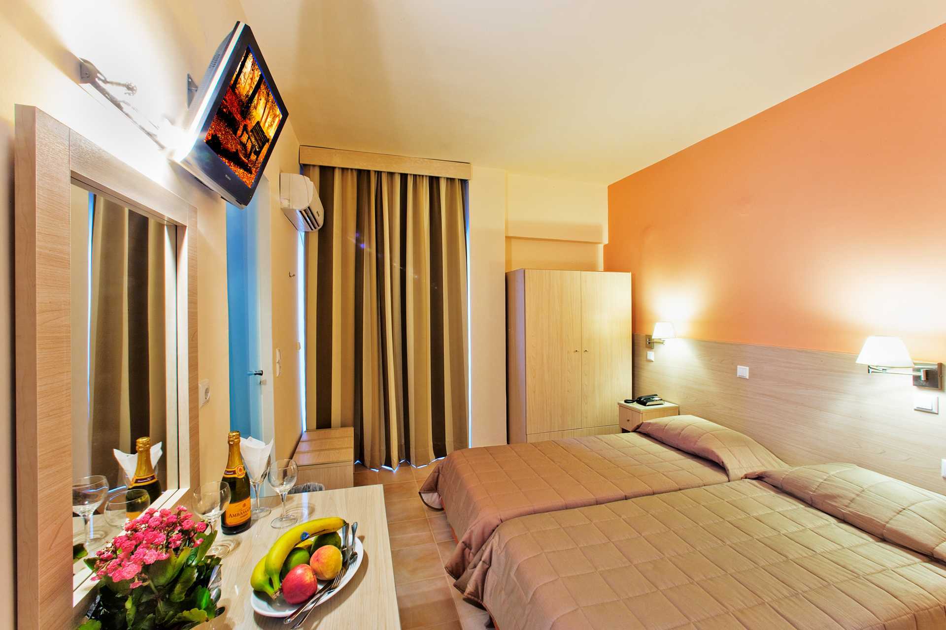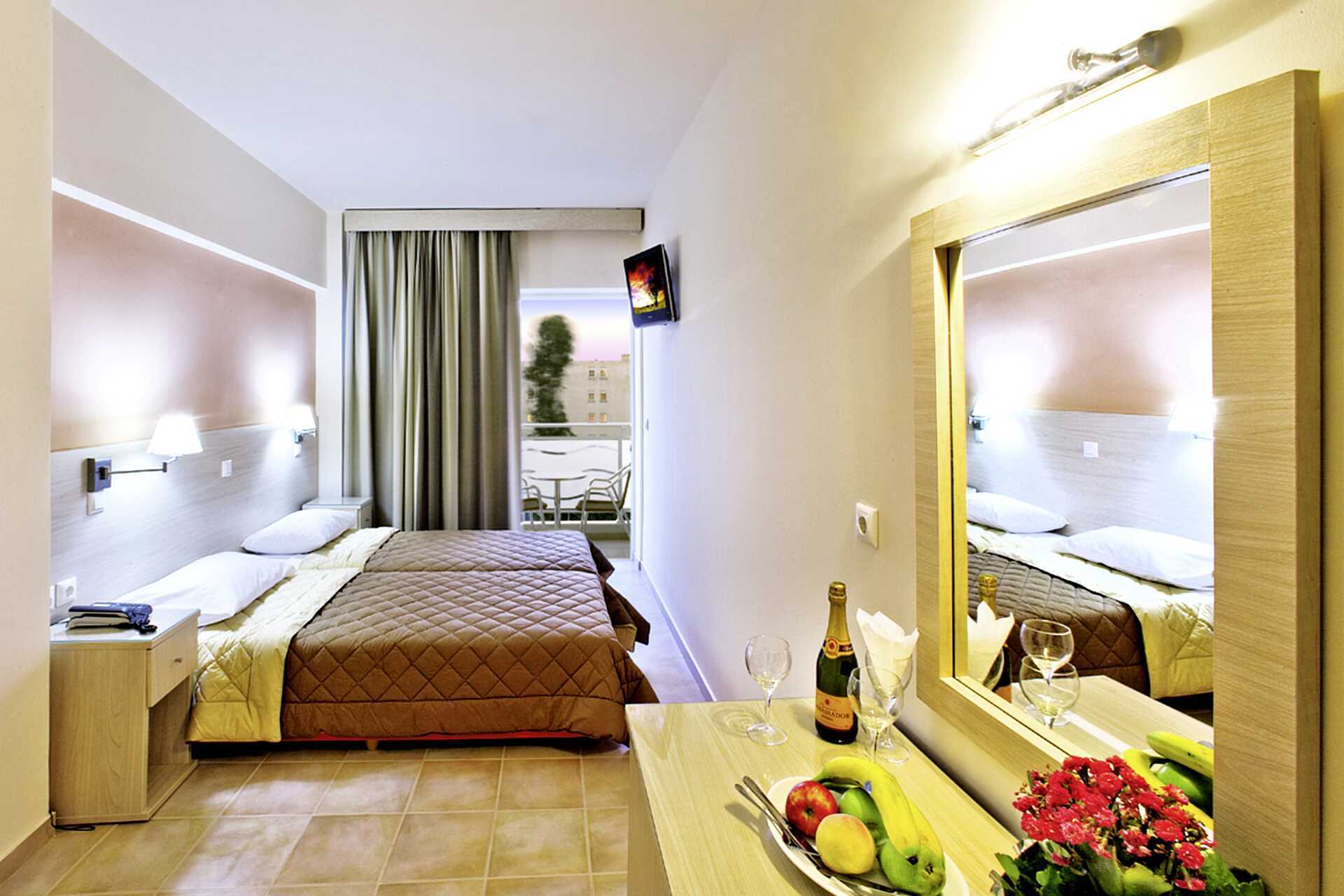Dubbelrum med balkong. Två breda enkelsängar. Wifi ingår. Luftkonditionering och deponering mot avgift. Kylskåp. Tv med internationella kanaler. Hårtork. Badrum med dusch och wc. Städning 7 ggr/vecka.