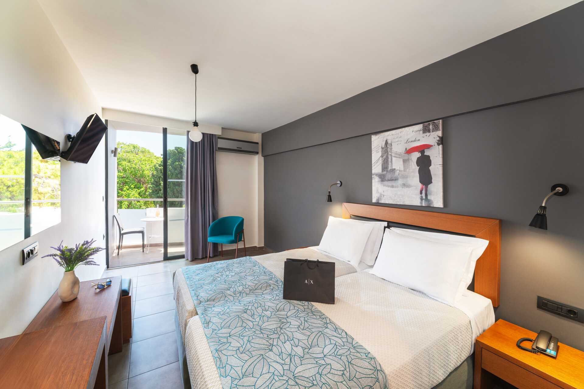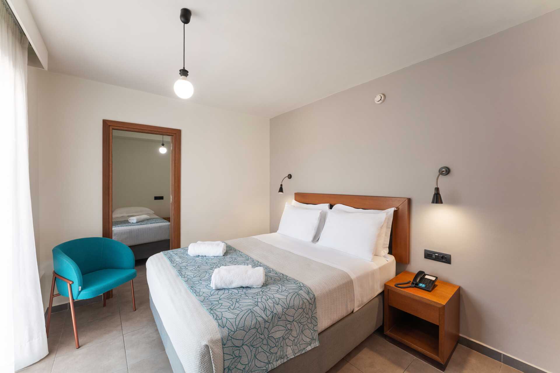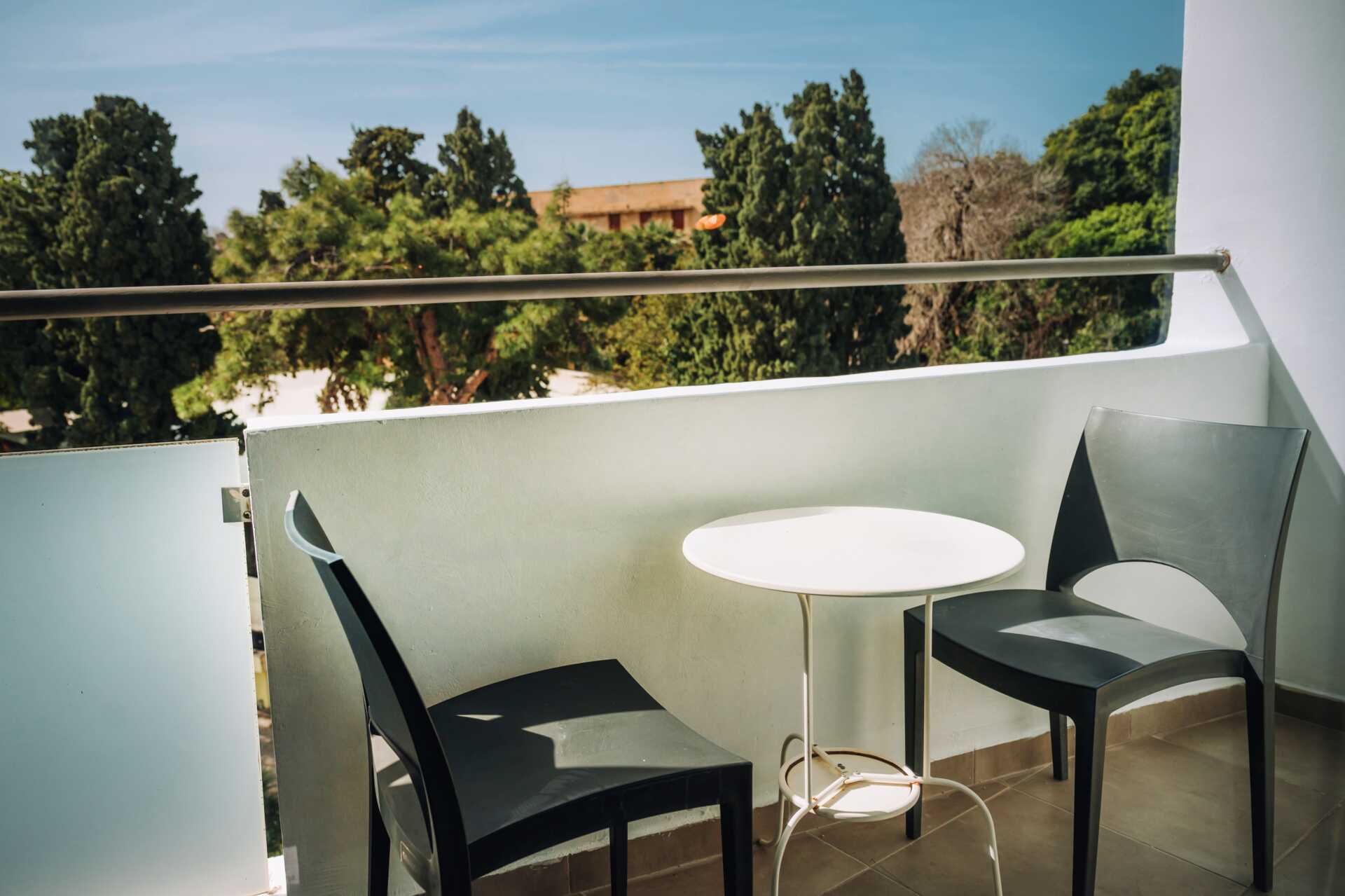 Dubbelrum med balkong i varierande storlekar. Två enkelsängar. Möjlighet till extrabädd i bäddsoffa. Kylskåp och vattenkokare. Tv med internationella kanaler. Wifi och luftkonditionering ingår. Deponering mot avgift. Hårtork. Badrum med dusch och wc. Städning 7 ggr/vecka.