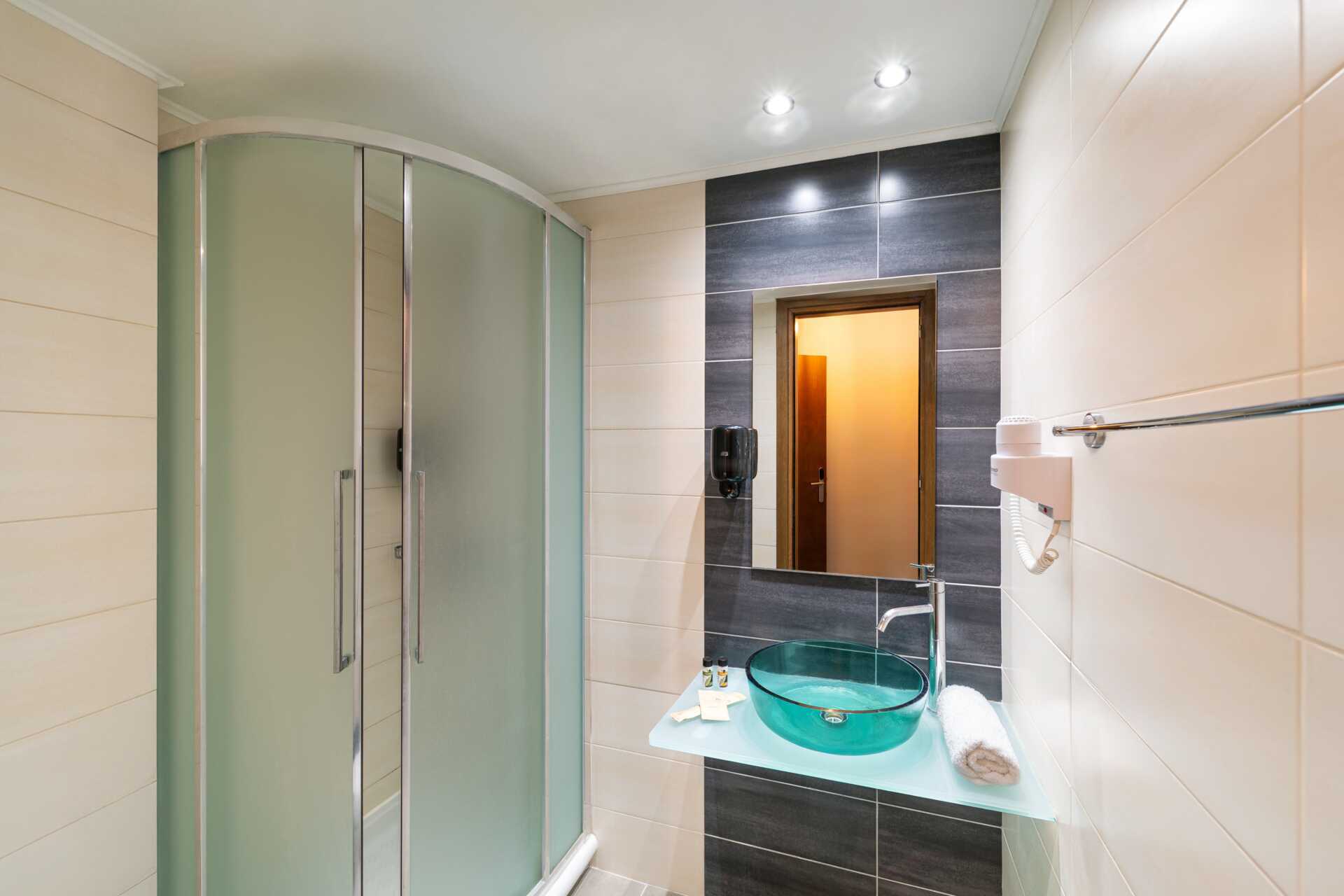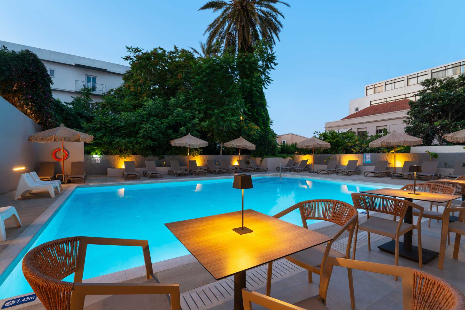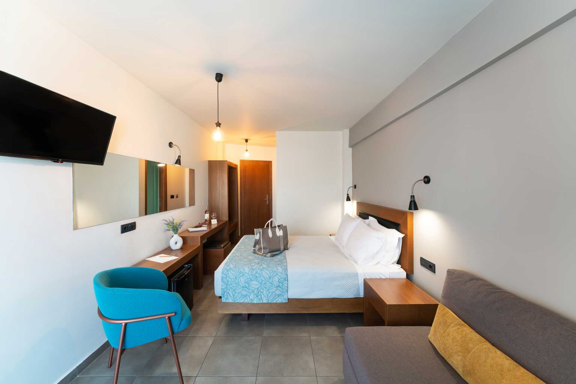 Dubbelrum med balkong i varierande storlekar. Två enkelsängar. Möjlighet till extrabädd i bäddsoffa. Kylskåp och vattenkokare. Tv med internationella kanaler. Wifi och luftkonditionering ingår. Deponering mot avgift. Hårtork. Badrum med dusch och wc. Städning 7 ggr/vecka.