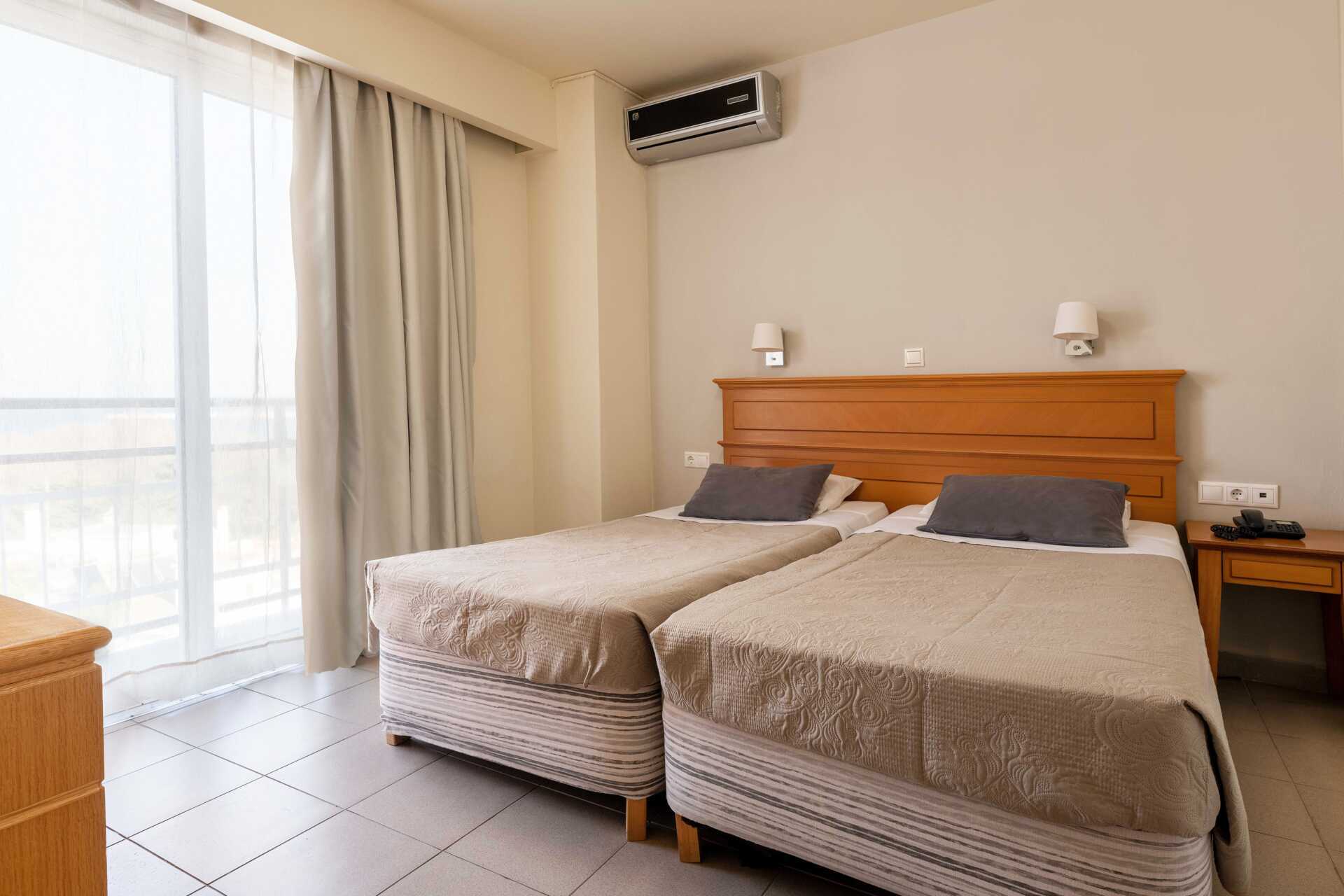 Dubbelrum med balkong. En dubbelsäng eller två enkelsängar. Wifi, luftkonditionering och deponering ingår. Kylskåp. Tv med internationella kanaler. Hårtork. Badrum med dusch och wc. Städning 7 ggr/vecka.