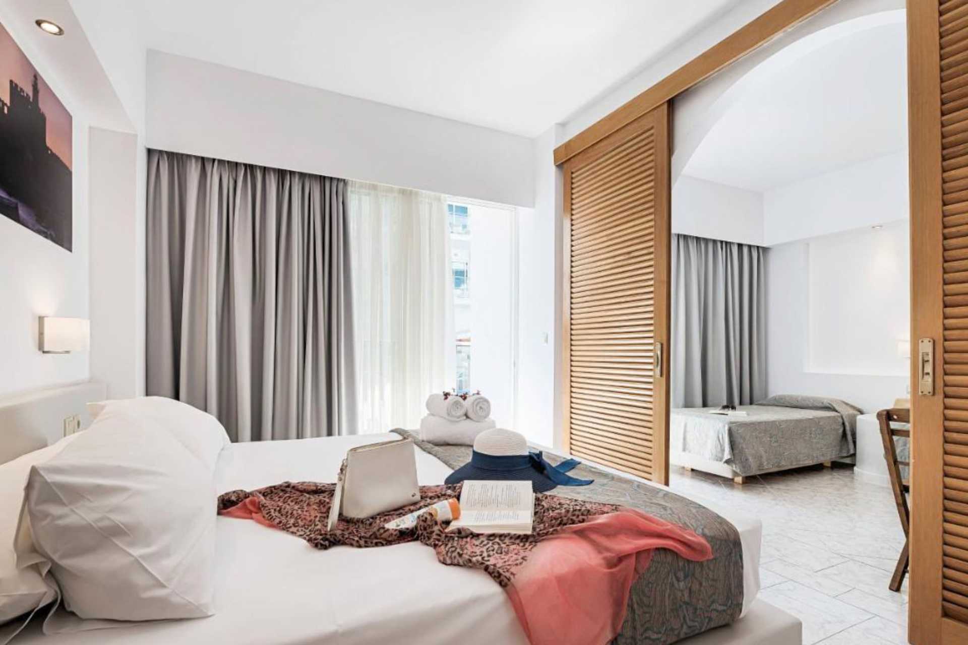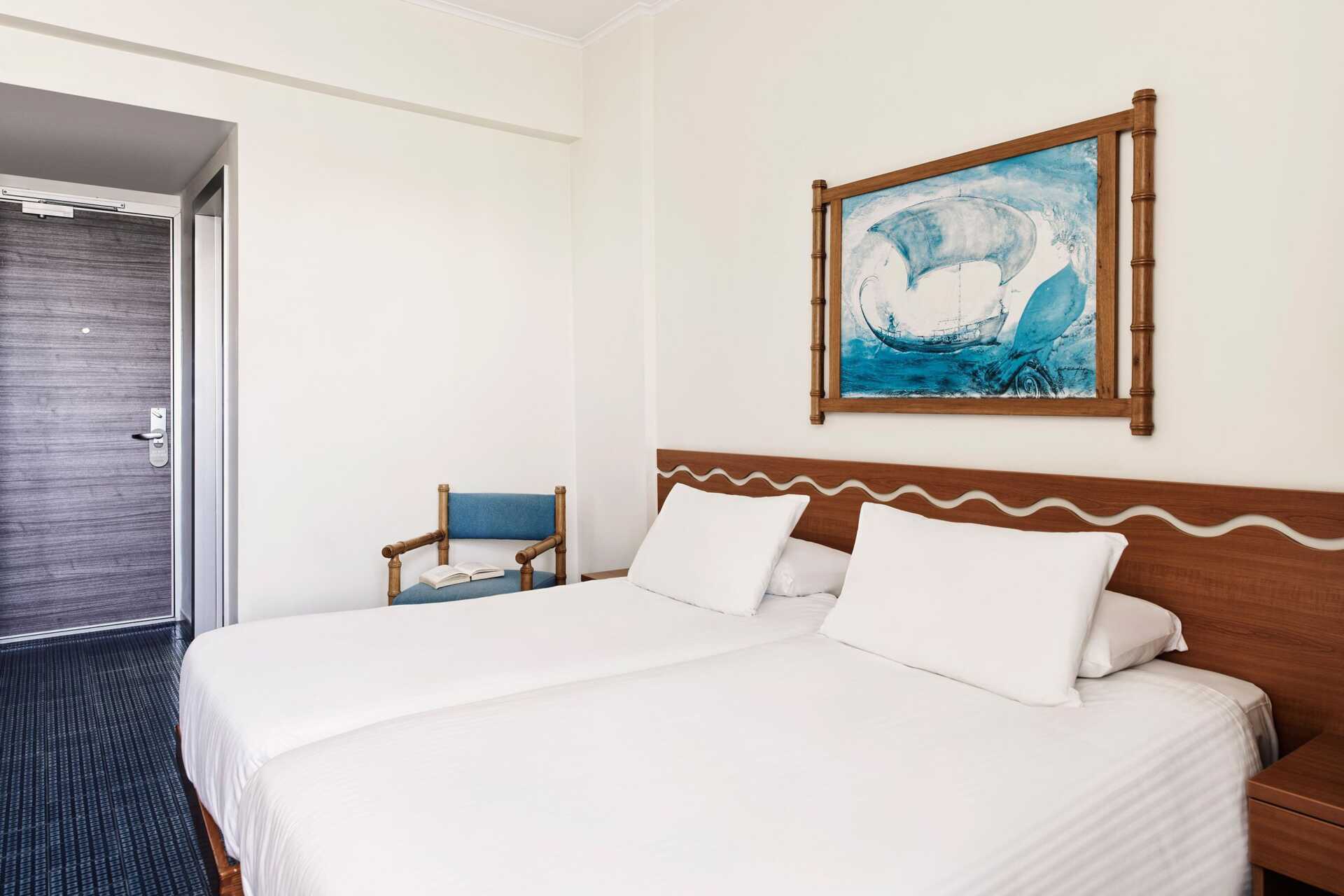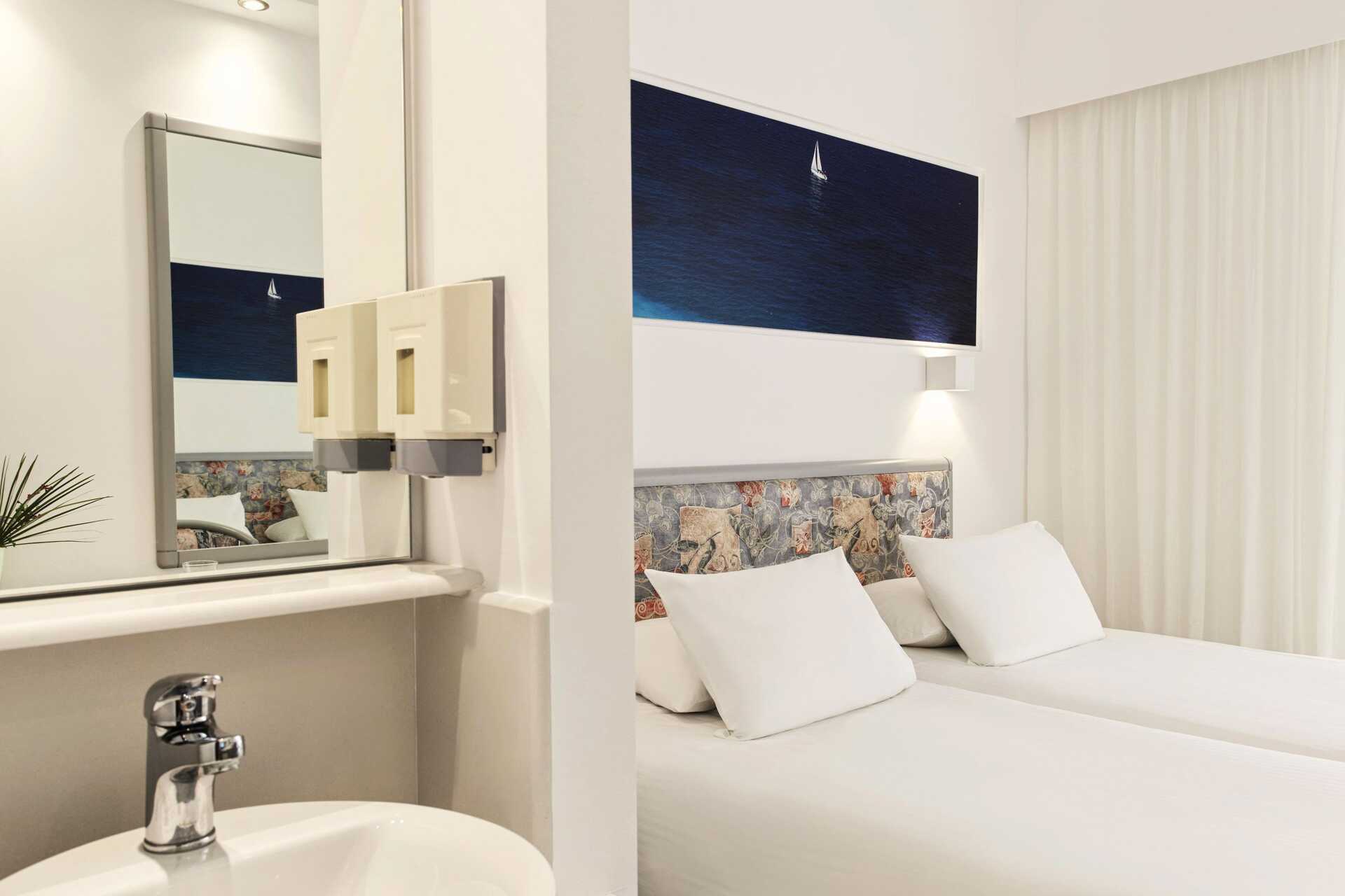 Superiorrum med balkong, vissa med utsikt mot en park. Två enkelsängar. Wifi och deponering ingår. Luftkonditionering ingår i perioden juni till september. Deponering mot avgift. Kylskåp. Tv med internationella kanaler. Hårtork. Badrum med dusch och wc. Städning 7 ggr/vecka.