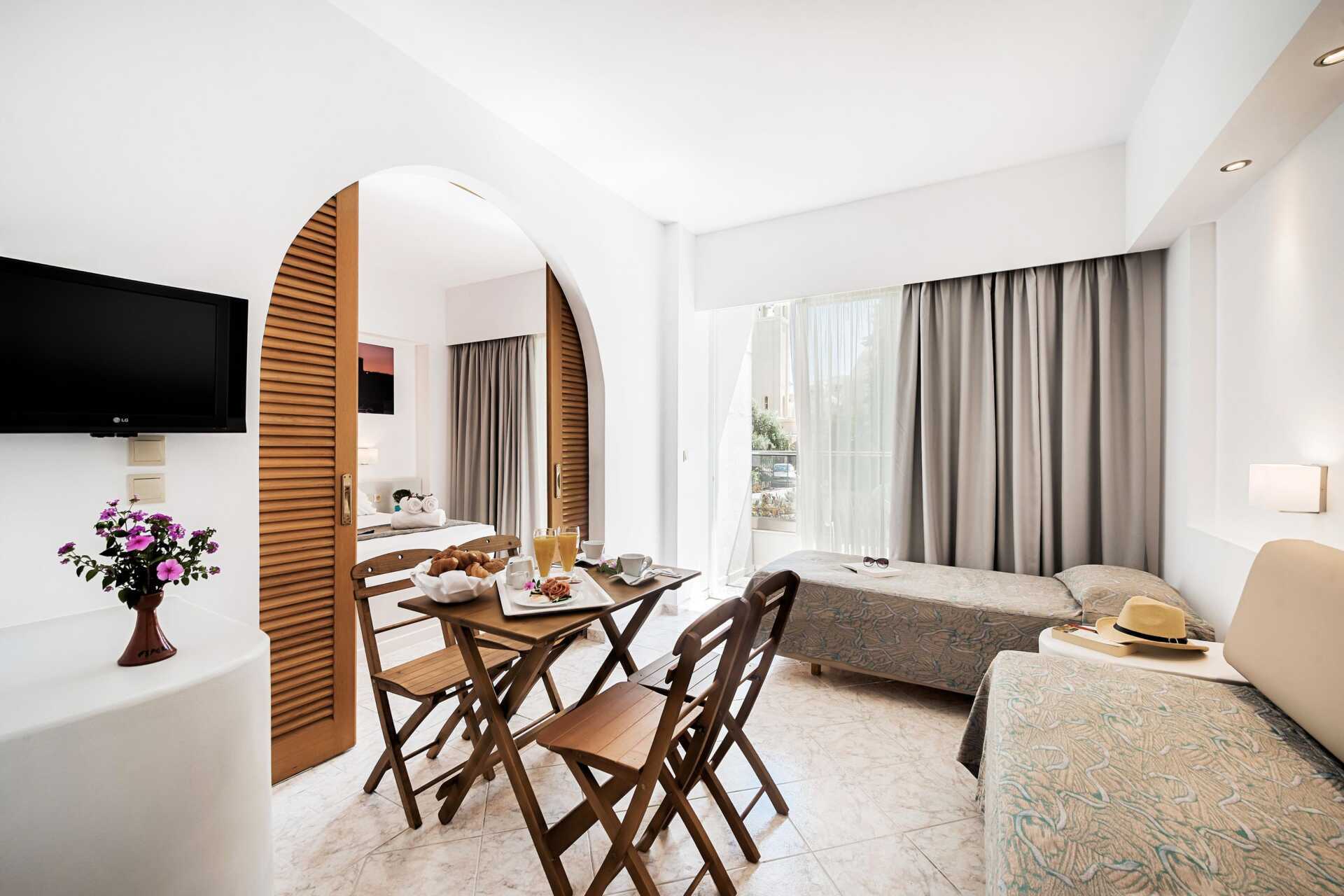 Dubbelrum med balkong. Två enkelsängar. Möjlighet till extrabädd i enkelsäng. Wifi och deponering ingår. Luftkonditionering ingår i perioden juni till september. Kylskåp. Tv med internationella kanaler. Hårtork. Badrum med dusch och wc. Städning 7 ggr/vecka.